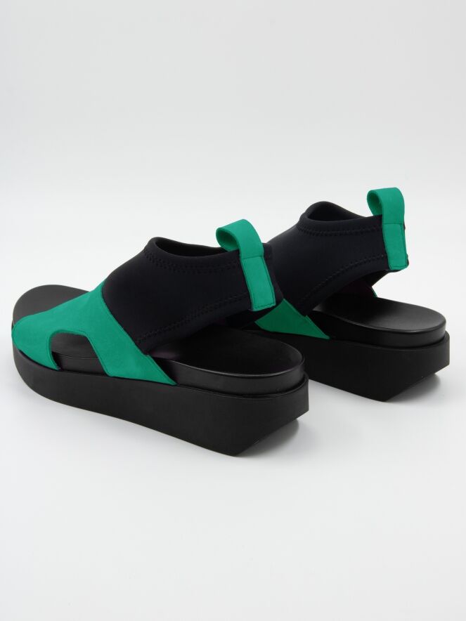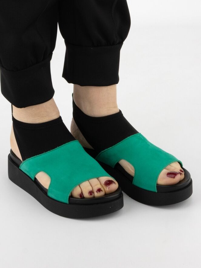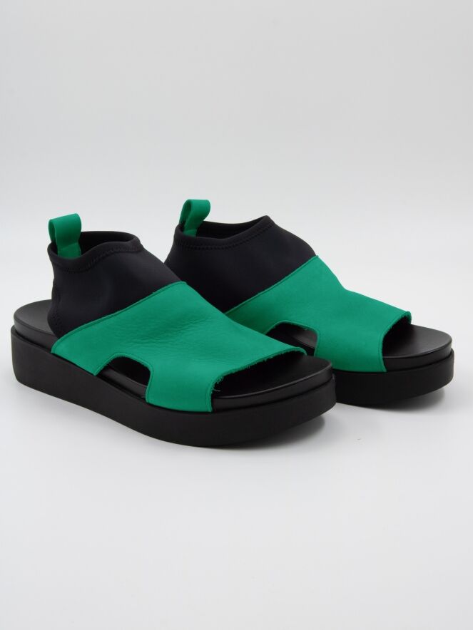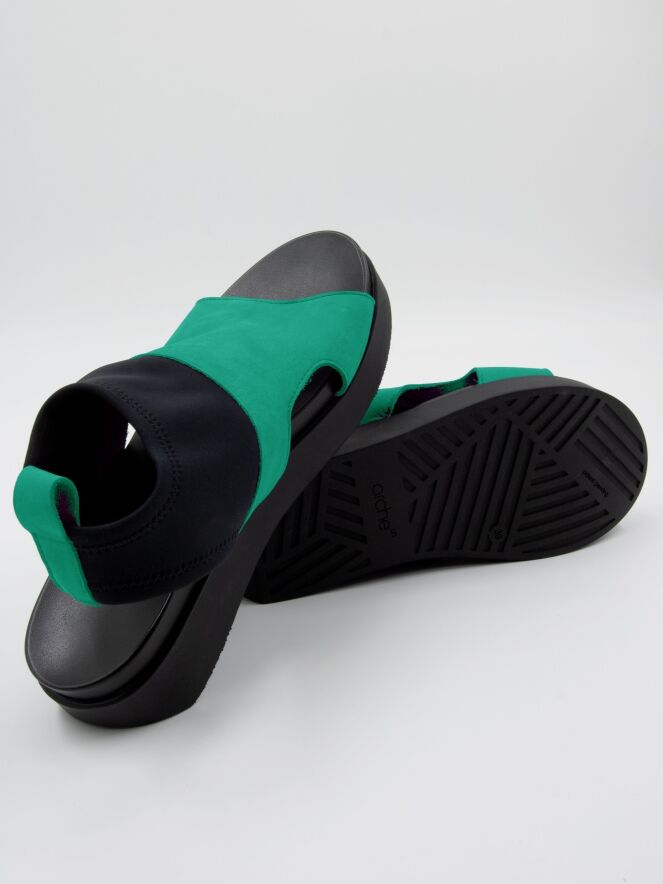 Een sandaal van Arche op een plateauzool in de kleur turquoise. vanaf de bovenkant van de voorvoet tot aan de enkel is een zwarte elastieken stof.