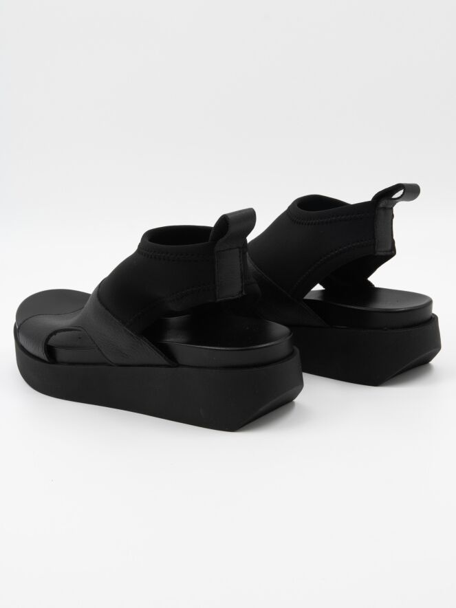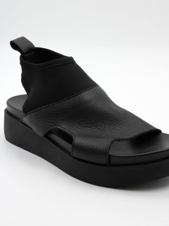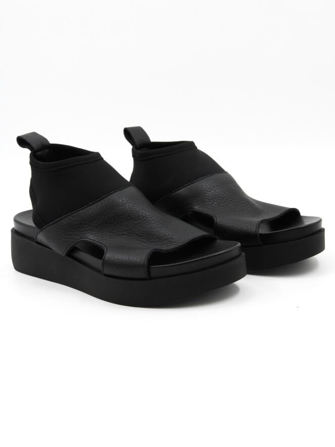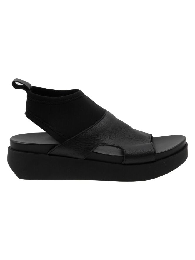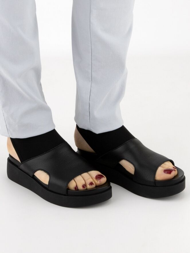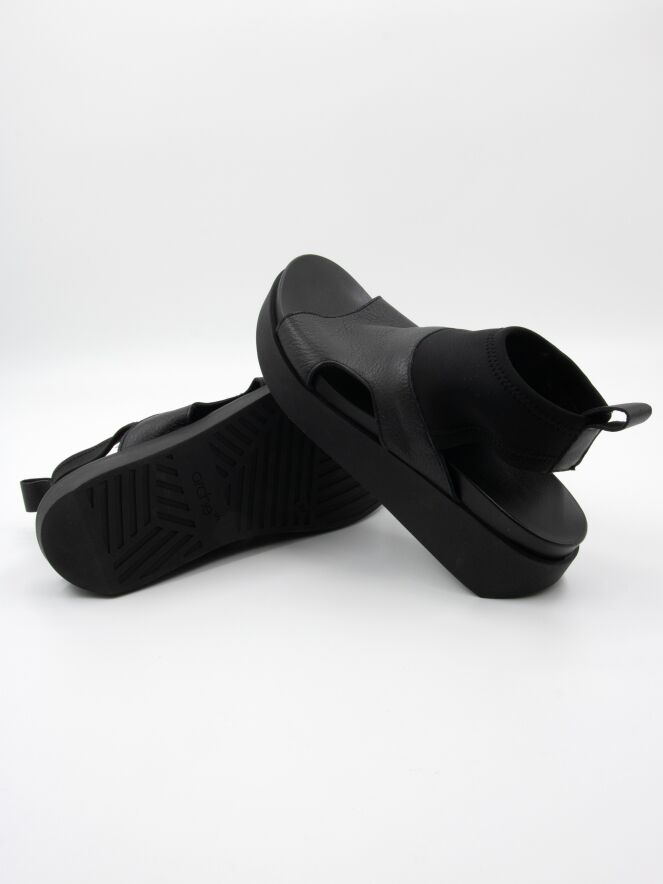 Een sandaal van Arche op een plateauzool in de kleur zwart. vanaf de bovenkant van de voorvoet tot aan de enkel is een zwarte elastieken stof.