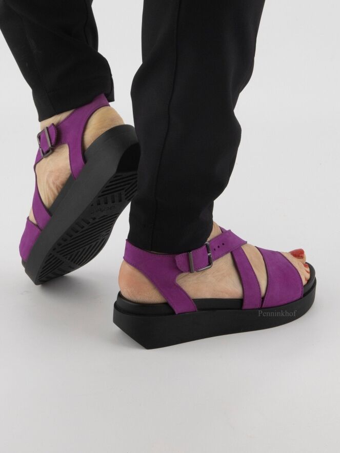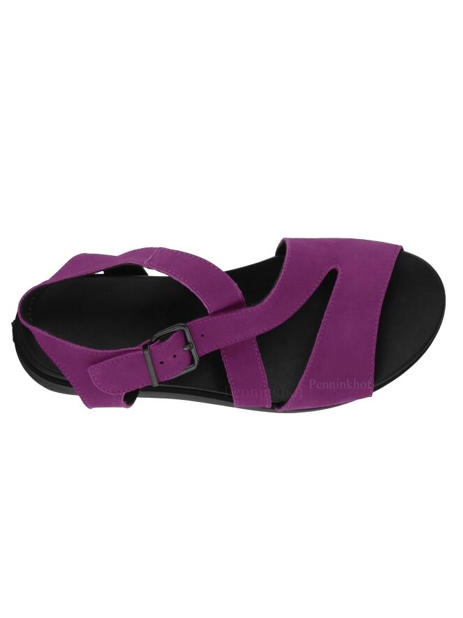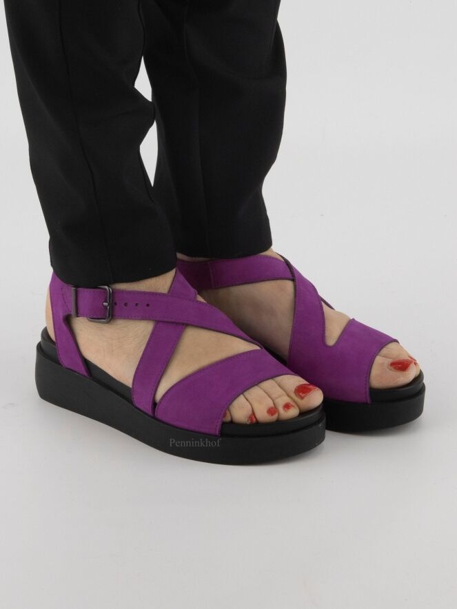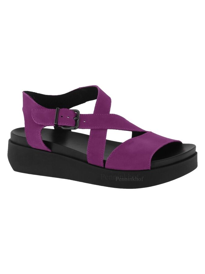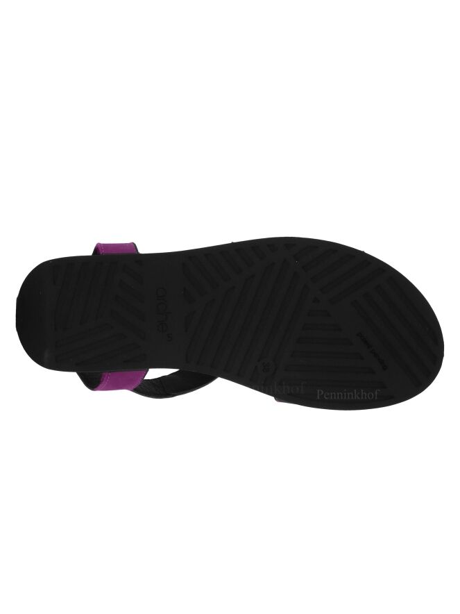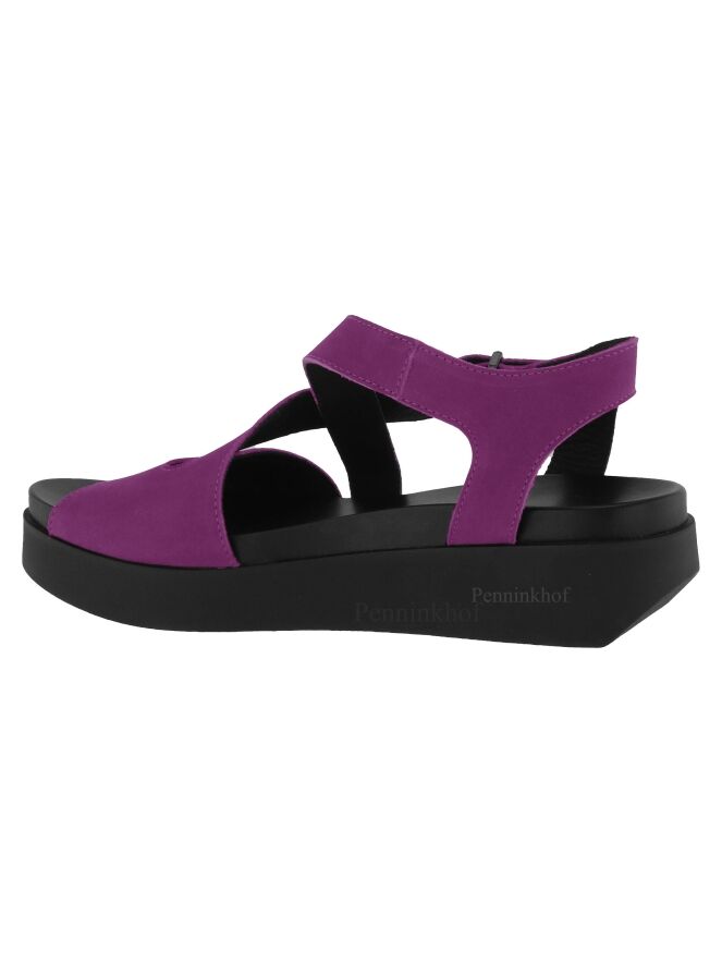 Een sandaal van Arche in een heldere kleur fuchsia. Over de voorvoet zijn 2 nubuck biezen. Vanuit de voorvoet is ook een bies die diagonaal over de wreef naar de buitenzijde loopt. Het hielbandje is verstelbaar.