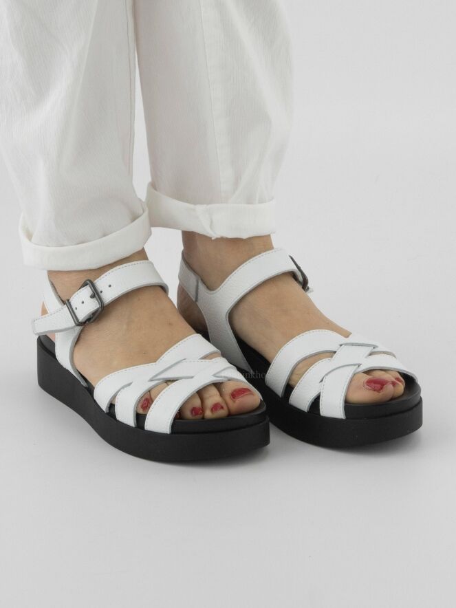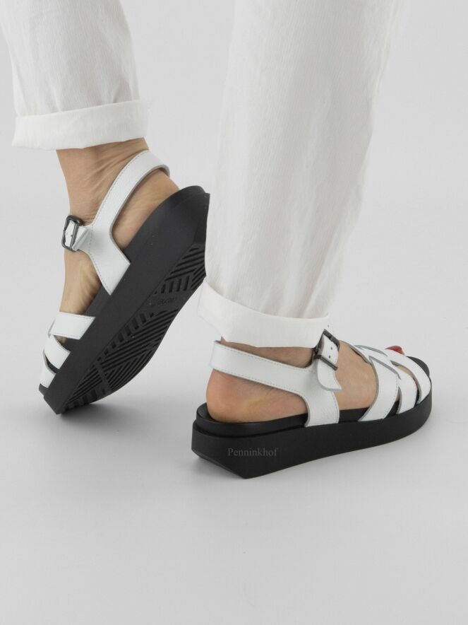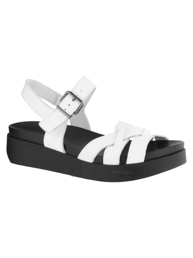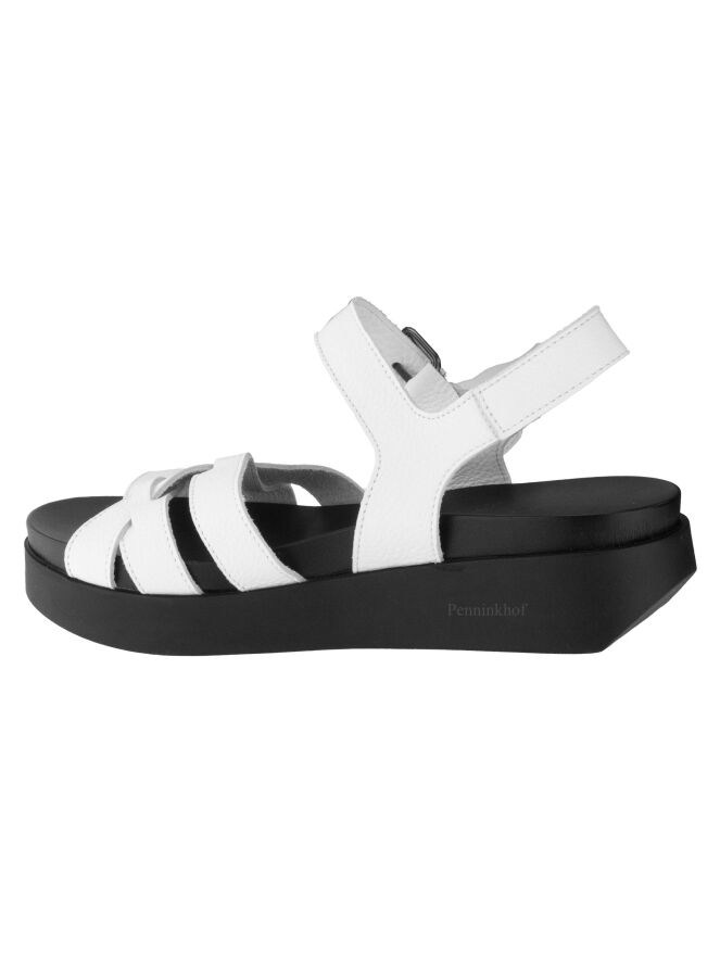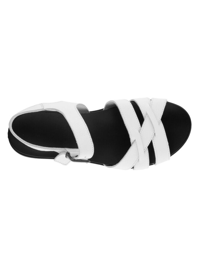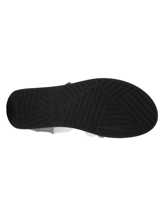 Een slipper van Arche in de kleur wit. Op de latex plateauzool is een zacht voetbed geplaatst. Het zachte leder is met 3 gekruiste banden over de voorvoet. Over de wreef is een verstelbare gesp.