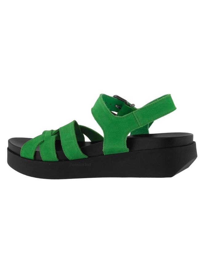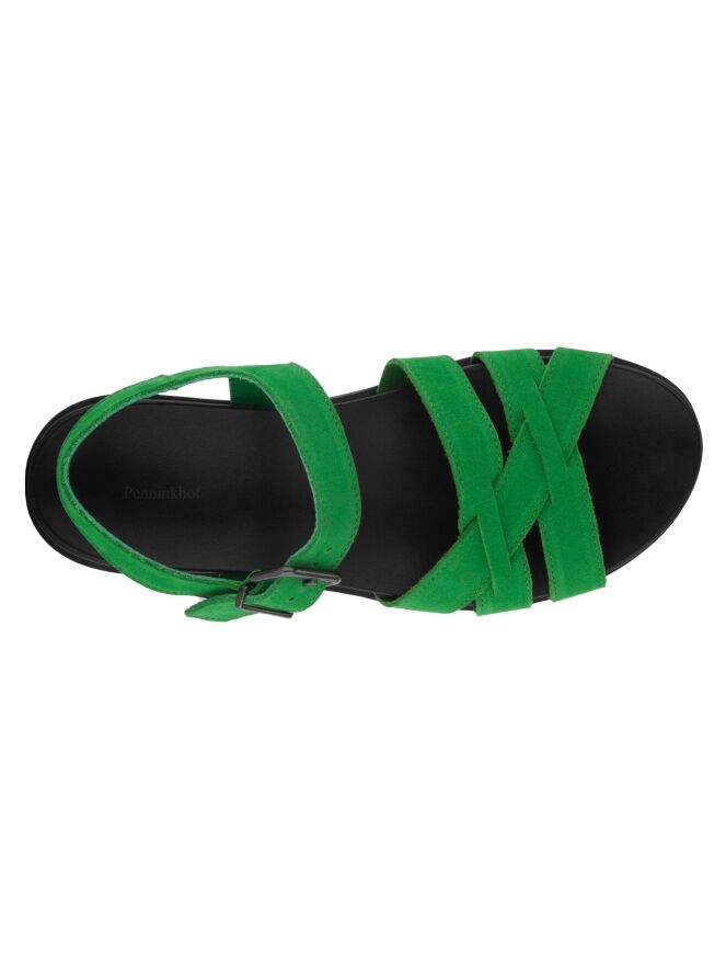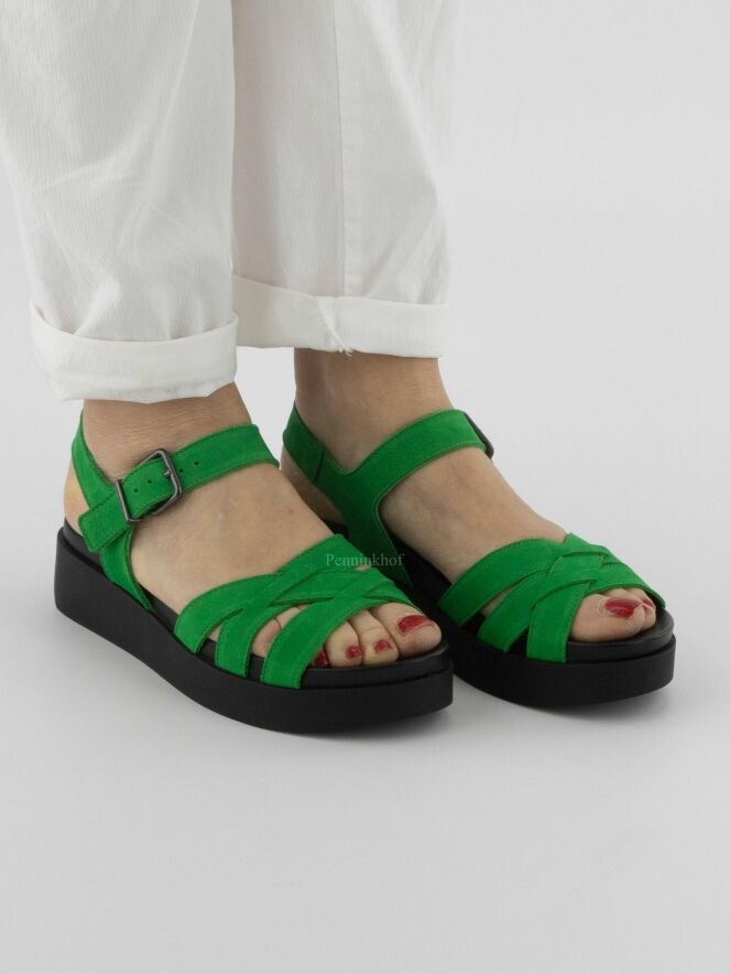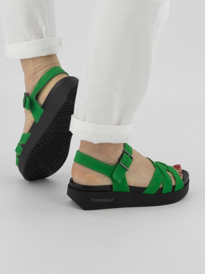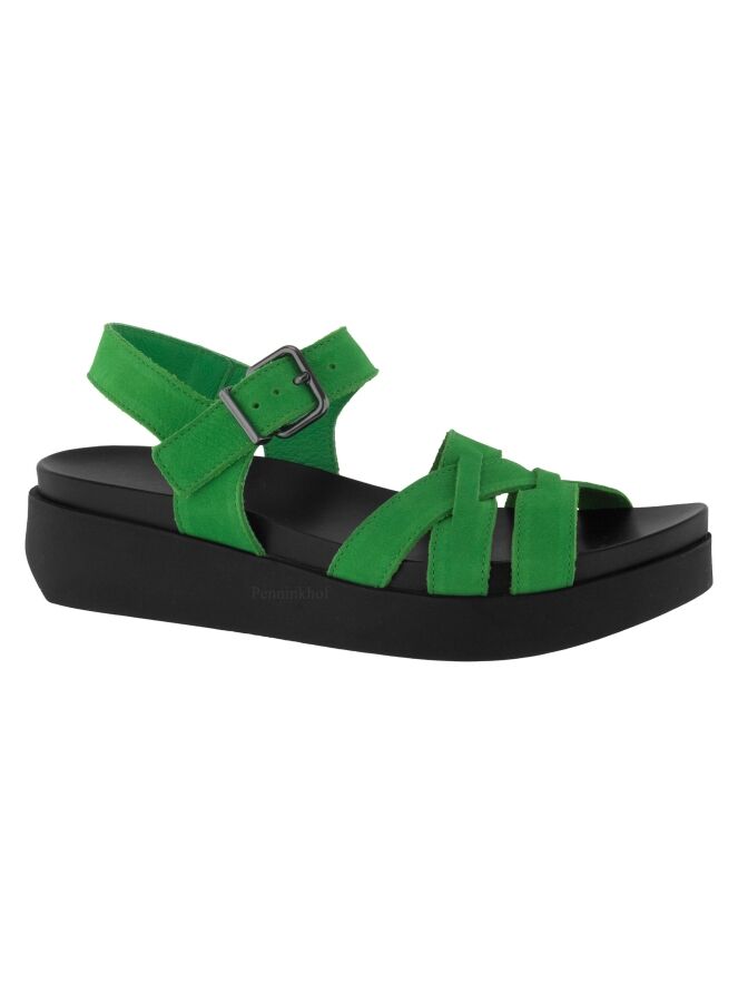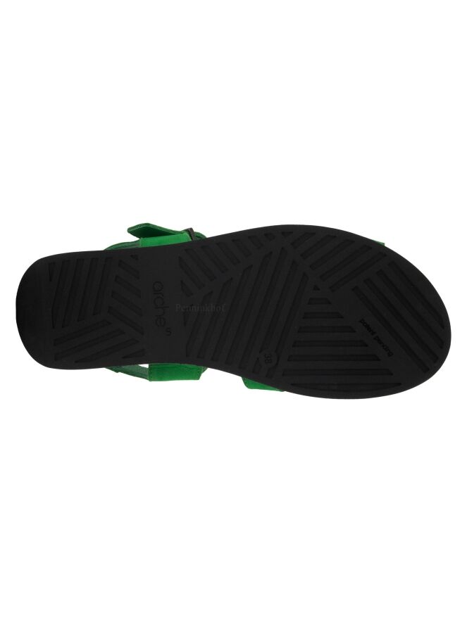 Een slipper van Arche in de kleur groen. Op de latex plateauzool is een zacht voetbed geplaatst. Het zachte leder is met 3 gekruiste banden over de voorvoet. Over de wreef is een verstelbare gesp.