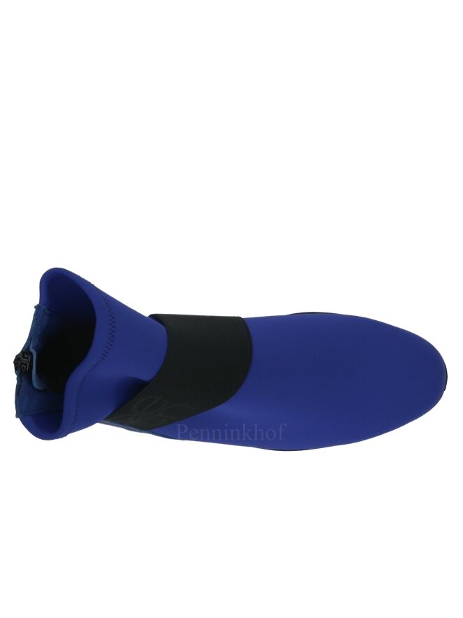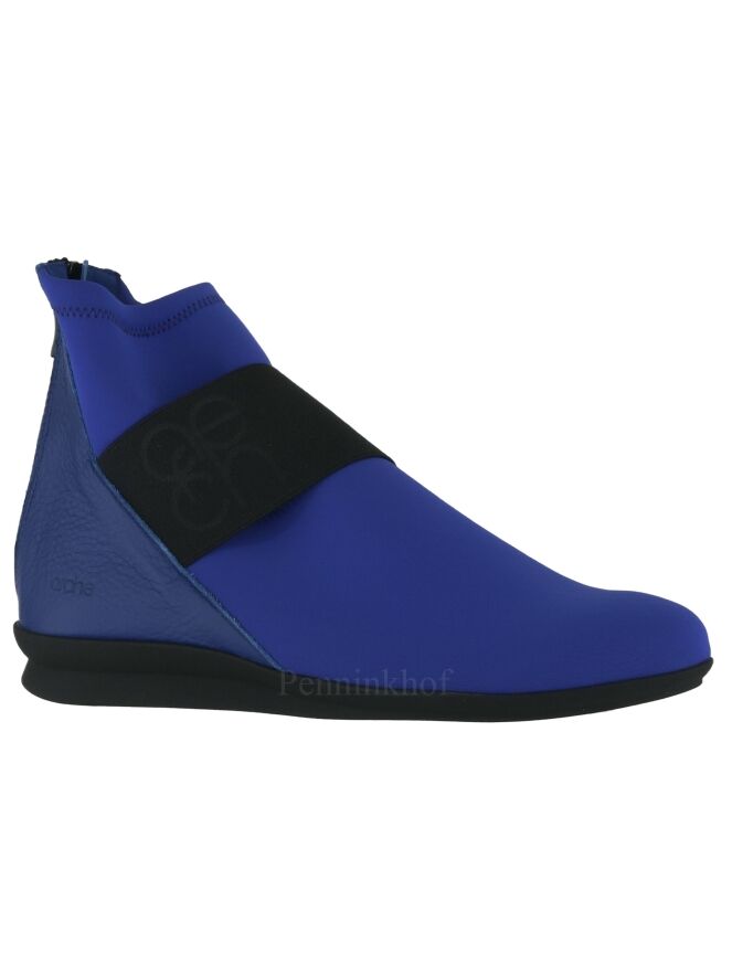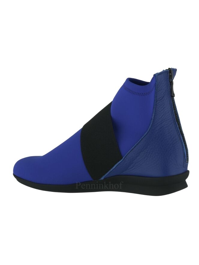 Een kort laarsje van Arche in de kleur kobaltblauw. Over de voorvoet is een brede zwarte band. De hiel is van leder en in het midden van de hiel is een ritsje.