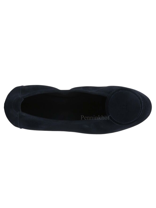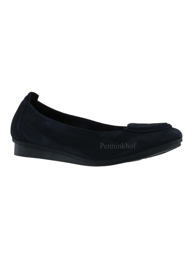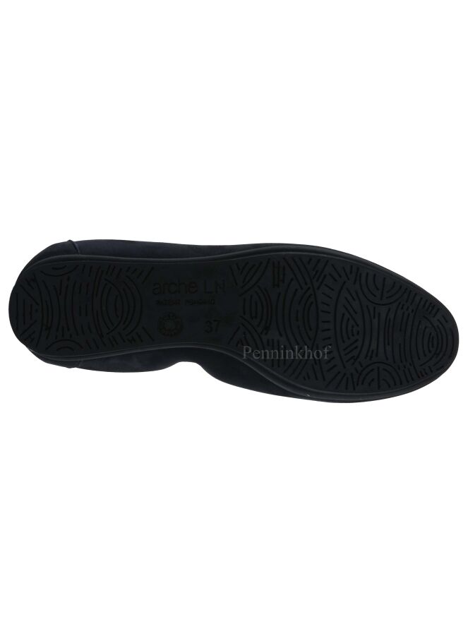 Een ballerina van Arche in de kleur marineblauw. Op de voorvoet is rond gesneden leder in dezelfde kleur wit in de lagen. De binnenkant van de ballerina is ongevoerd.