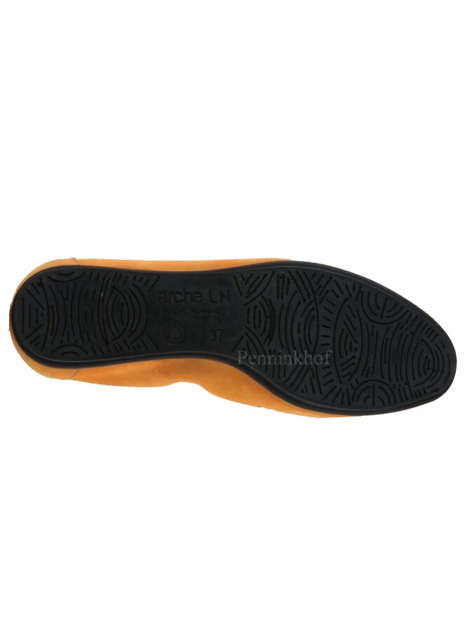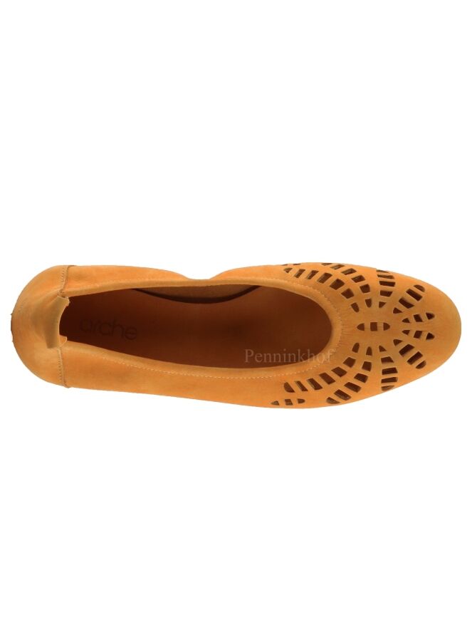 Een ballerina van Arche in de kleur oranje. De voorvoet is geperforeerd in een bloemvorm. De zool is in een zwarte kleur. De binnenkant van de ballerina is ongevoerd.
