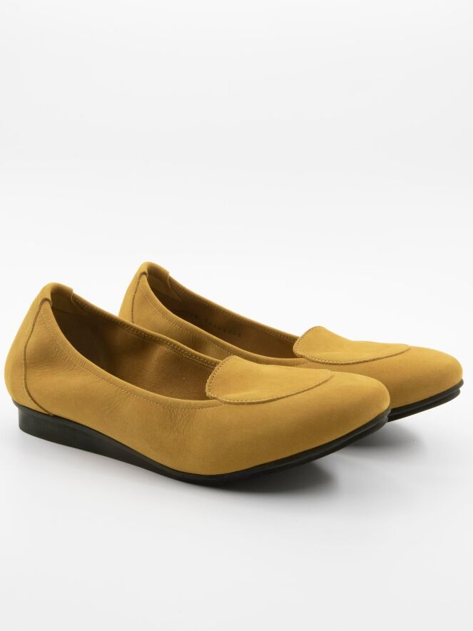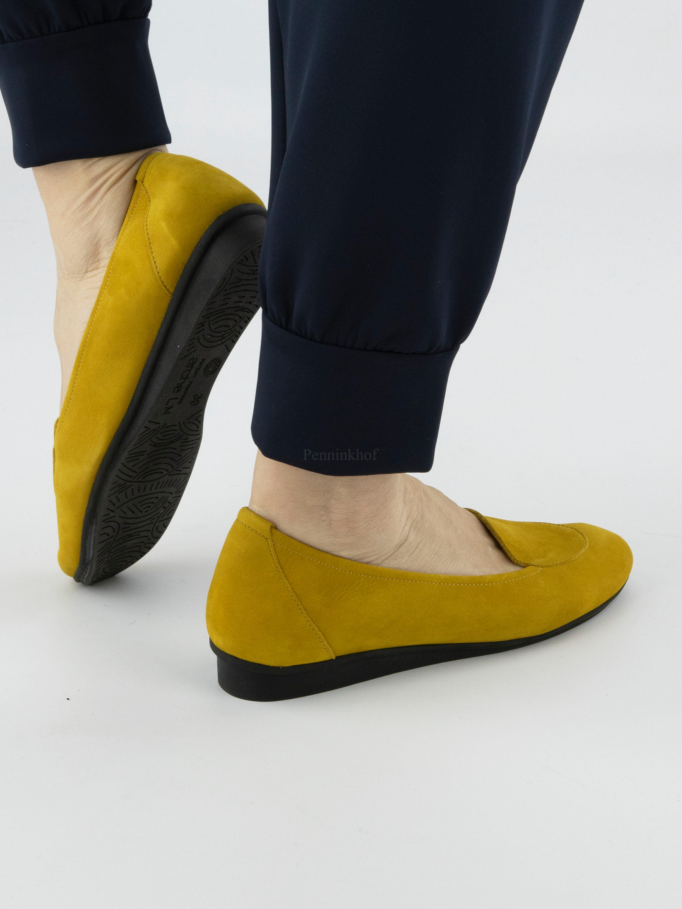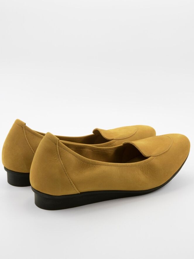 Een instapper in de kleur okergeel met een verhoogde zool bij de hiel. De binnenkant is ongevoerd.