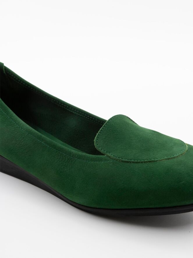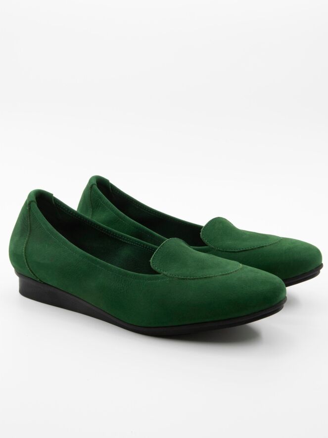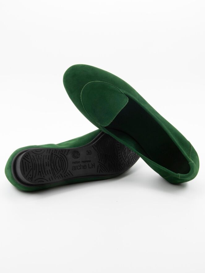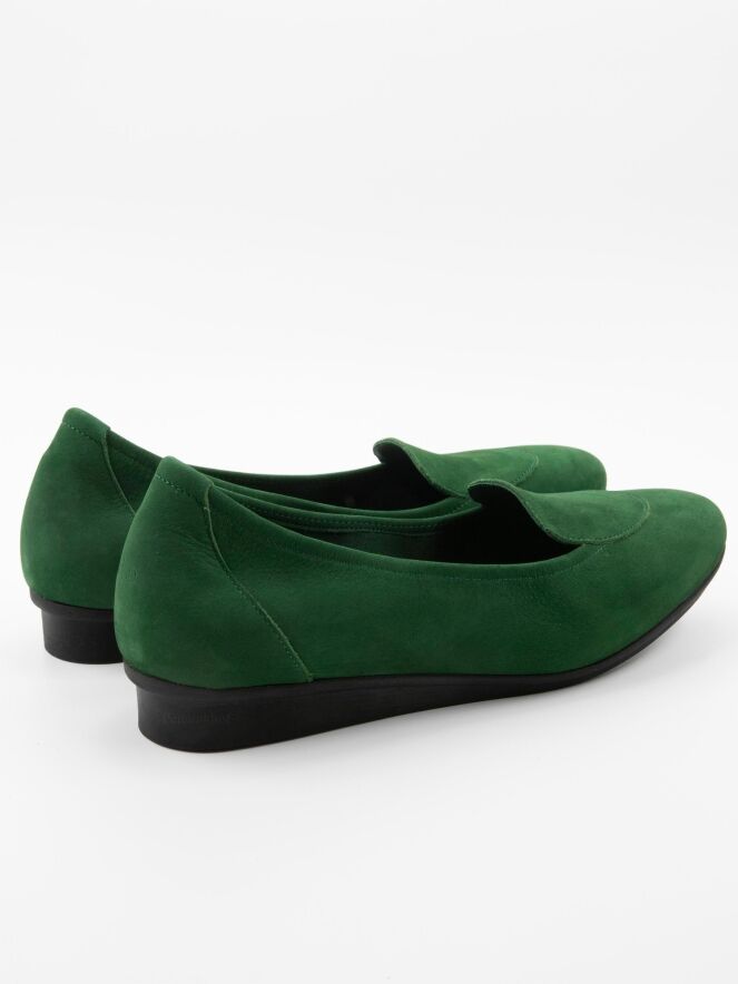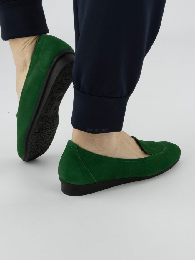 Een instapper in de kleur groen met een verhoogde zool bij de hiel. De binnenkant is ongevoerd.