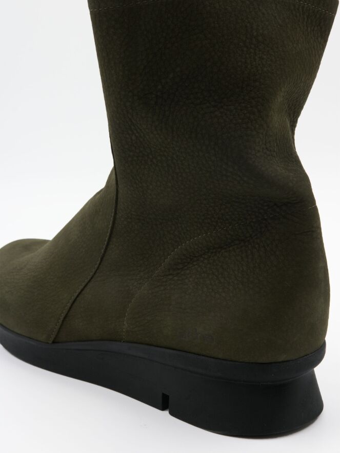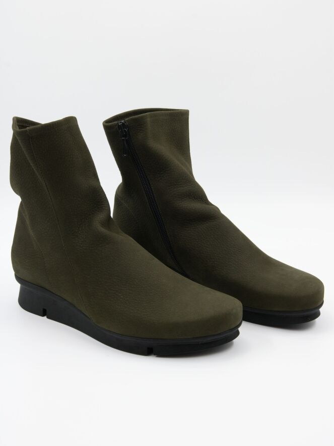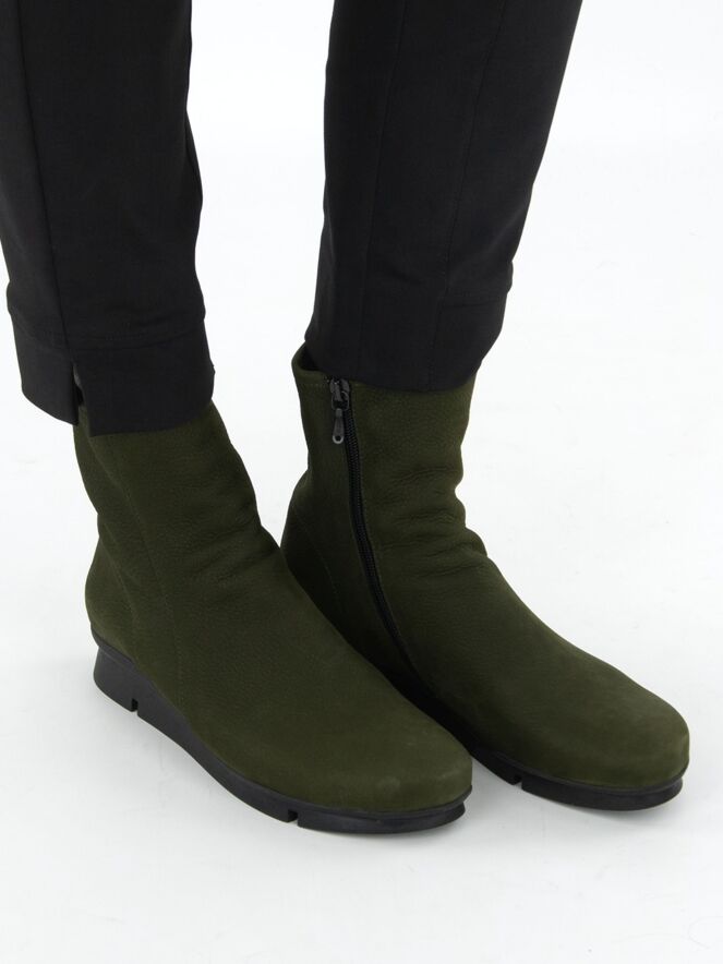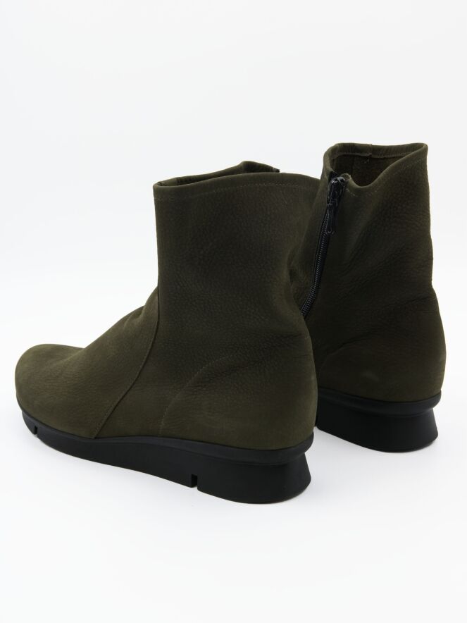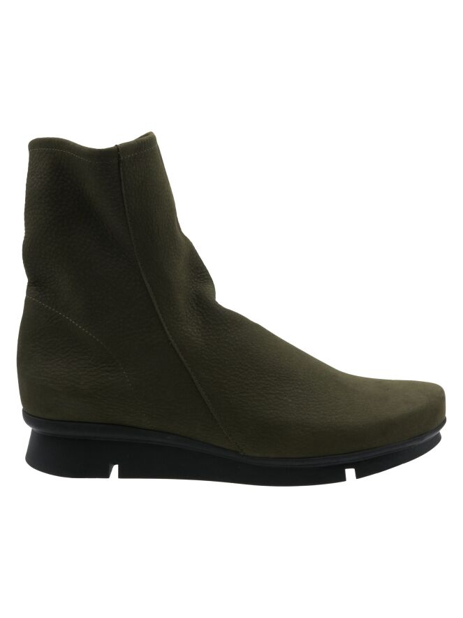 Een enkellaarsje van Arche in de kleur khaki. Het laarsje heeft een iets verhoogde sportieve latex zool in de kleur zwart. Aan de binnenzijde is een zwarte rits. Het laarsje heeft een ronde neus en de binnenkant is ongevoerd.