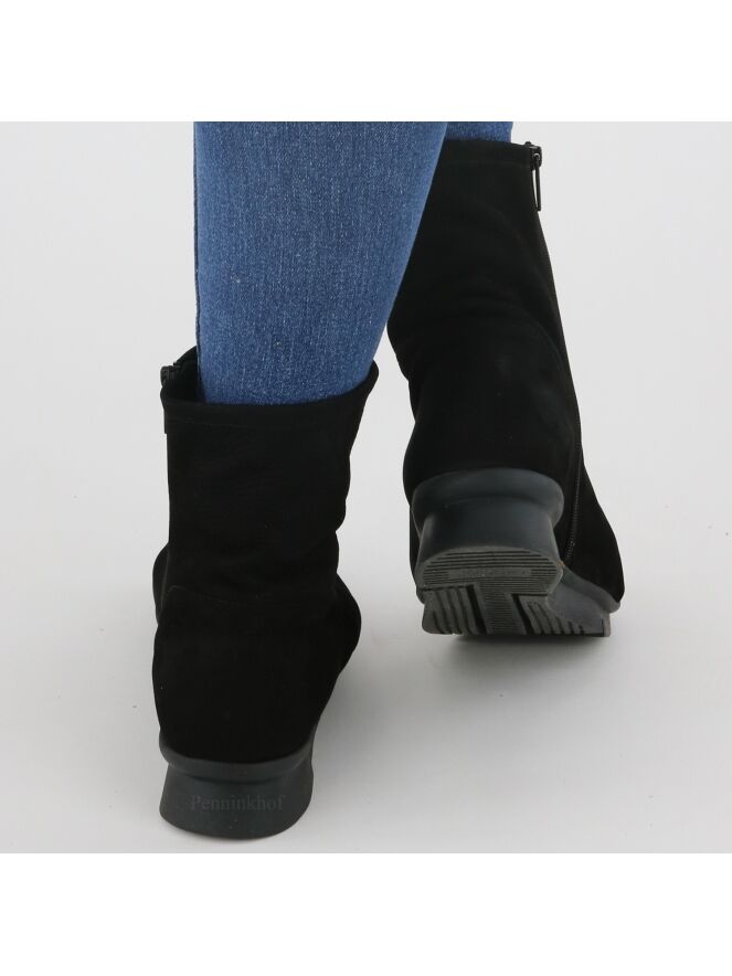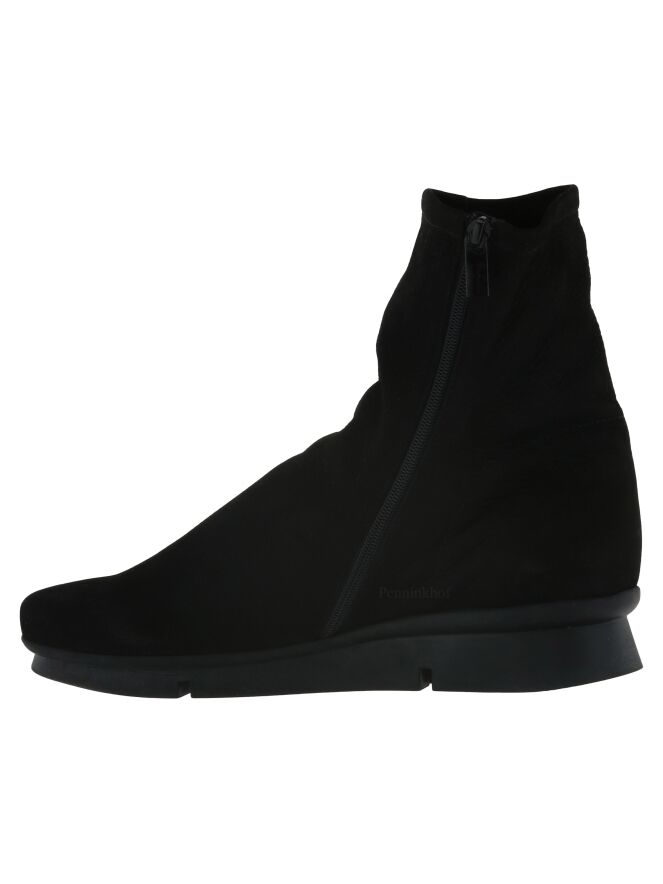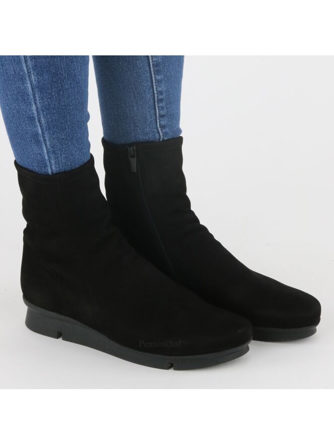 Een enkellaarsje van Arche in de kleur zwart. Het laarsje heeft een iets verhoogde sportieve latex zool in de kleur zwart. Aan de binnenzijde is een zwarte rits. Het laarsje heeft een ronde neus en de binnenkant is ongevoerd.