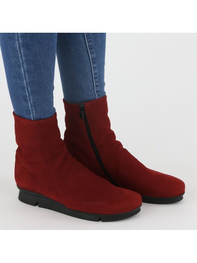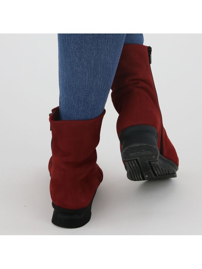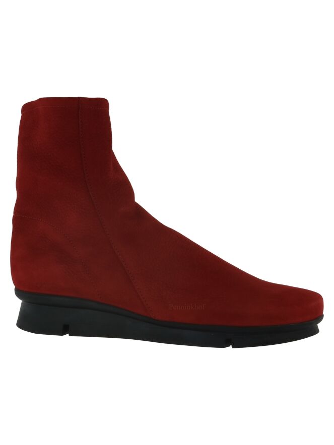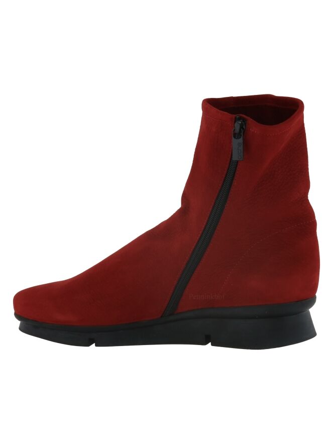 Een enkellaarsje van Arche in de kleur rood. Het laarsje heeft een iets verhoogde sportieve latex zool in de kleur zwart. Aan de binnenzijde is een zwarte rits. Het laarsje heeft een ronde neus en de binnenkant is ongevoerd.
