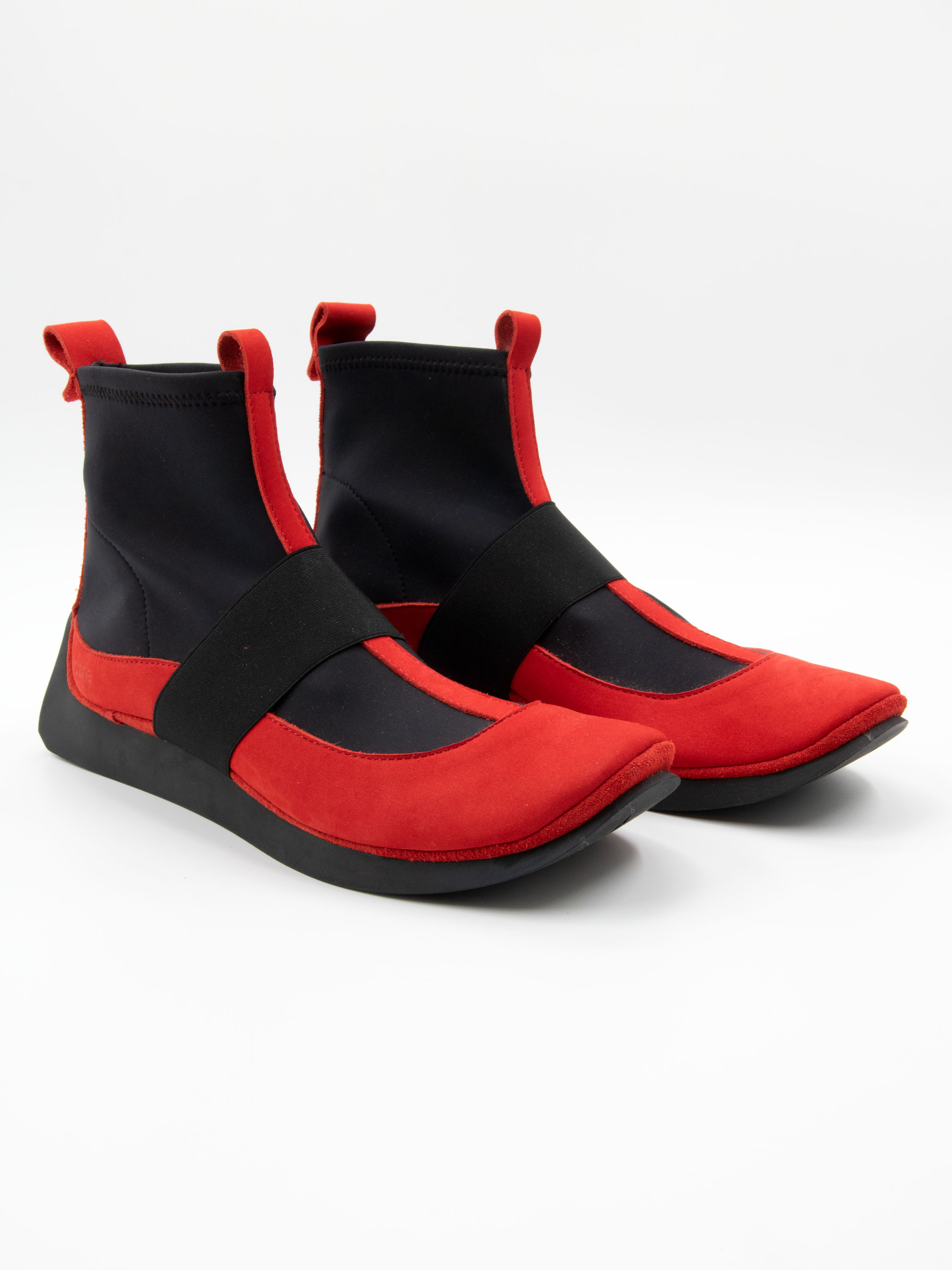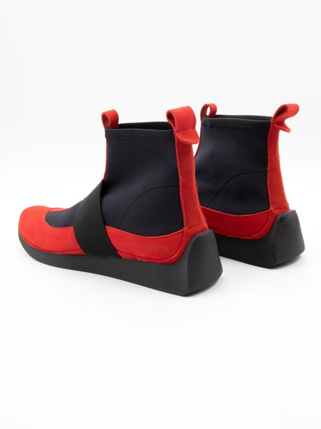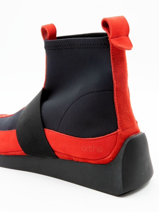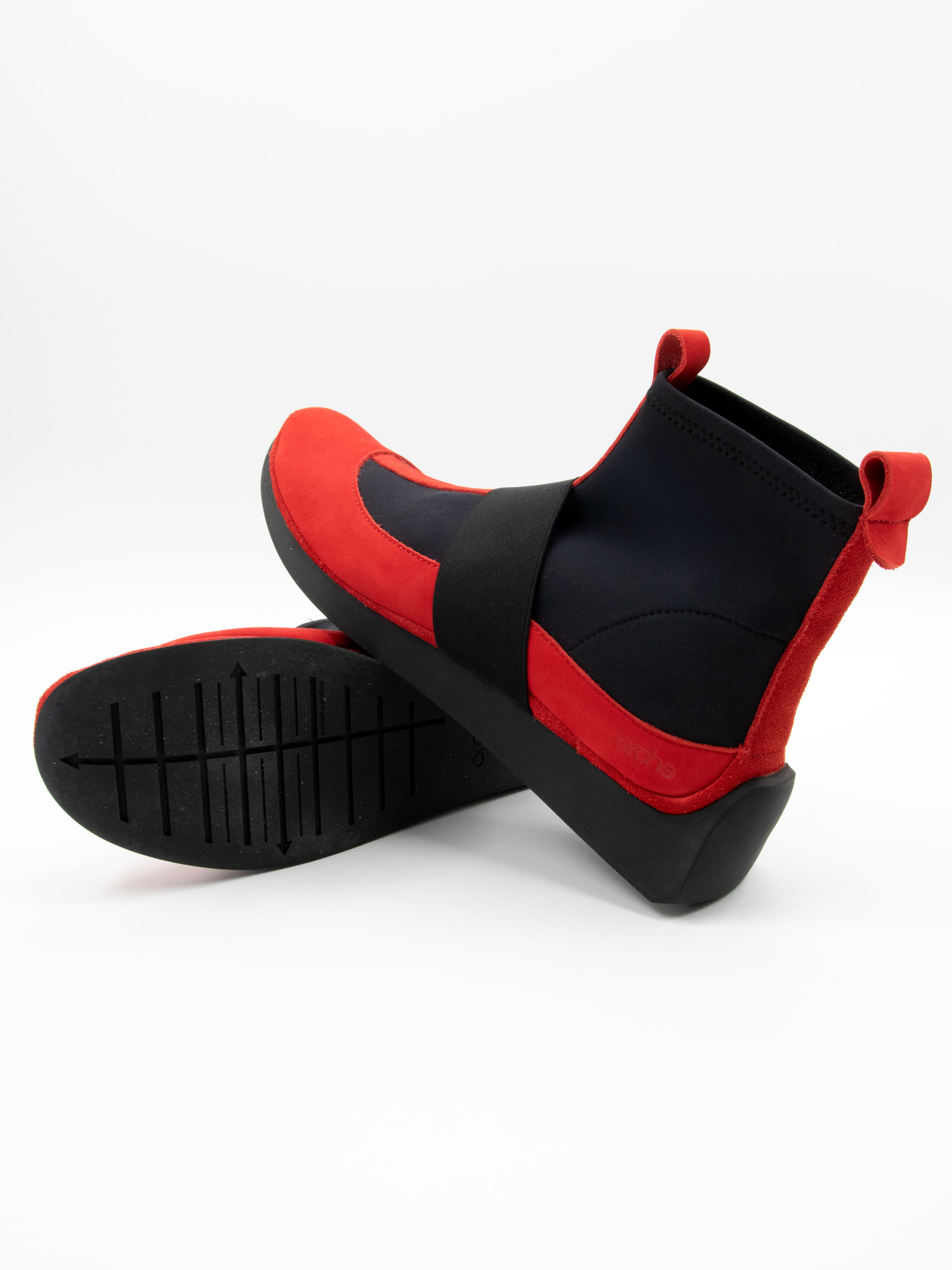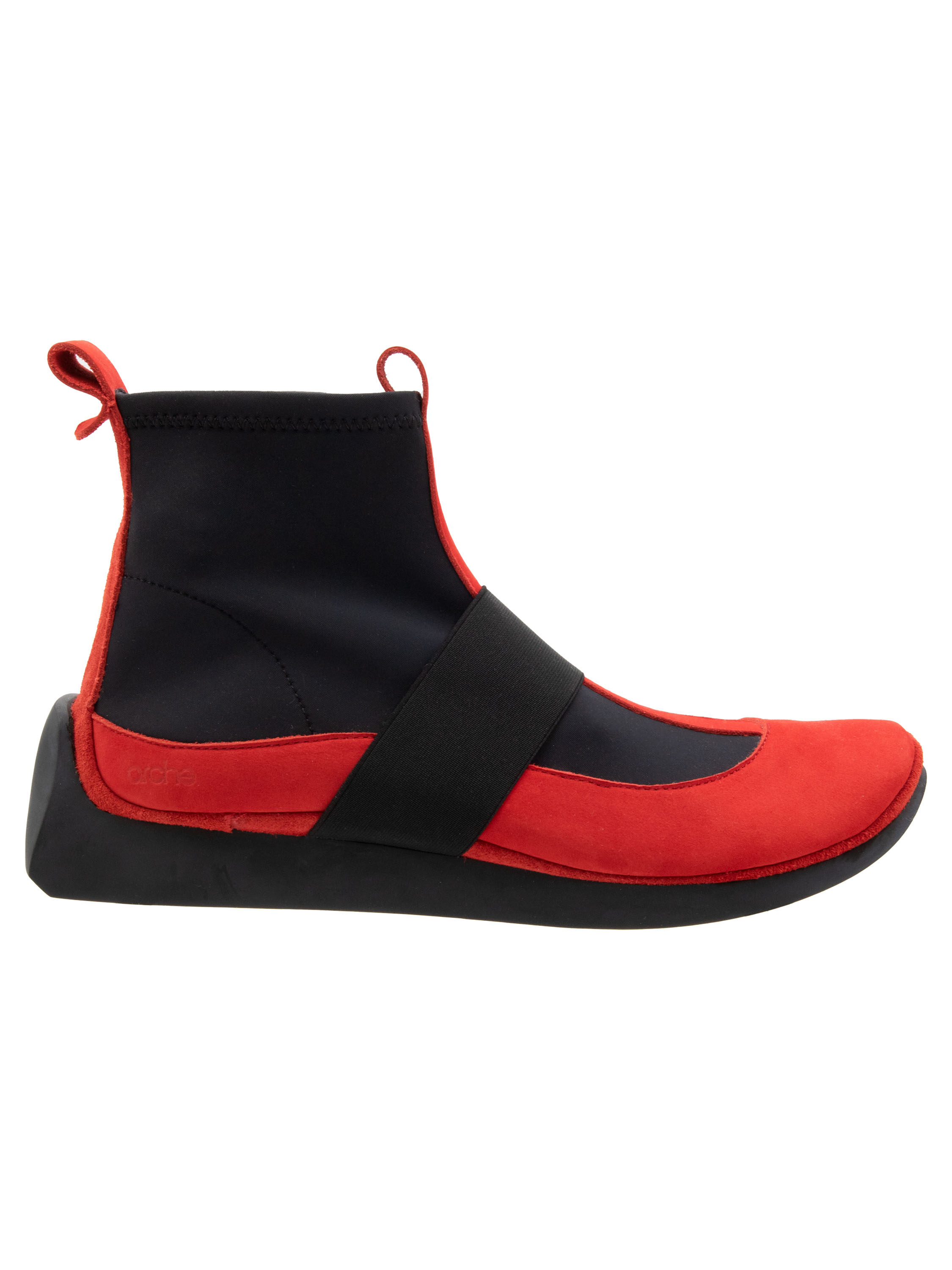 Een kort laarsje van Arche in een volle rode kleur. Vanaf de zijkanten van de voorvoet loopt een zwarte elastische inzet door naar de schacht. Op de hiel bevindt zich een bies in nubuck. Over de voorvoet loopt een brede elastische band. De binnenkant van het laarsje is ongevoerd.