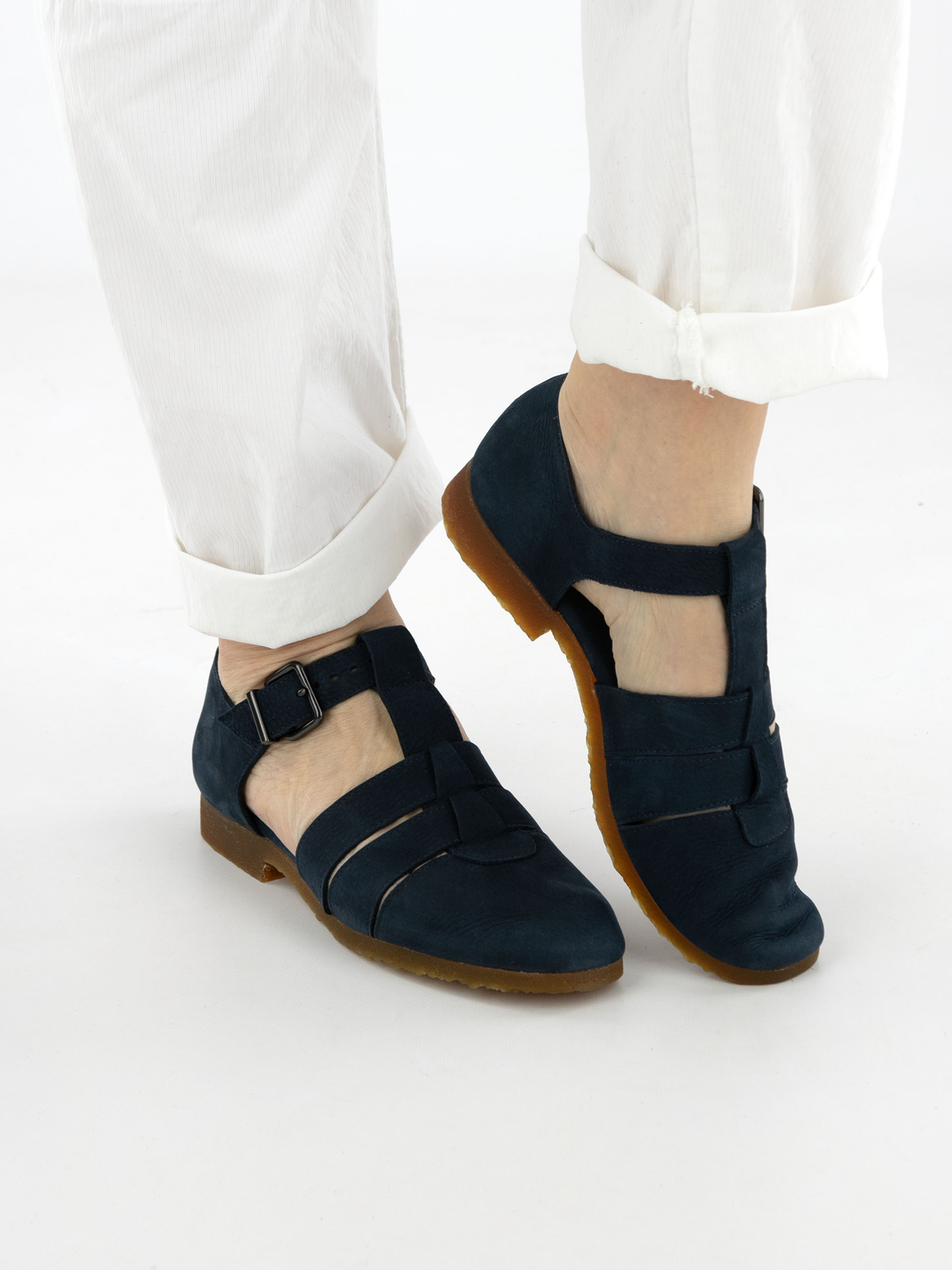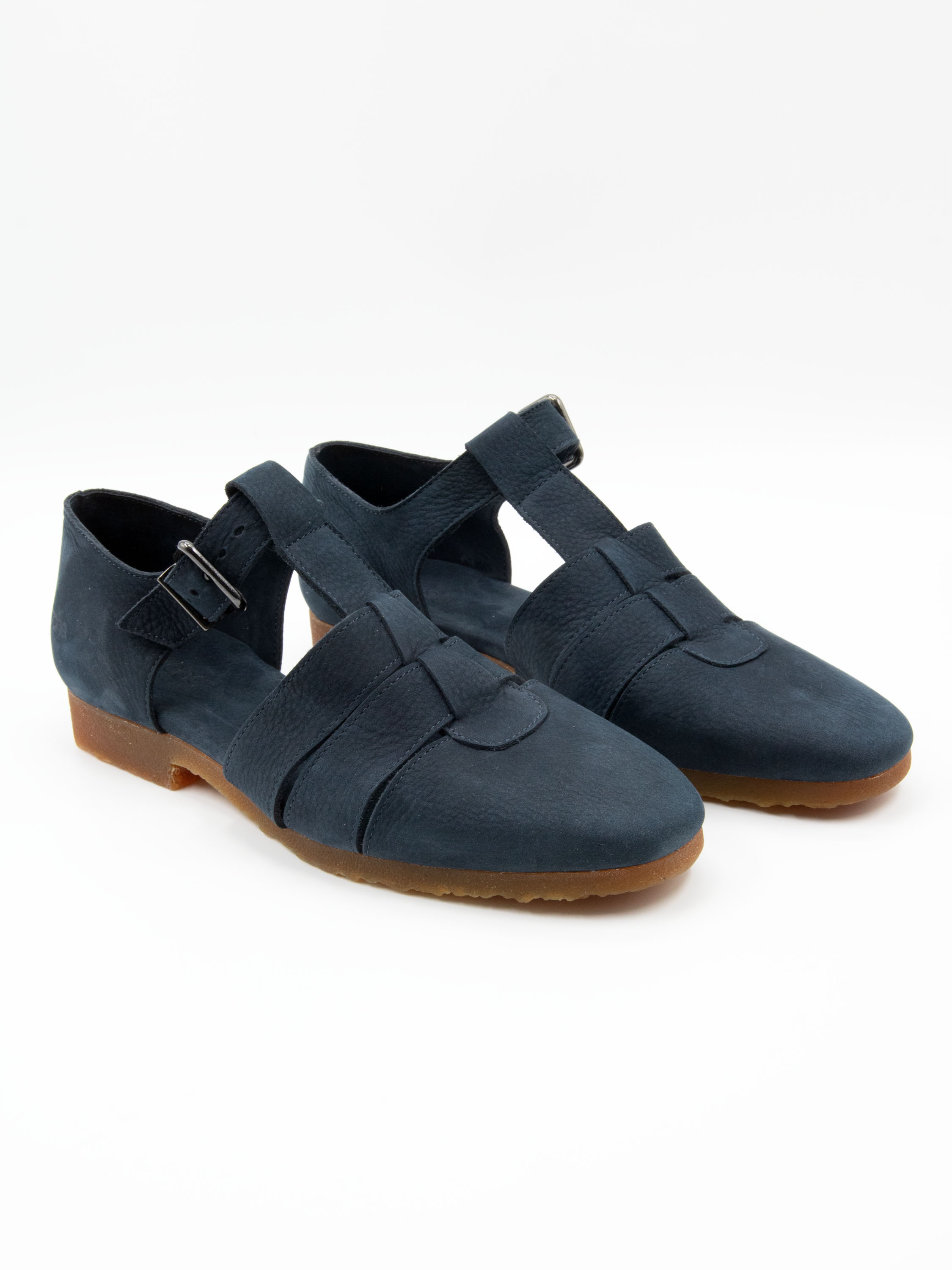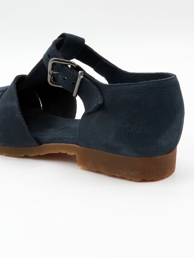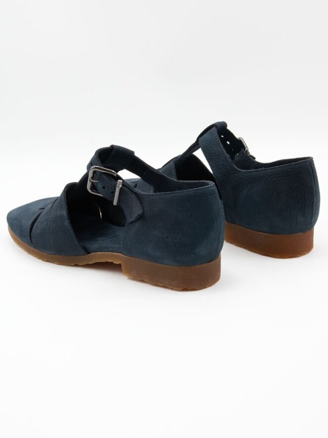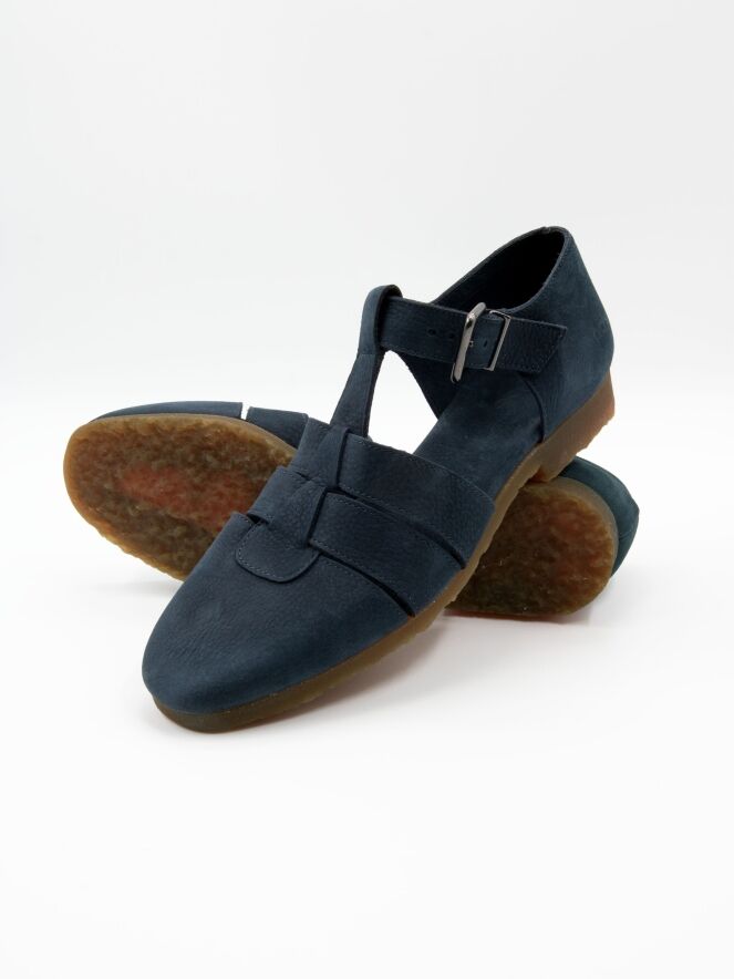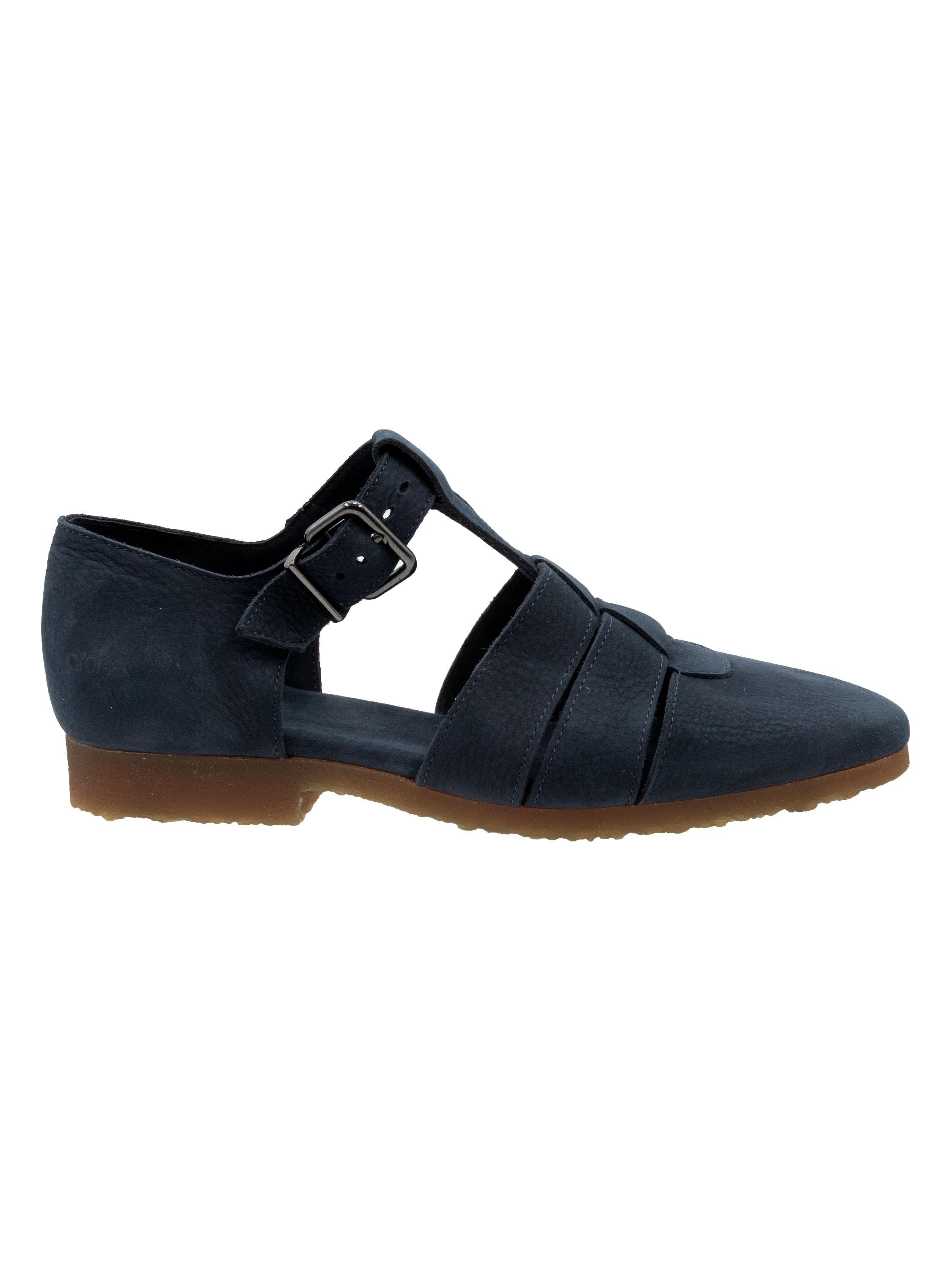 Sandaal van Arche in een elegante marineblauwe tint. De sandaal heeft een gesloten neus en hiel, wat zorgt voor een comfortabele en beschermende pasvorm. De band over de voorvoet is verstelbaar met een gesp, zodat de sandaal perfect kan worden aangepast. De honingkleurige zool vormt een warm contrast en geeft het ontwerp een verfijnde uitstraling.