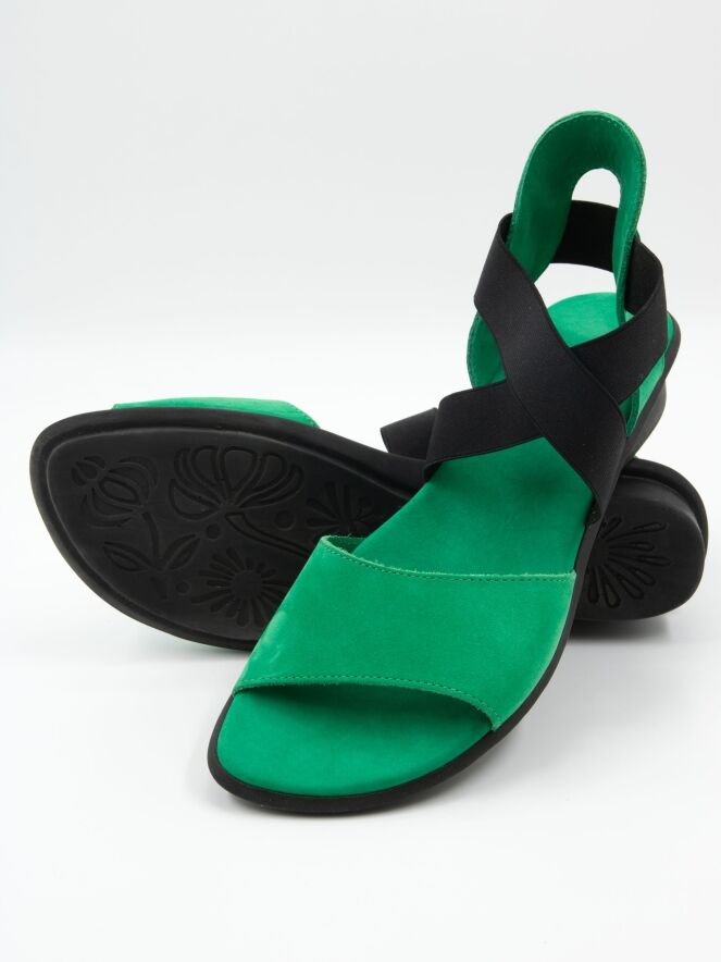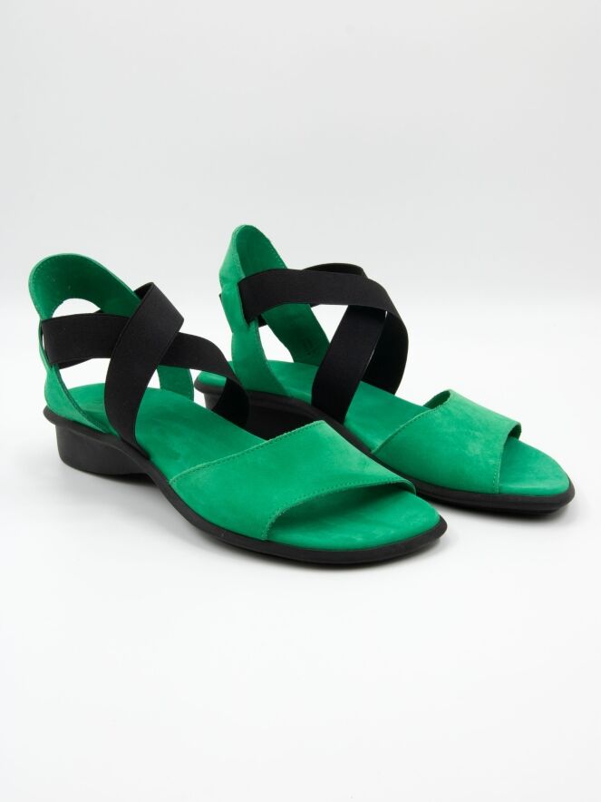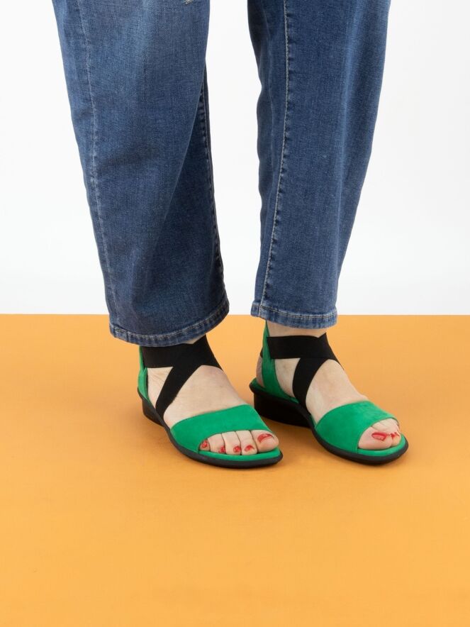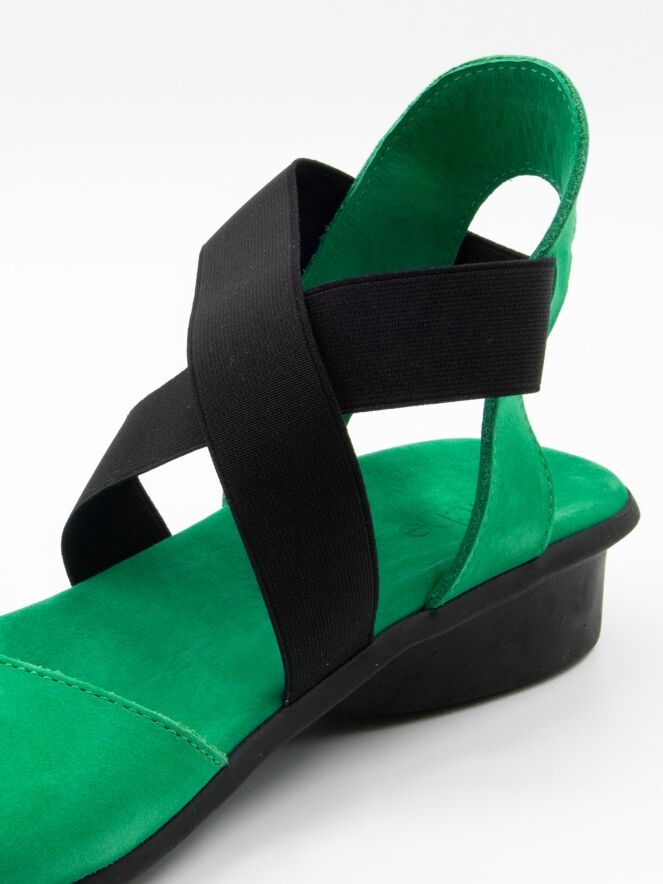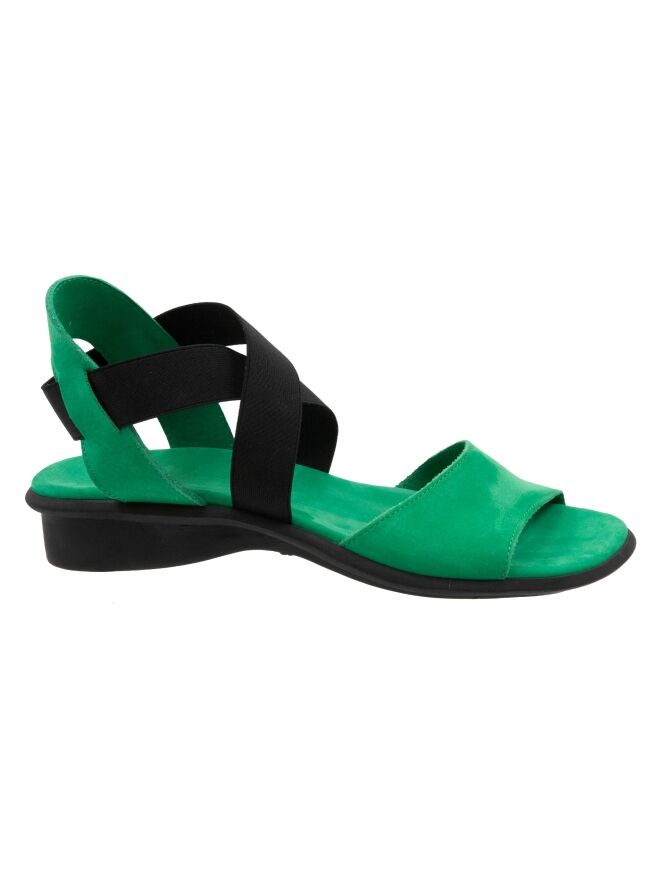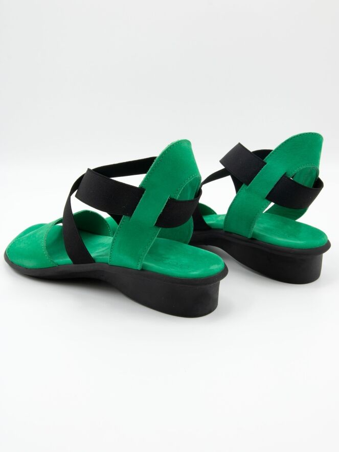 Een open sandaal van Arche in de kleur groen. Over de voorvoet loopt een band. Vanuit de achterkant van de hiel loopt een gekruiste zwarte elastische band naar de zijkanten van de sandaal.
