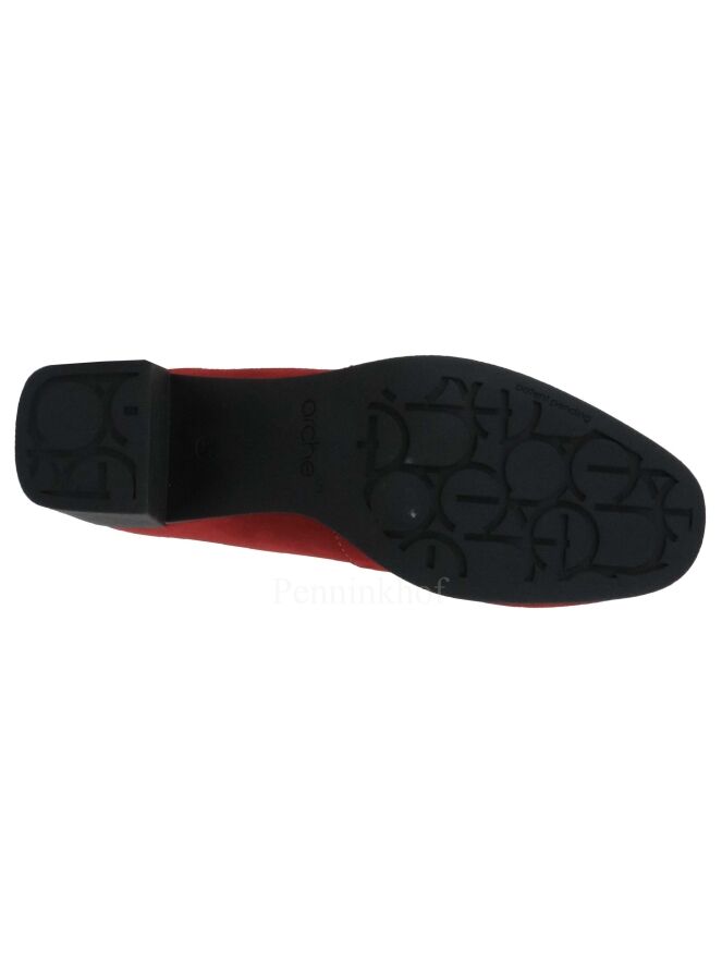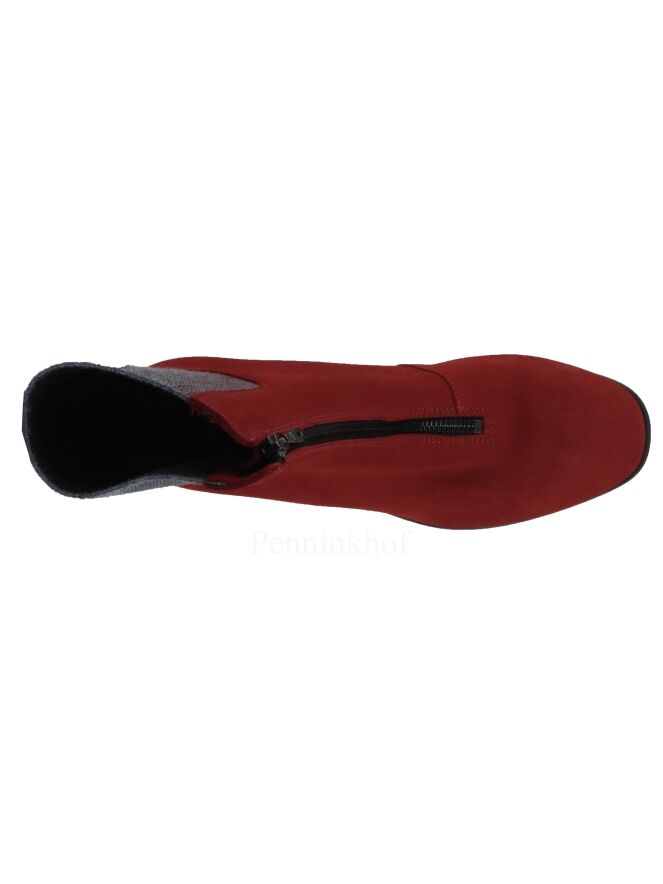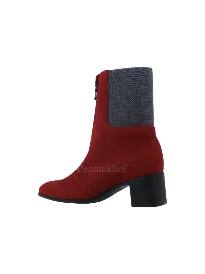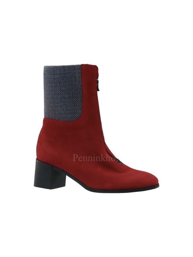 Een enkellaarsje van Arche in de kleur rood. Vanaf de voorvoet tot aan de bovenkant van de schacht is een zwarte rits. De achterzijde van de schacht is in een gemêleerde elastische grijze stof. De binnenkant is ongevoerd.