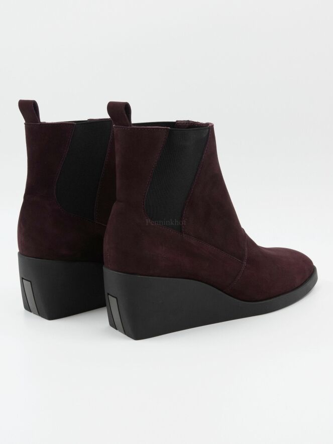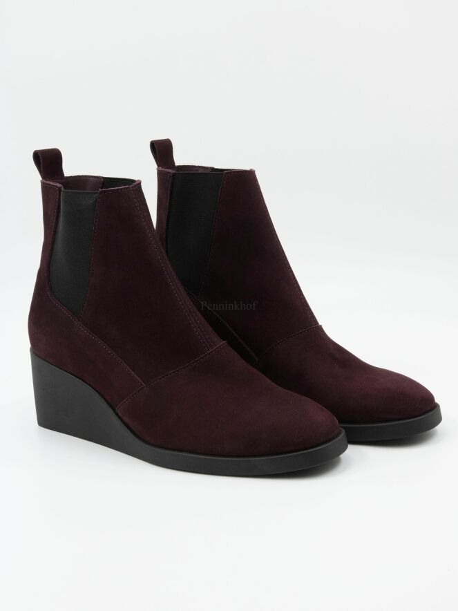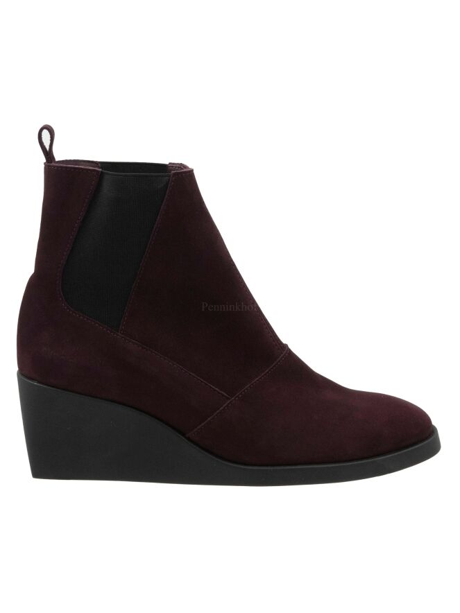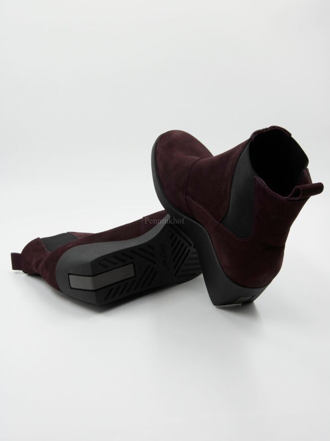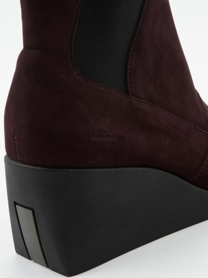 Een kort laarsje van Arche op een sleehak in de kleur bordeauxrood. Het laarsje heeft decoratieve stiknaden en aan de zijkanten van de schacht zijn elastische stukken ingezet. De binnenkant is ongevoerd.