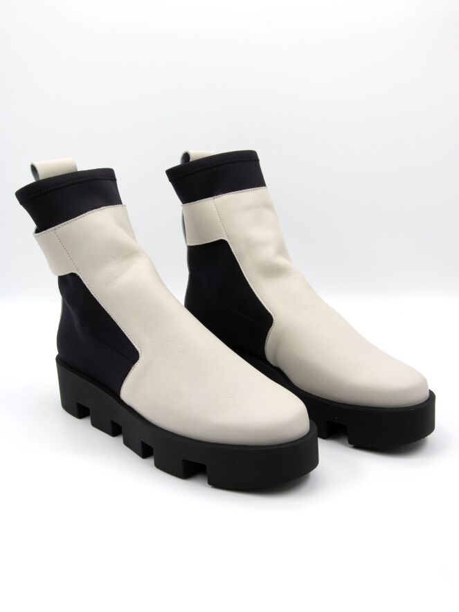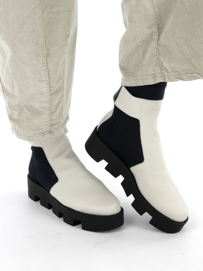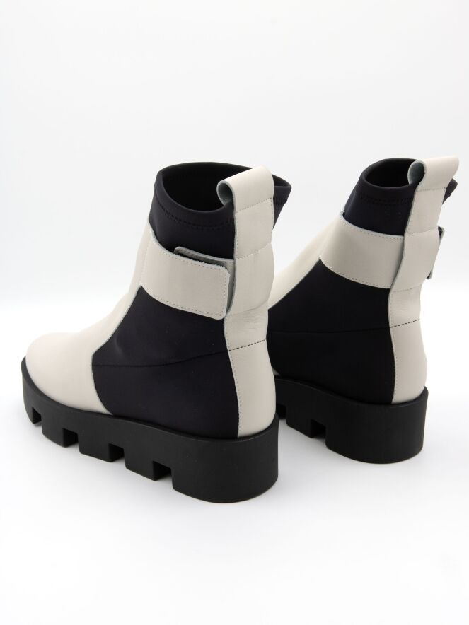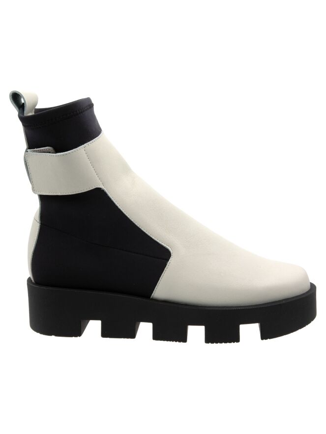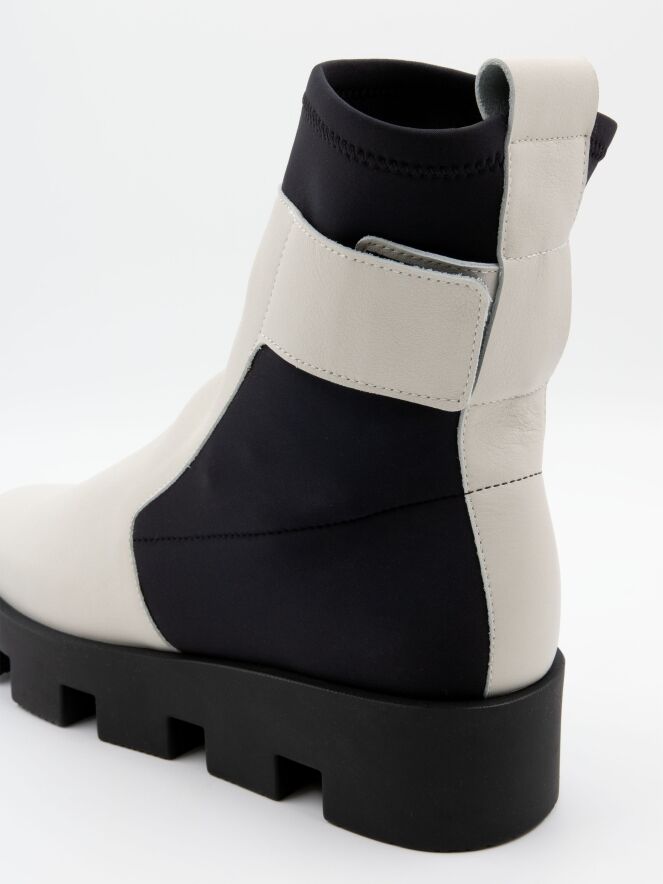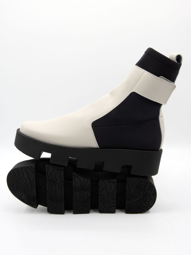 Een enkellaarsje van Arche in de kleur krijtwit. In de schacht zit een zwarte elastische sok, aan de voor- en achterkant bekleed met leer, met rondom de enkel een brede band die met klittenband verstelbaar is. De zool is grof gekarteld.