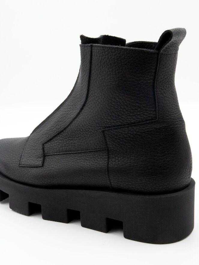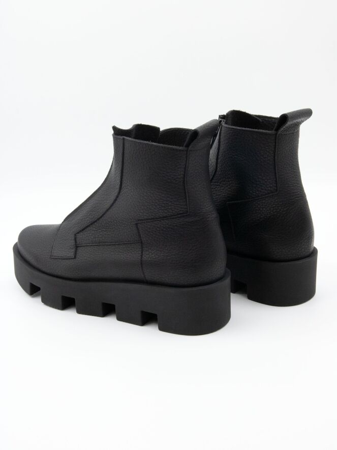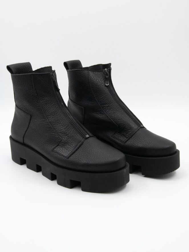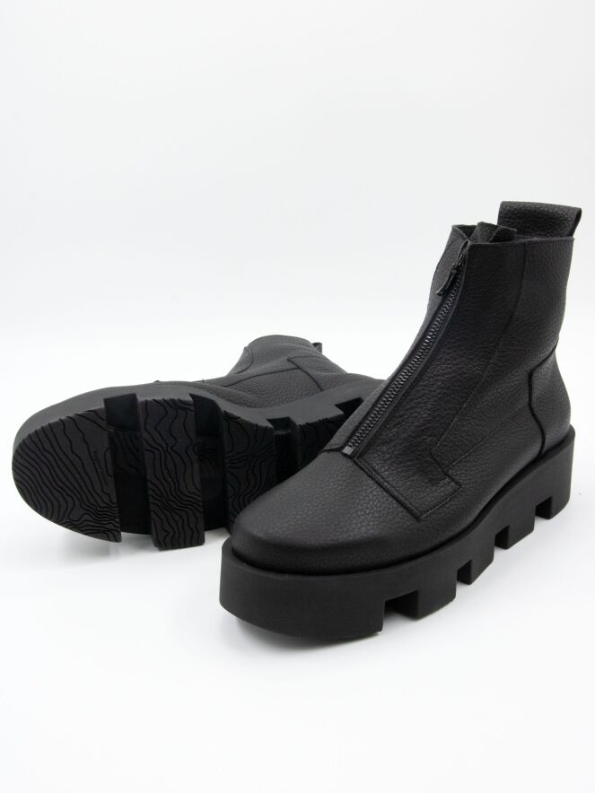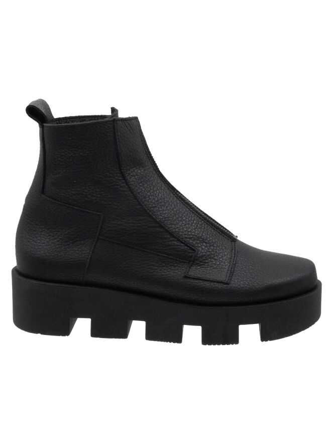 Een enkellaarsje van Arche in de kleur zwart. Over de voorvoet is een zwarte rits. Op meerdere plaatsen zijn decoratieve stiknaden. De latexzool is blokgekarteld. De binnenkant is ongevoerd.