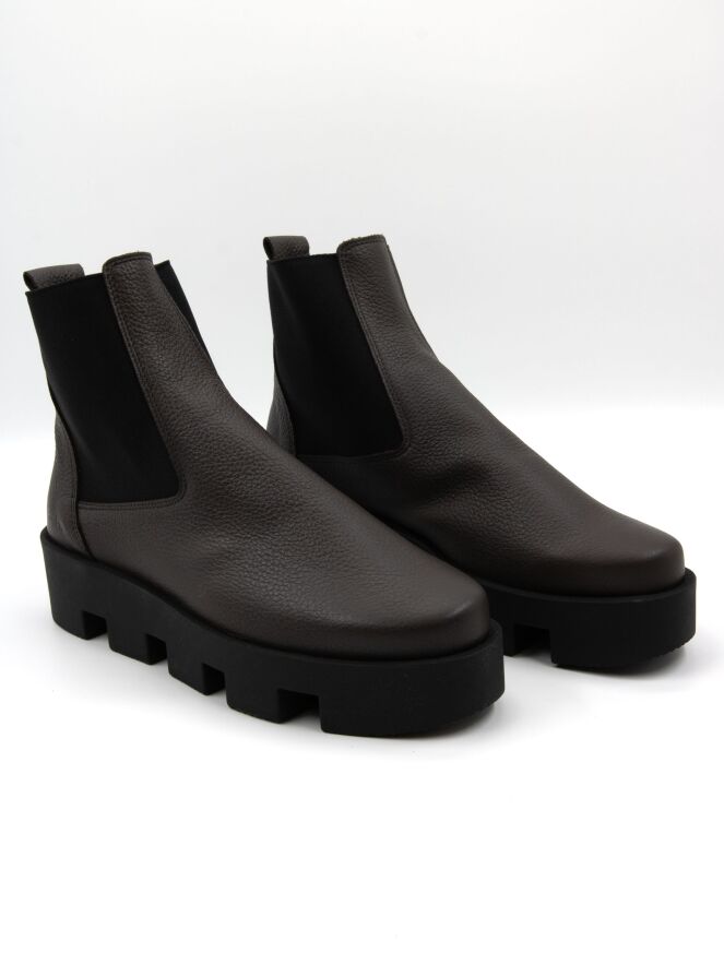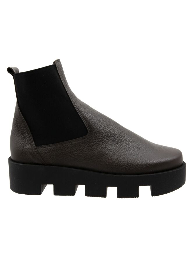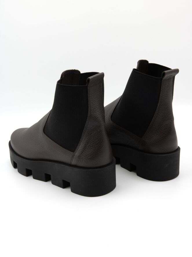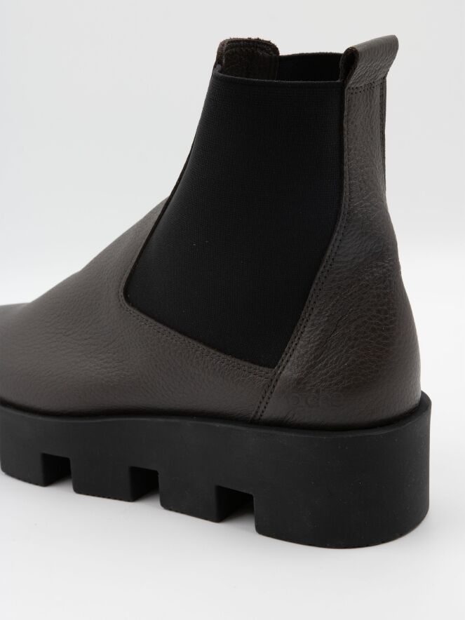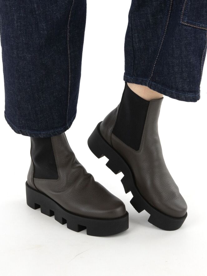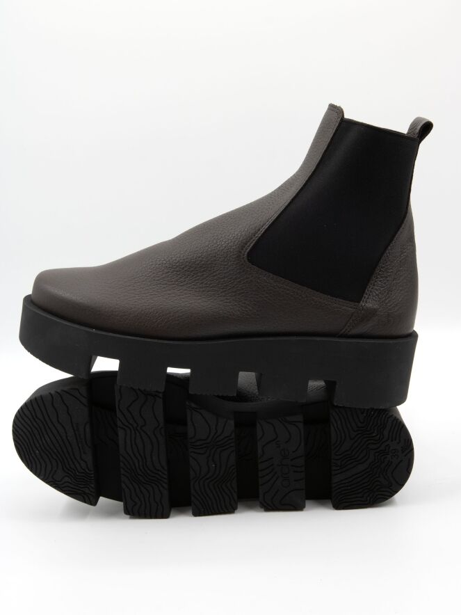 Een enkellaarsje van Arche in de kleur donkergrijs. Aan de zijkanten van de schacht zit fijn geribbeld zwart elastiek. De zool is grof gekarteld.