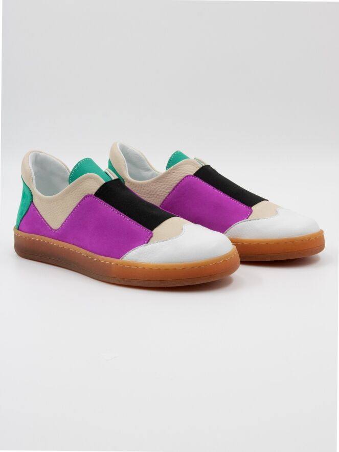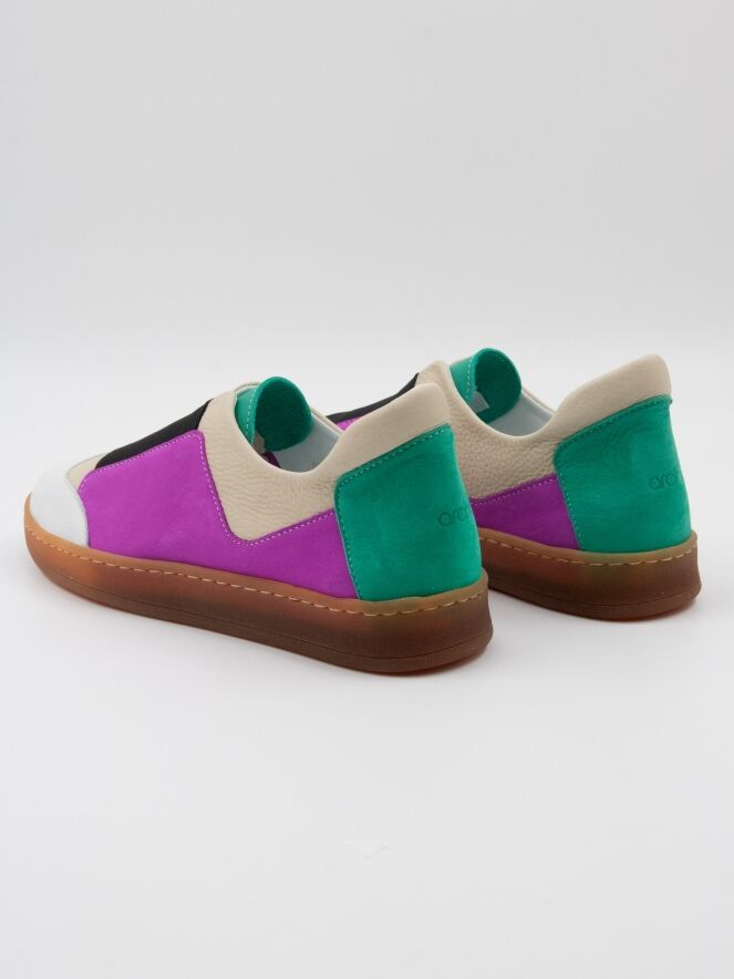 Een instapper van Arche in drie verschillende kleuren nubuck suède en leder. Langs de schacht is beige leder; langs de zijkanten is fuchsia kleurig nubuck, op de hiel is smaragdgroen nubuck en op de voorvoet is roomwit leder. Op de voorvoet is een brede zwarte elastieken band. De platte zool is in een naturel kleur. De binnenkant is met leder gevoerd.