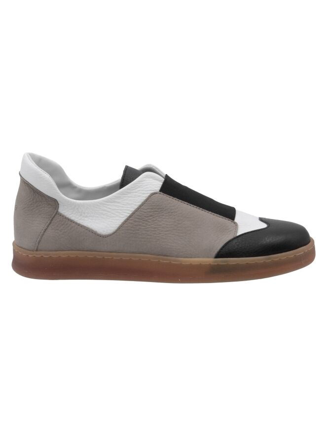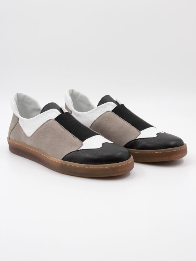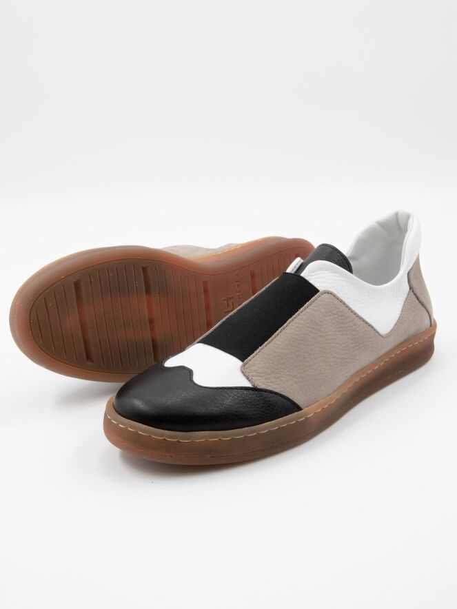 Een instapper van Arche in drie verschillende kleuren leder. Langs de schacht is roomwitleder; langs de zijkanten en op de hiel is taupe kleurig leder en op de voorvoet is zwart leder. Op de voorvoet is een brede zwarte elastieken band. De platte zool is in een naturel kleur. De binnenkant is met leder gevoerd.