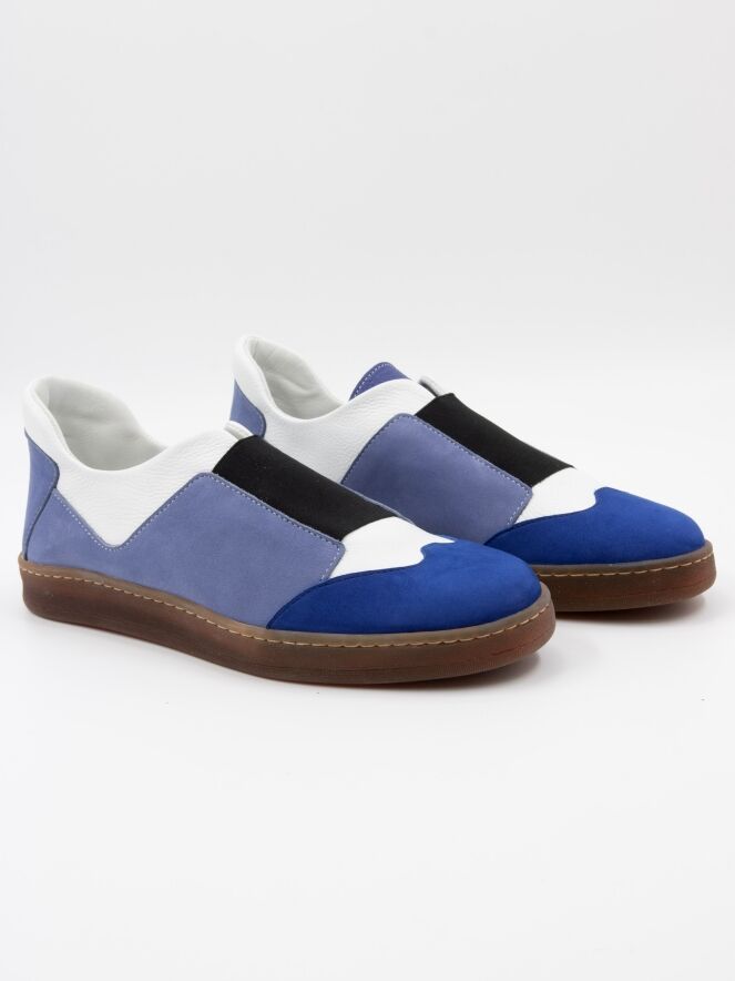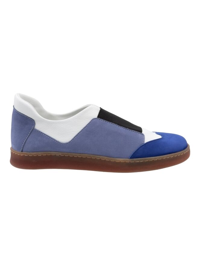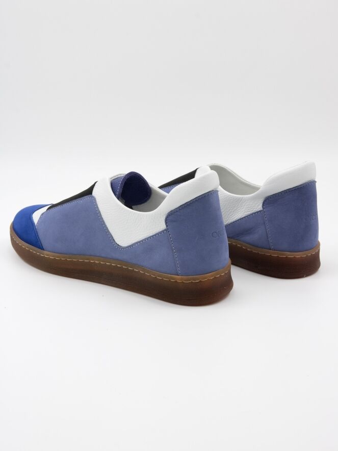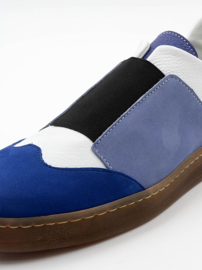 Een instapper van Arche in drie verschillende kleuren nubuck suède en leder. Langs de schacht is roomwit leder; langs de zijkanten en op de hiel is lila kleurig nubuck en op de voorvoet is kobaltblauw nubuck suède. Op de voorvoet is een brede zwarte elastieken band. De platte zool is in een naturel kleur. De binnenkant is met leder gevoerd.