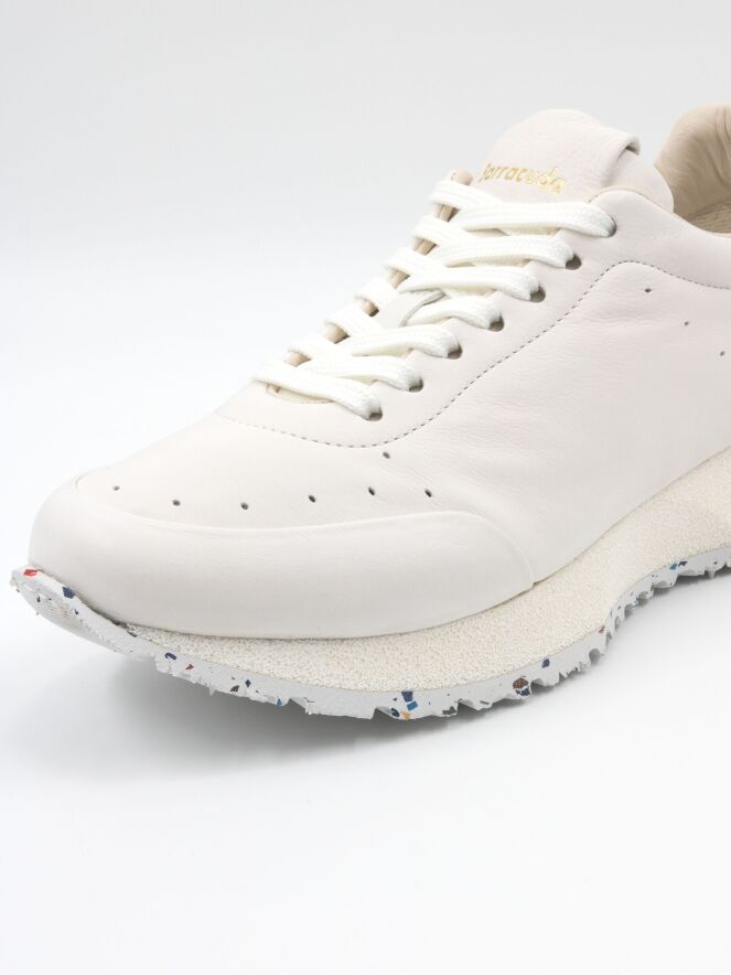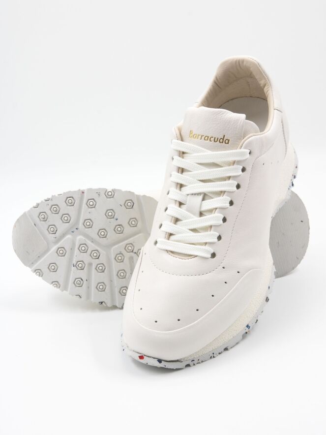 Een luxe sneaker van Barracuda in de kleur wit. Op de voorvoet en aan de zijkanten is de sneaker op enkele plaatsen geperforeerd. De binnenkant is met leder gevoerd.