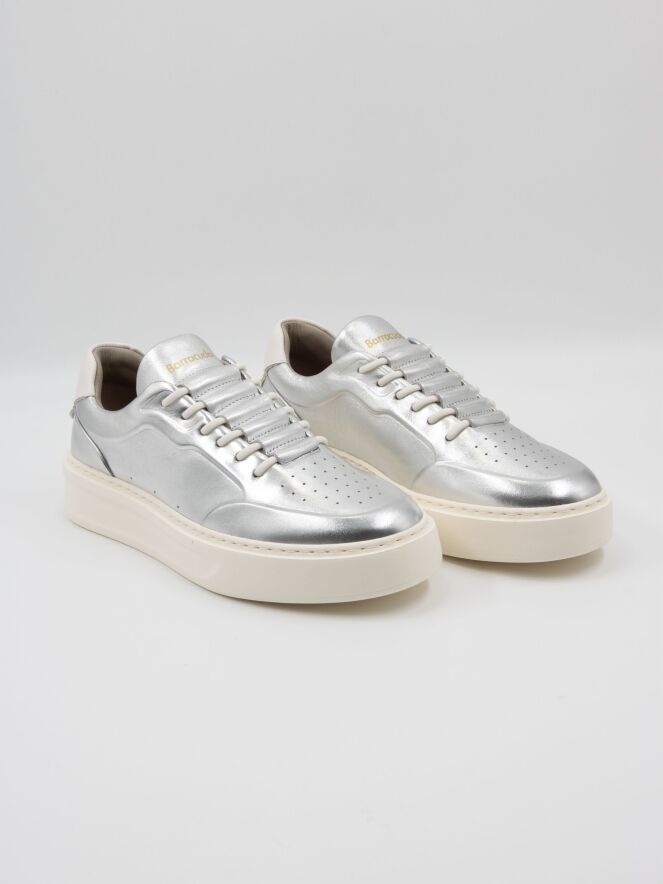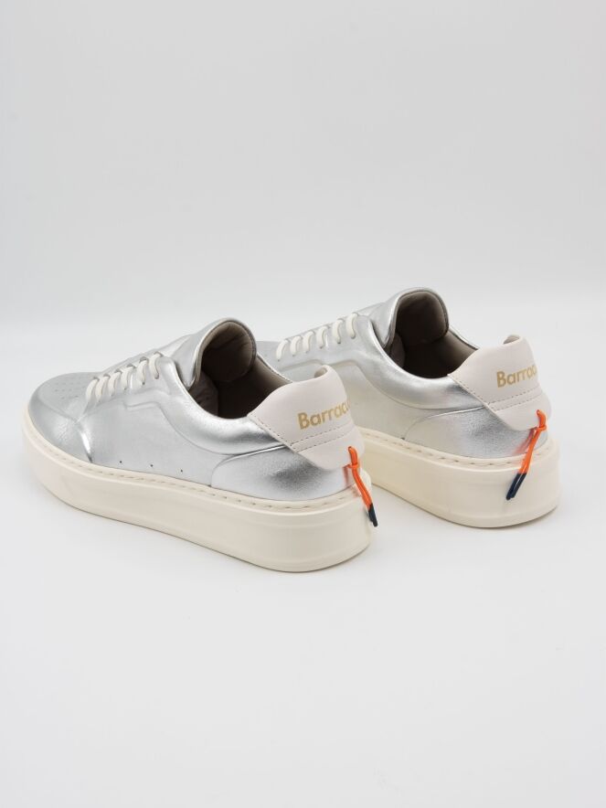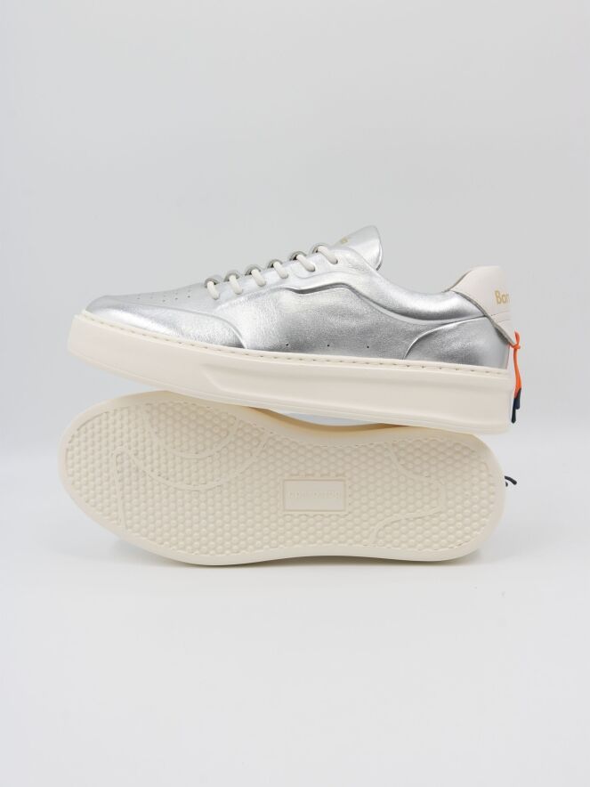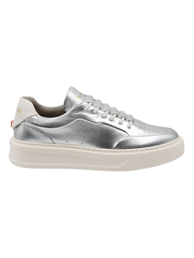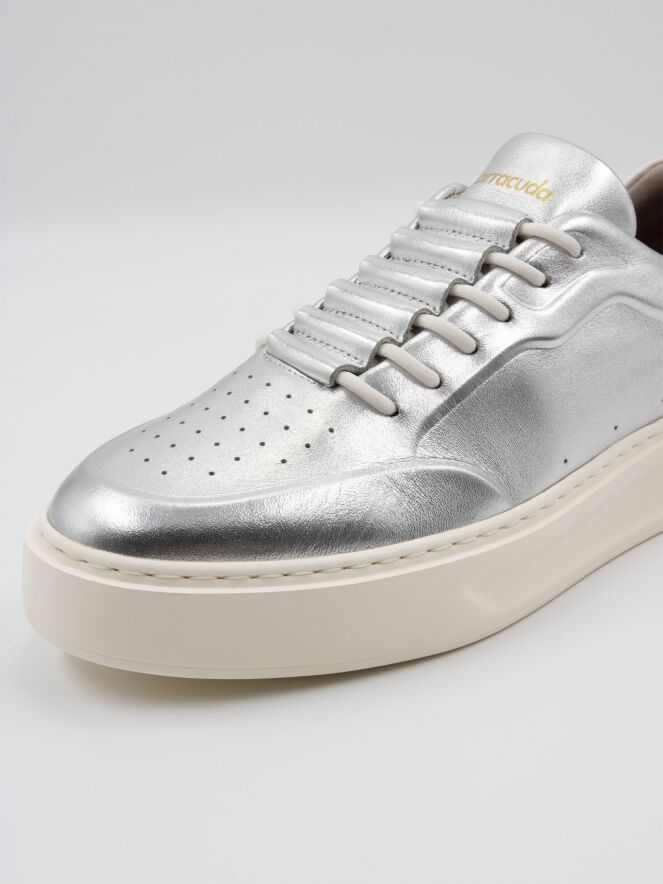 Een luxe sneaker van Barracuda in de kleur zilver. Op de voorvoet en aan de zijkanten is de sneaker geperforeerd. Langs de rand van de witte zool loopt een wit stiksel. De binnenkant is met leder gevoerd.