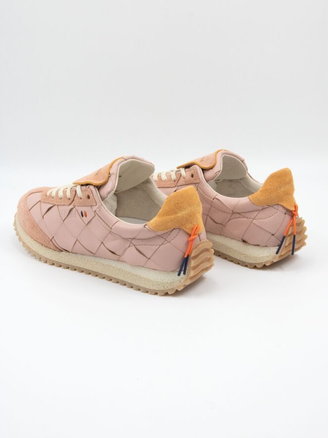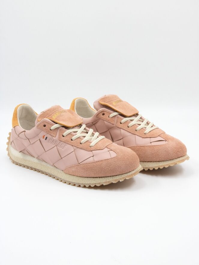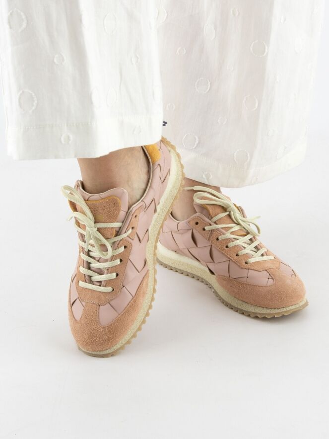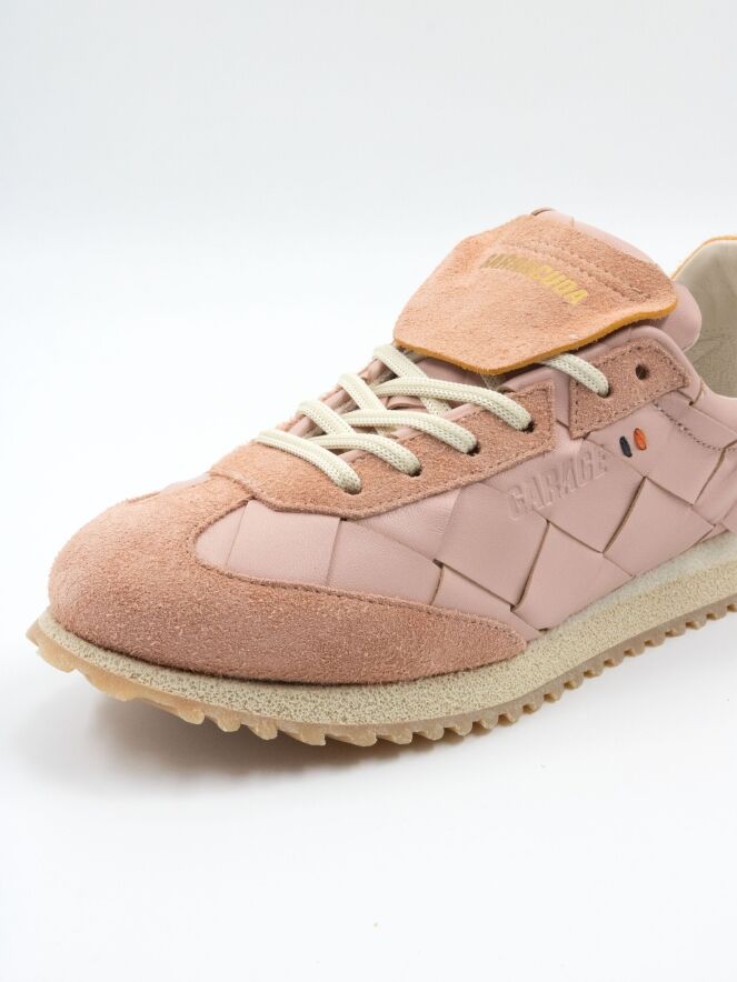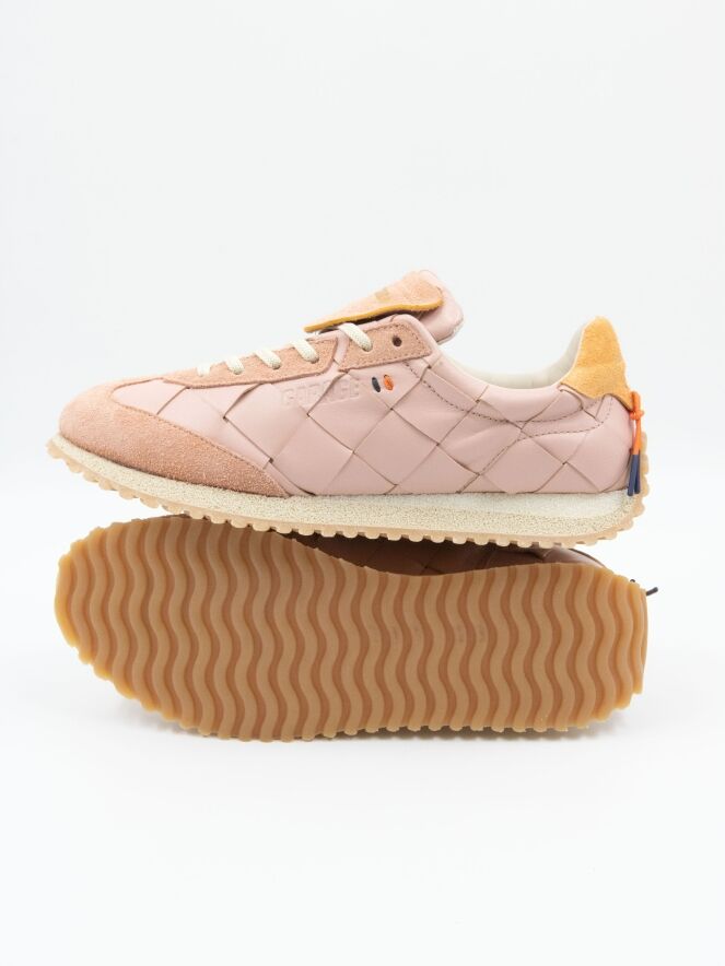 Een sneaker van Barracuda in de kleur lila. Het leder heeft een gevlochten structuur. Langs de neus en de veters is suède verwerkt. Op de hiel bevindt zich een stuk suède in de kleur camel. De zool is roomwit met beige.