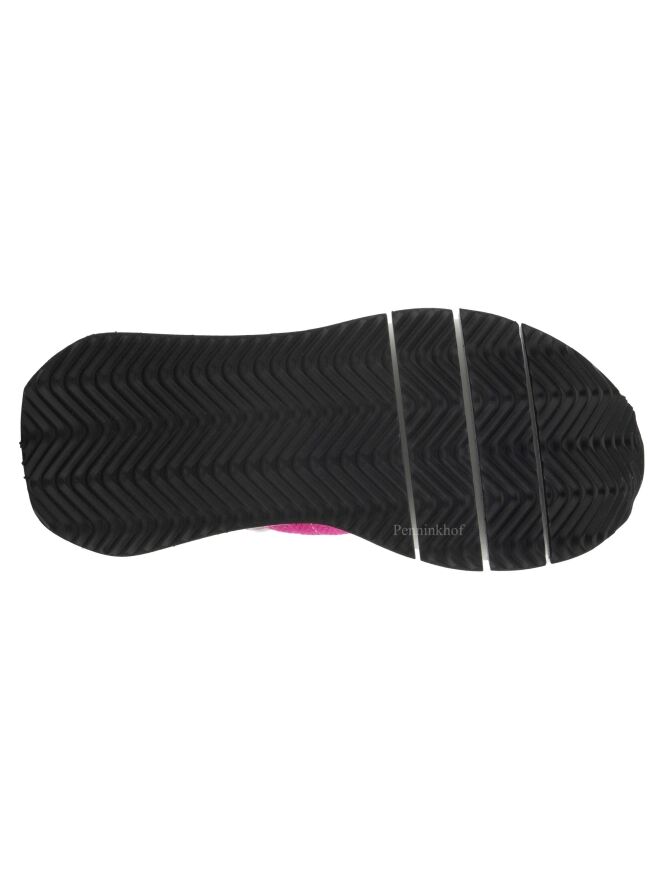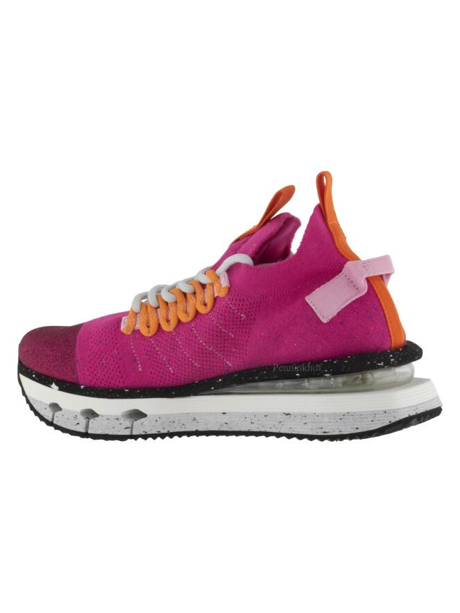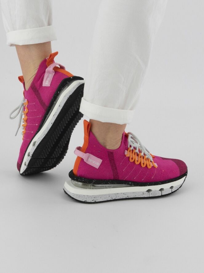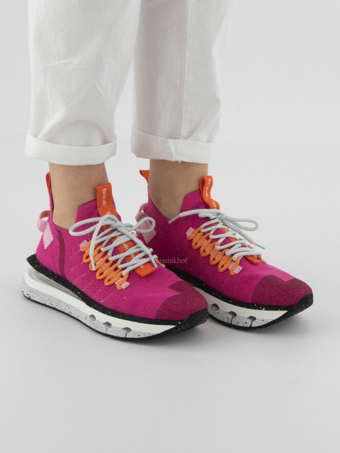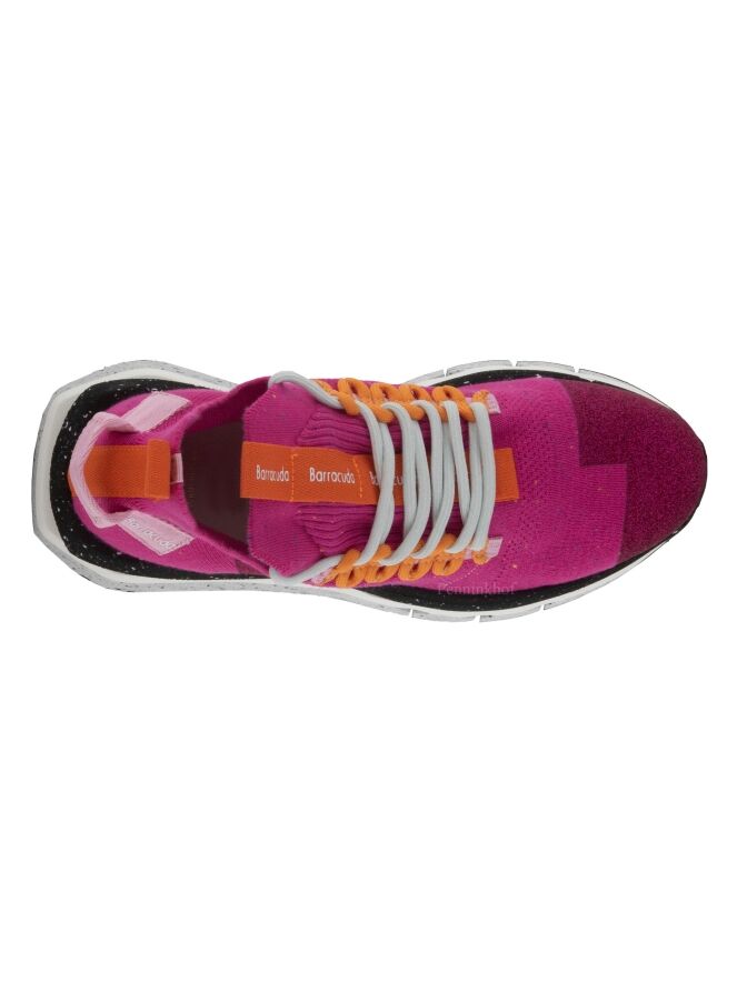 Een sneaker van Barracuda in een elastische stof in de kleur fuchsia. In de stof zijn kleine stippen in meerdere kleuren verwerkt Aan de zijkanten zijn verticale decoratieve stiknaden. De roomwitte veters zijn bevestigd in een zig zag structuur van een oranje veter. De zool is opgebouwd in 4 lagen met de kleuren zwart, roomwit, lichtgrijs en transparant.