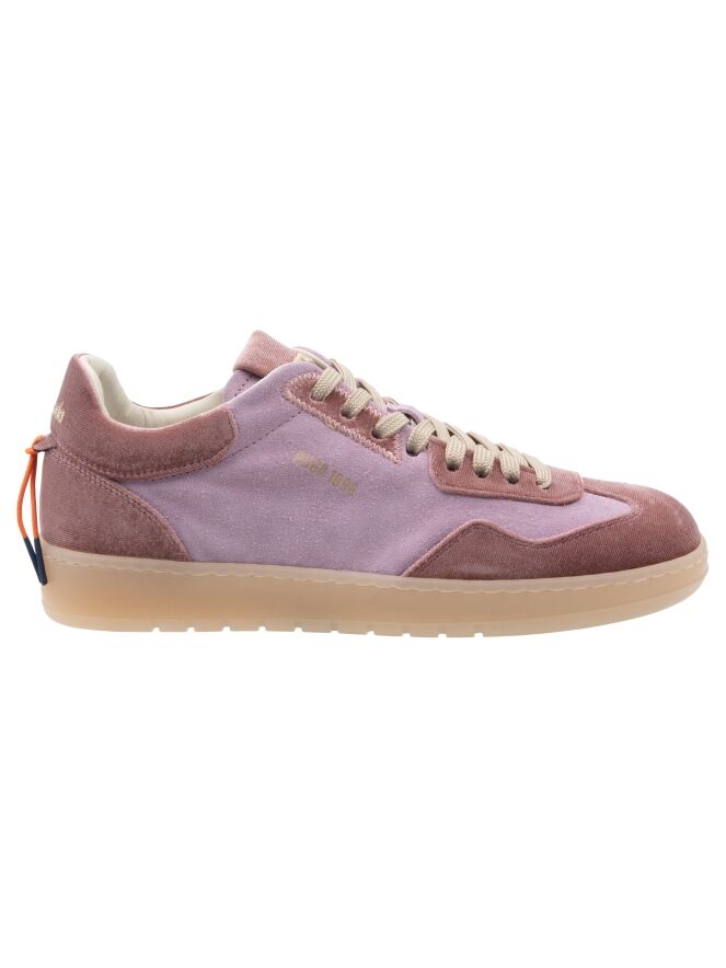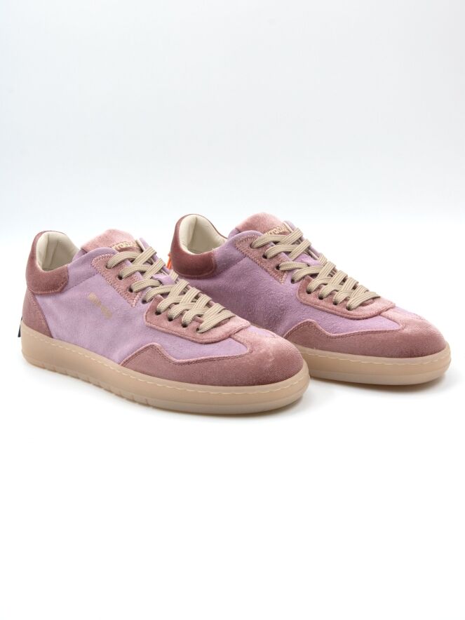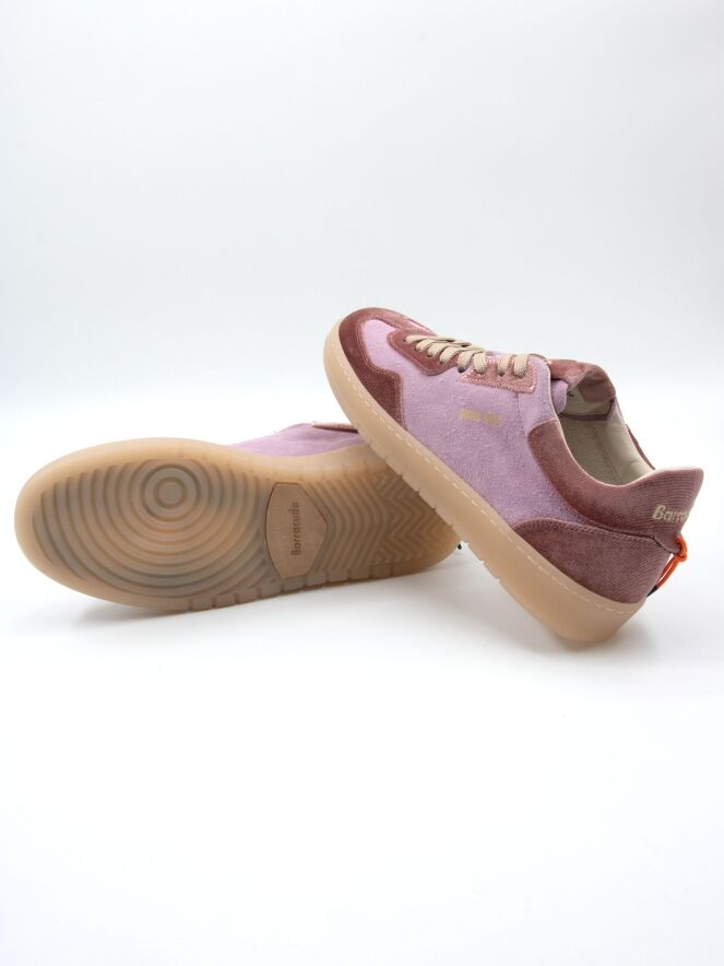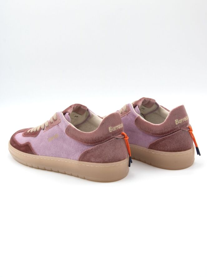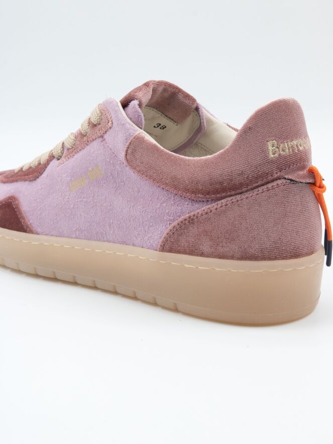 Een lage sneaker van Barracuda in de kleur lila. Langs de rand van de neus, de schacht, de hiel en langs de veters is een zachte fluwelen stof in een oudroze kleur.