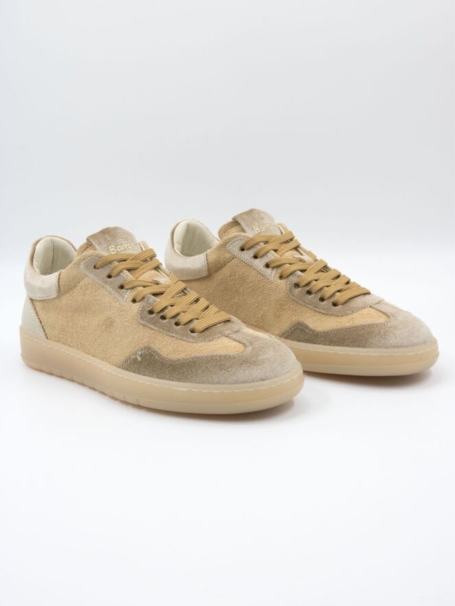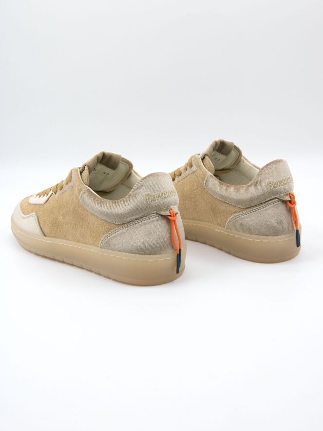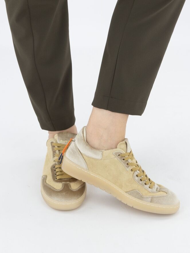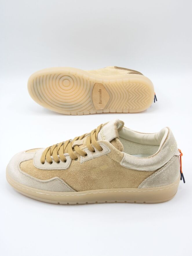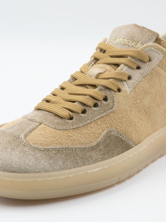 Een lage sneaker van Barracuda in de kleur camel. Langs de rand van de neus, de schacht, de hiel en langs de veters is een zachte fluwelen stof.