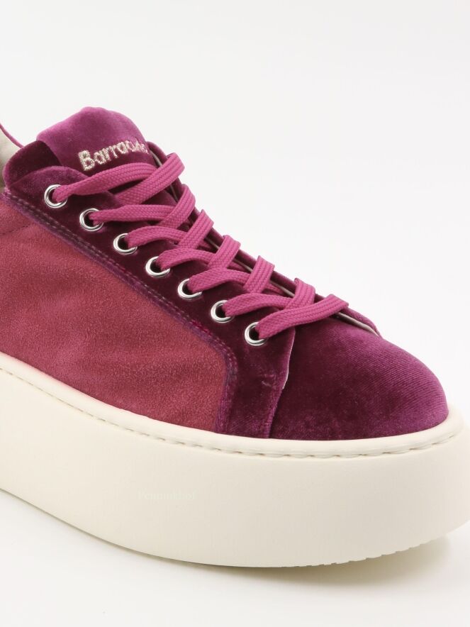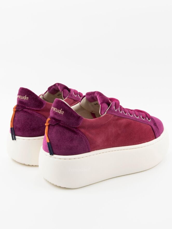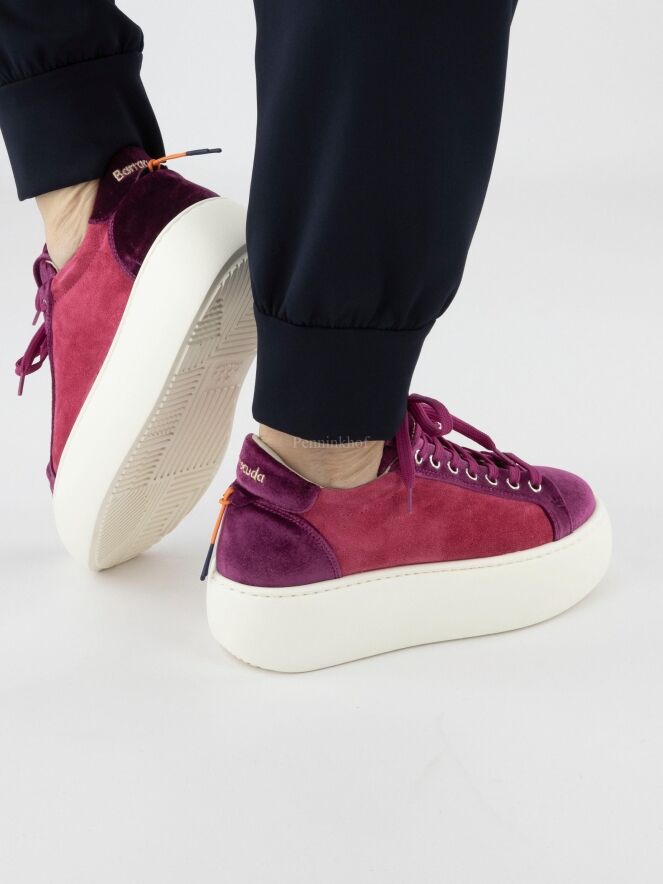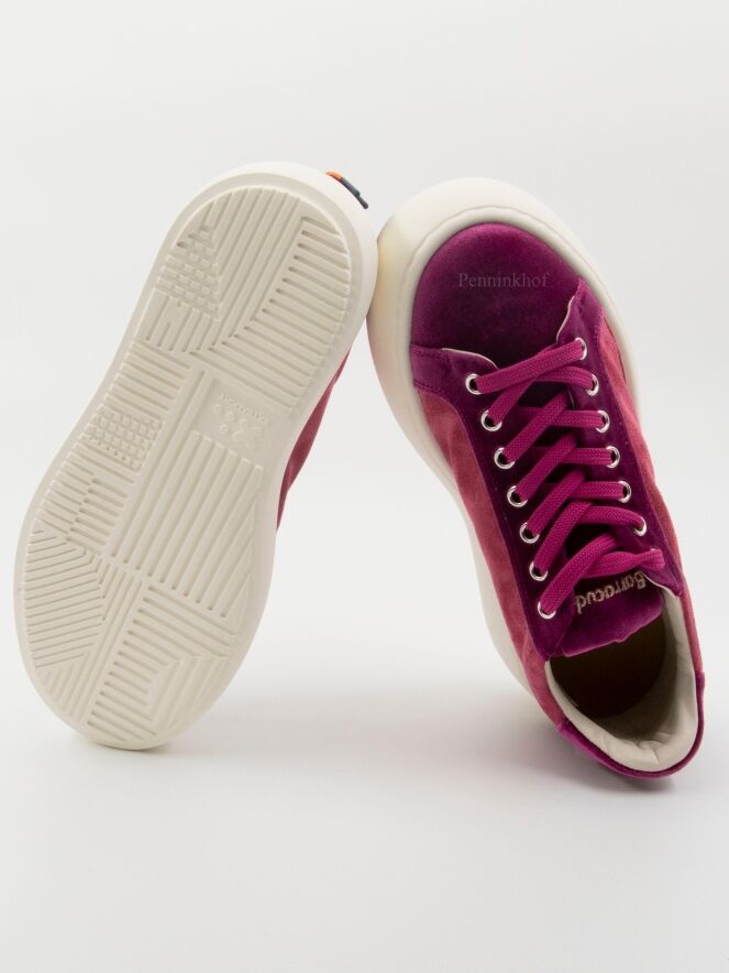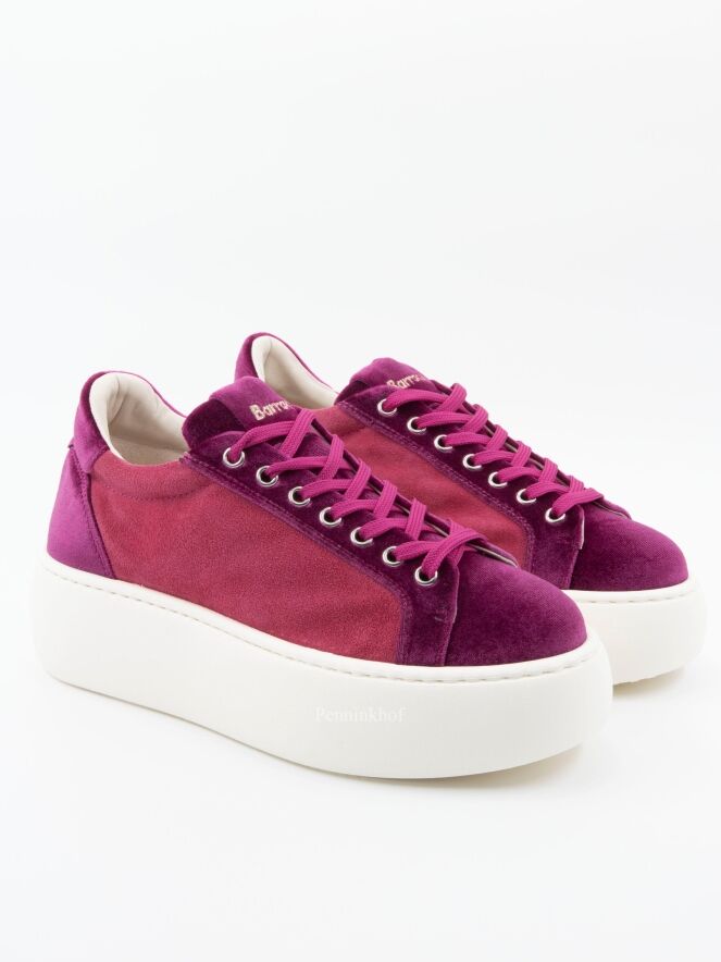 Een luxe sneaker van Barracuda in een fuchsia kleur. De neus, de hiel en langs de veter is een paarse fluwelen stof. De plateauzool is in een roomwitte kleur. De sneaker is aan de binnenkant gevoerd.