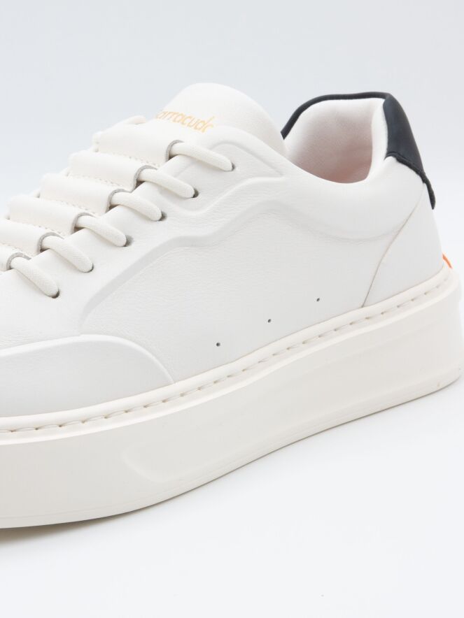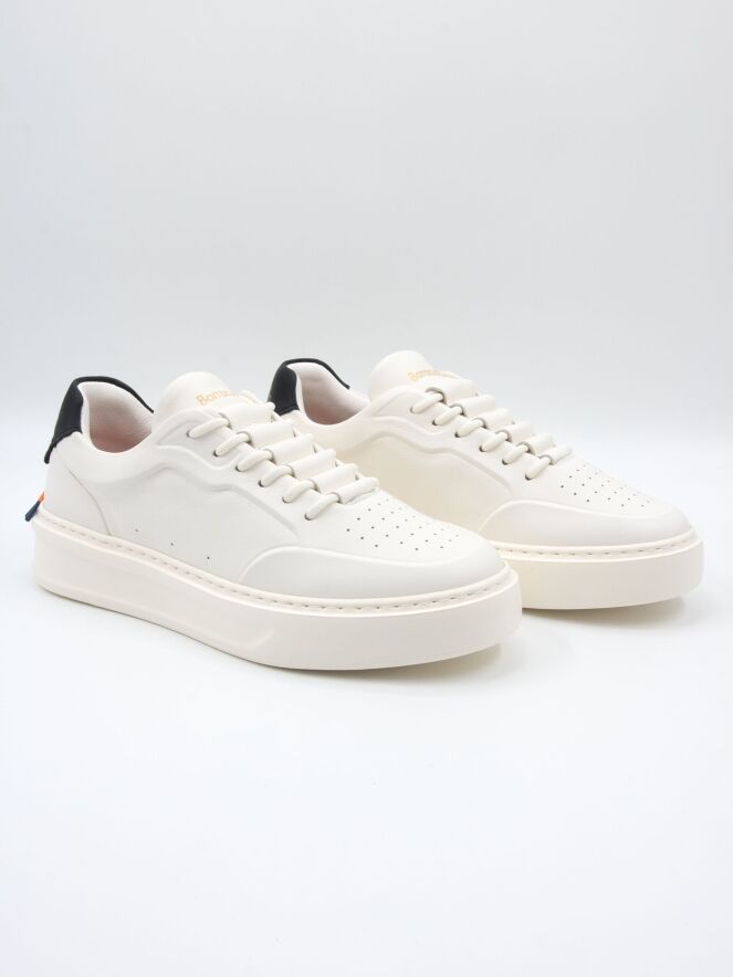 Een lage sneaker van Barracuda in de kleur roomwit. De voorvoet is fijn geperforeerd en de zool is roomkleurig. Op de hiel is een zwart stuk leder. De binnenkant is met leder gevoerd.