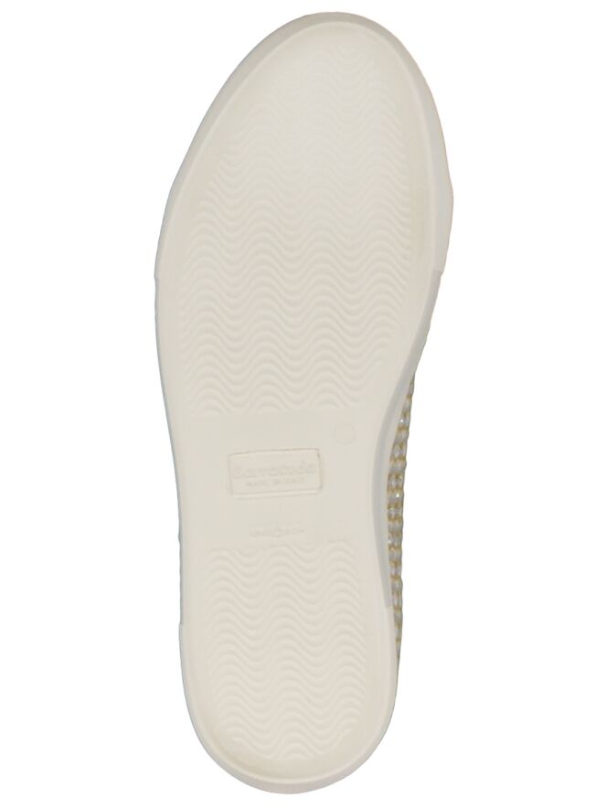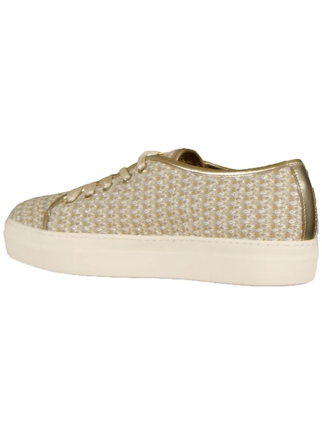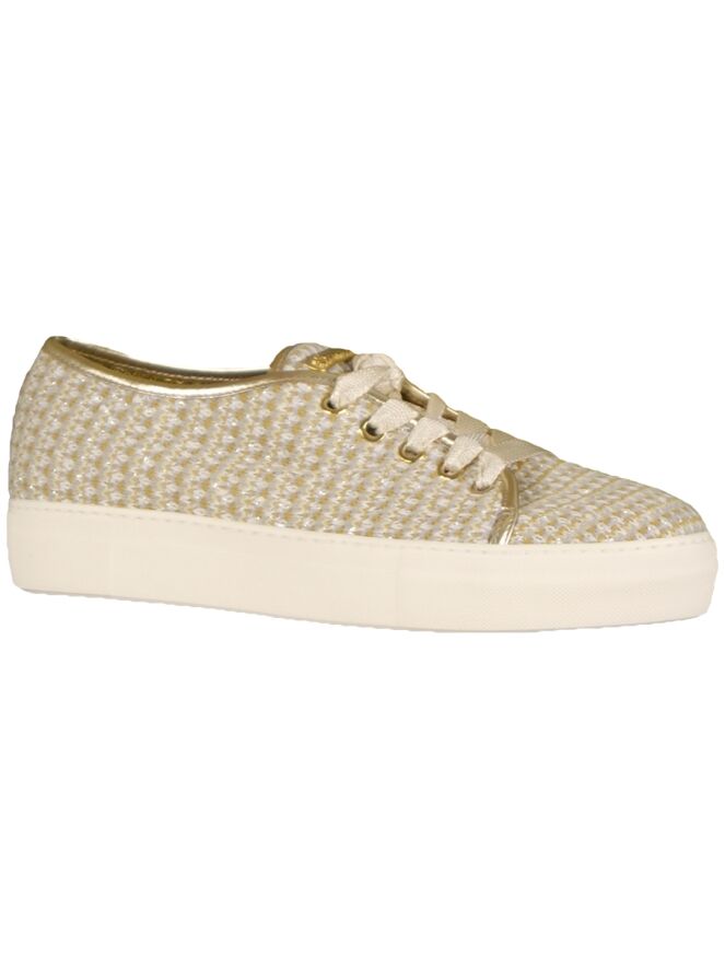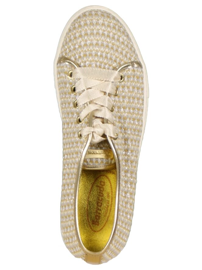Een veterschoen van het merk Barracuda in een gemêleerde kleur van oker, grijs en room. De schoen heeft een zool van 2 cm hoog en is van stof. Langs de randen is een bies in de kleur goud van leder. De schoen is aan de binnenzijde gevoerd.