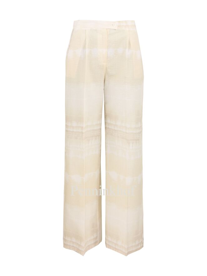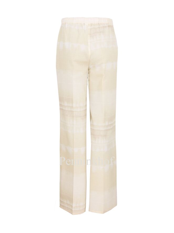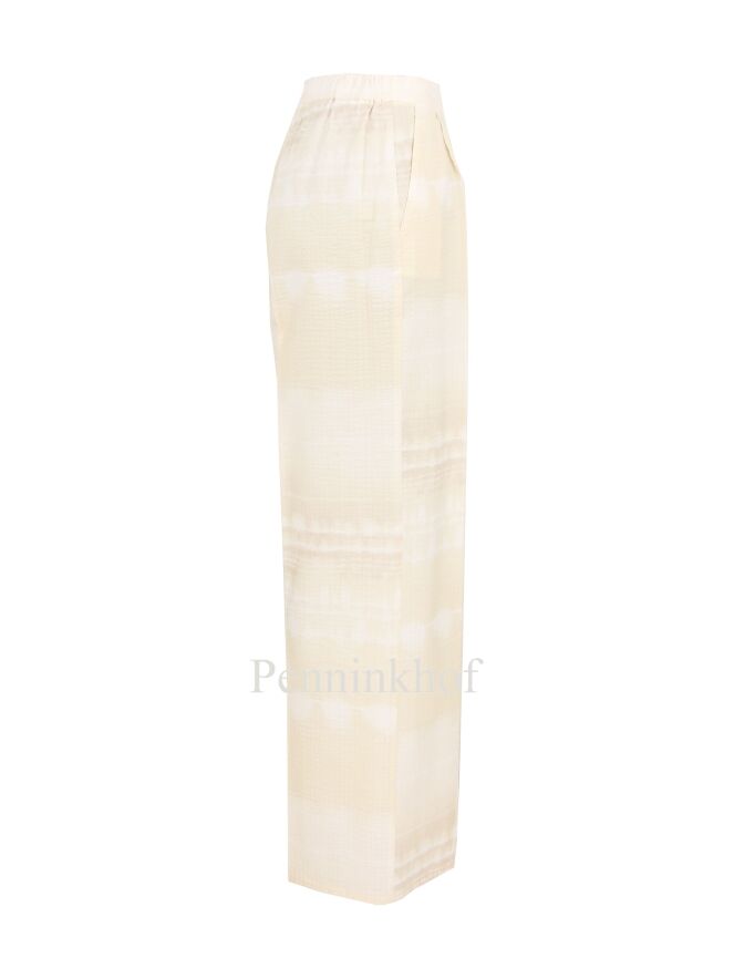 Een broek van Beatrice B. in een batik print met de kleuren wit en vanille. De stof is in een fijne wafel structuur. In de taille is aan de achterzijde een elastieken band. De broek heeft steekzakken en mag op de hand worden gewassen.