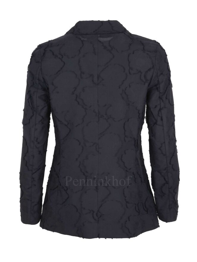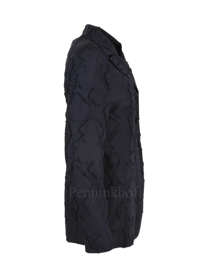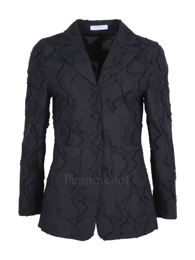 Een blazer van Beatrice B. in de kleur zwart. In de stof is een gelaserde bloemenprint met fijn gerafelde omlijningen. De blazer is ongevoerd en mag op de hand worden gewassen.