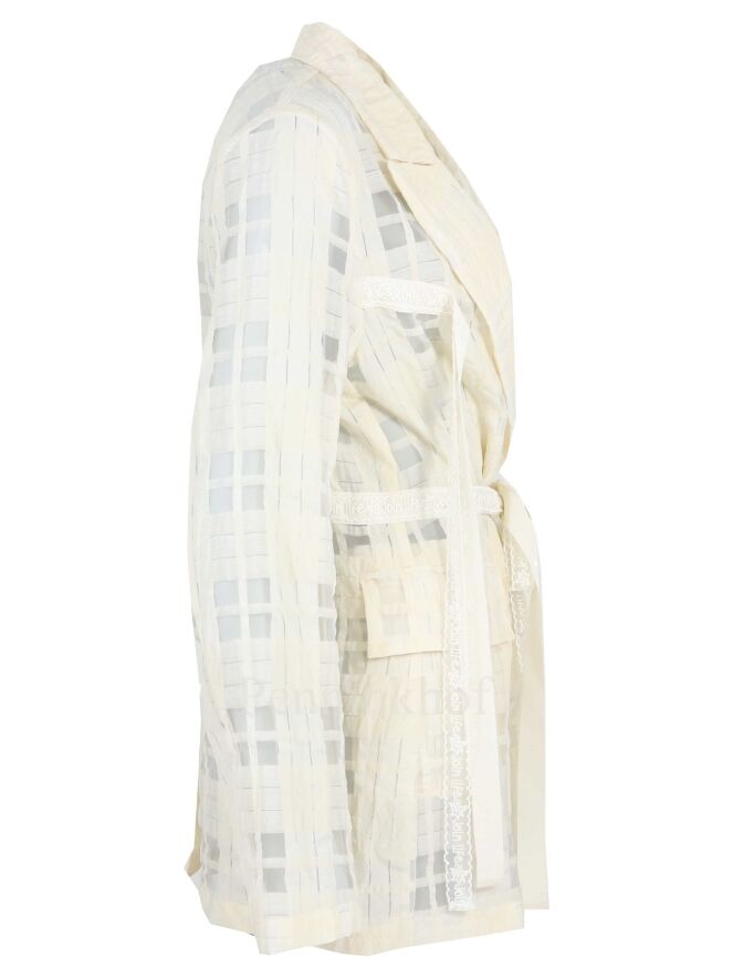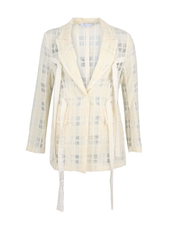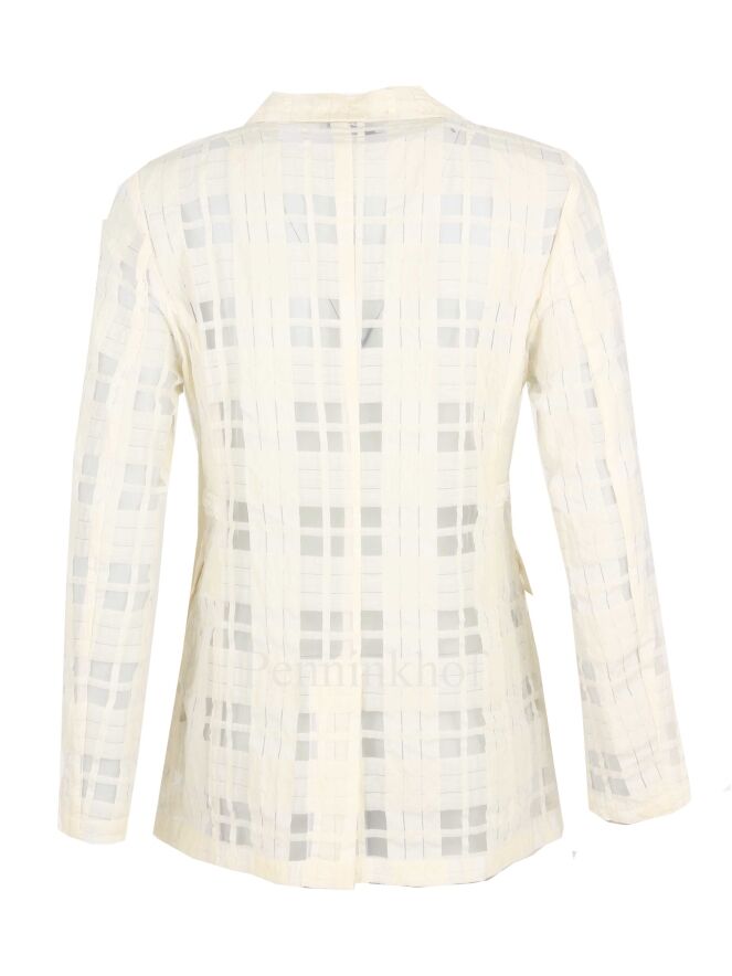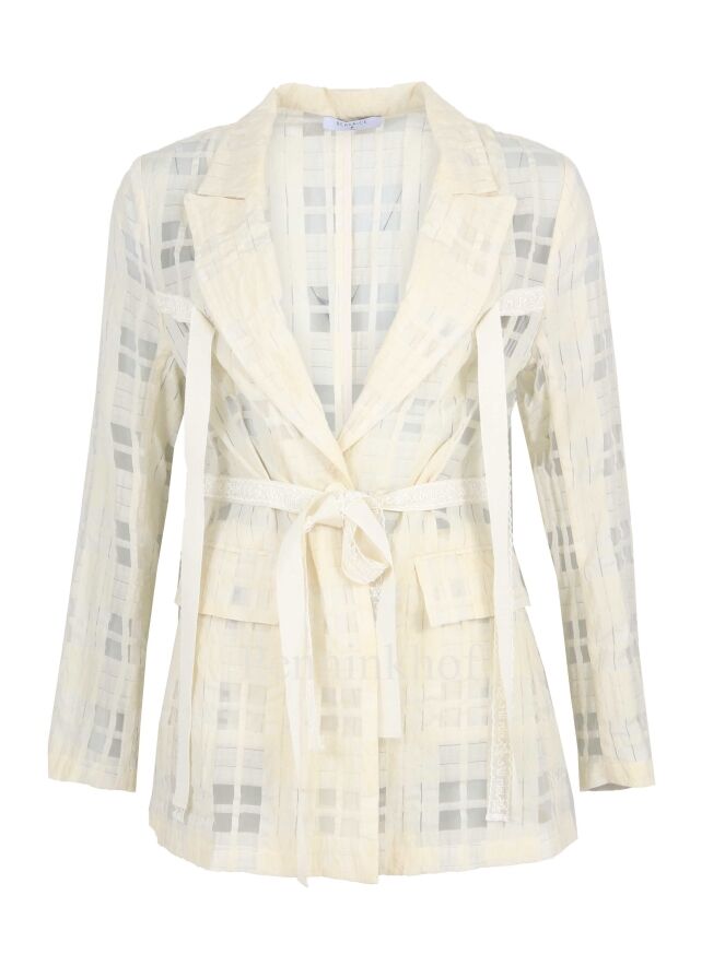 Een transparante blazer van Beatrice B. in de kleur roomwit. De stof is in een gevlochten blokken patroon. In de taille en vanuit de mouwinzet is een dubbel lint waarvan één lint transparant is met een tekst in de stof geweven. De blazer is ongevoerd en mag op de hand worden gewassen.