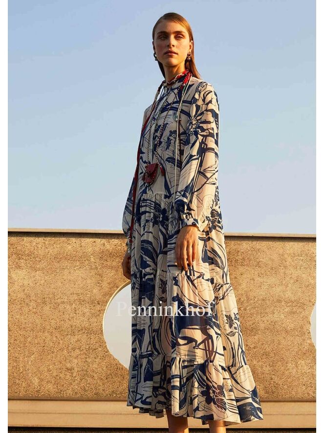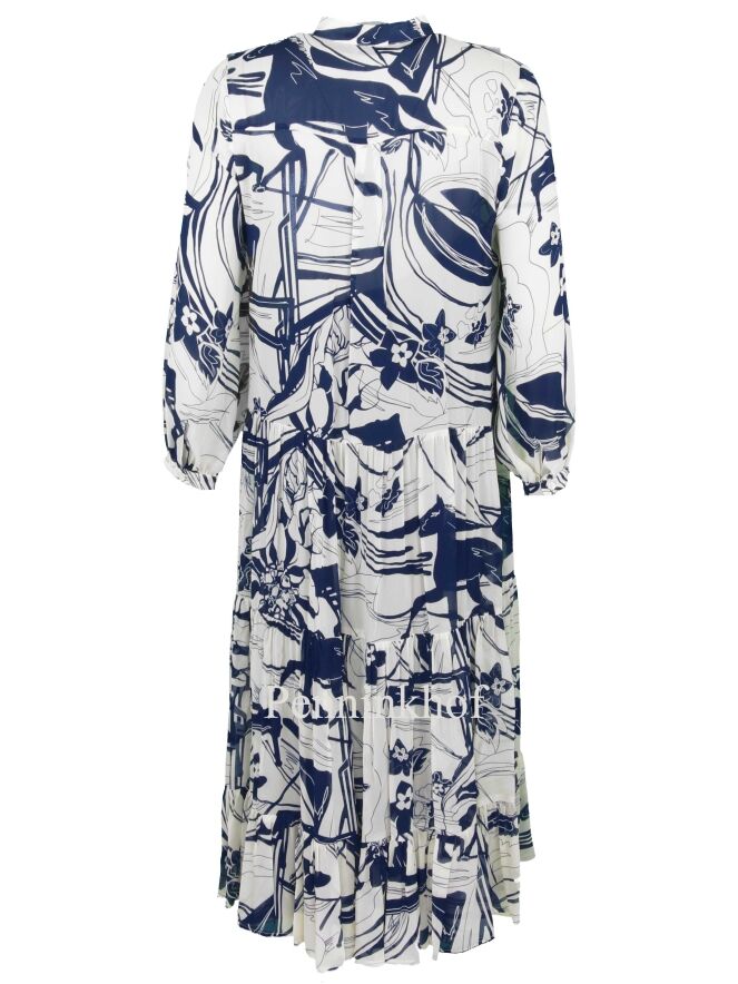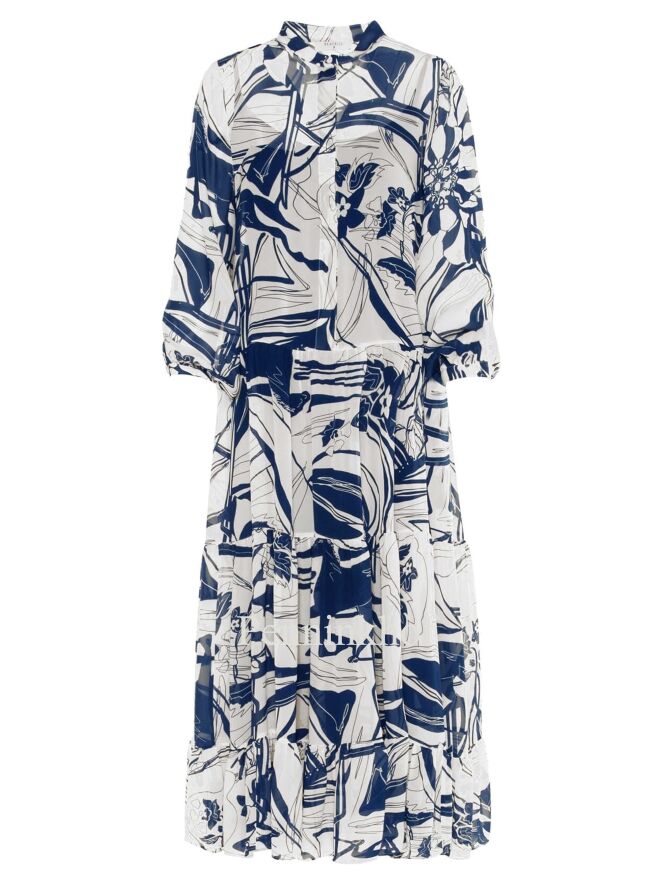 Een jurk van Beatrice B. In een grafische print met de kleuren blauw en roomwit. Onder de taille en ter hoogte van de knie is een elastische stiknaad waar de stof fijn geplooid is. De bovenste stof is transparant en de jurk heeft een onderjurk in een nachtblauwe kleur. Deze jurk mag op de hand worden gewassen.