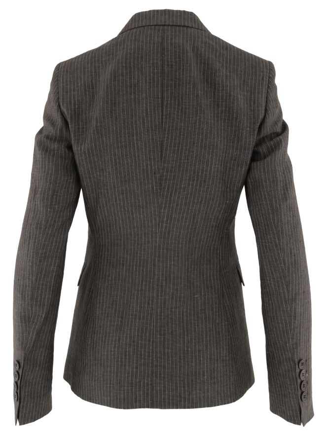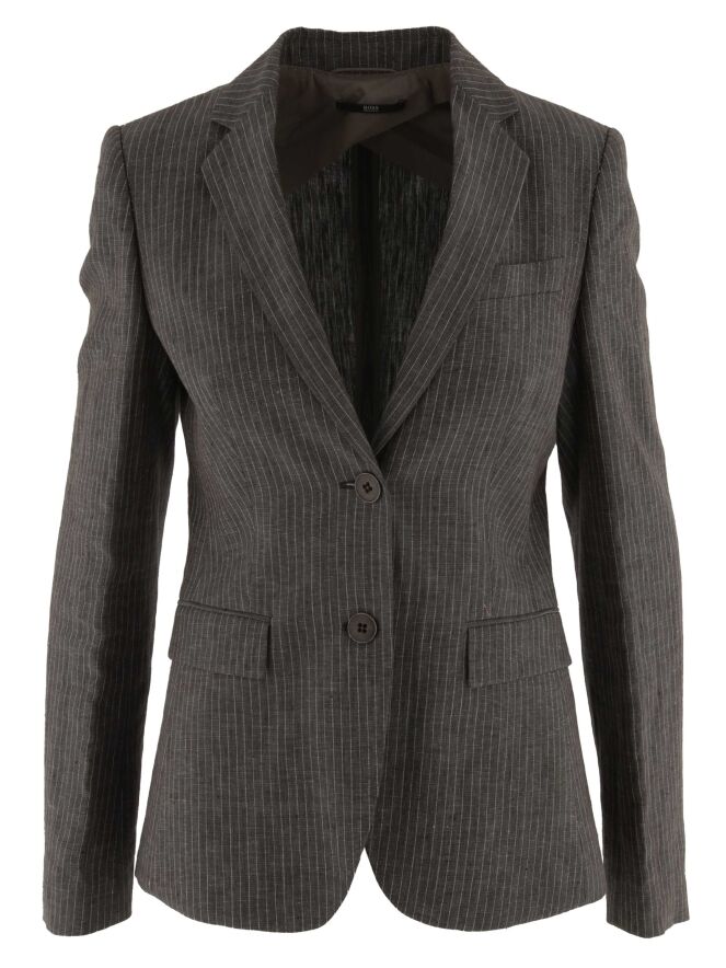 Een blazer van Boss Black label in een krijtstreep met meerdere tinten bruin en roomwit. De blazer heeft een 2 knoops sluiting en is gevoerd. Deze blazer mag niet worden gewassen.