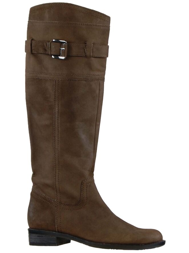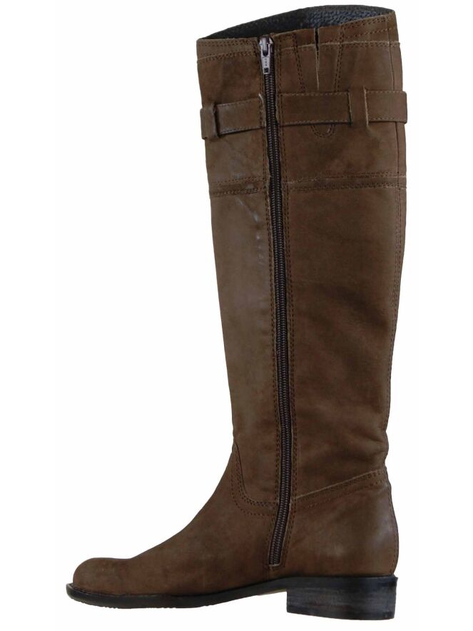 Een laars van het merk BP Zone in een chocolade bruine kleur. De laars heeft aan de bovenkant van de schacht een band met een nikkelen gesp. Aan de binnenzijde van de laars is een rits vanaf de zool tot aan de bovenkant van de schacht. In de rand is een insnijding met een elastieken stuk. De schachthoogte is 41 cm en de omtrek is 37 cm.