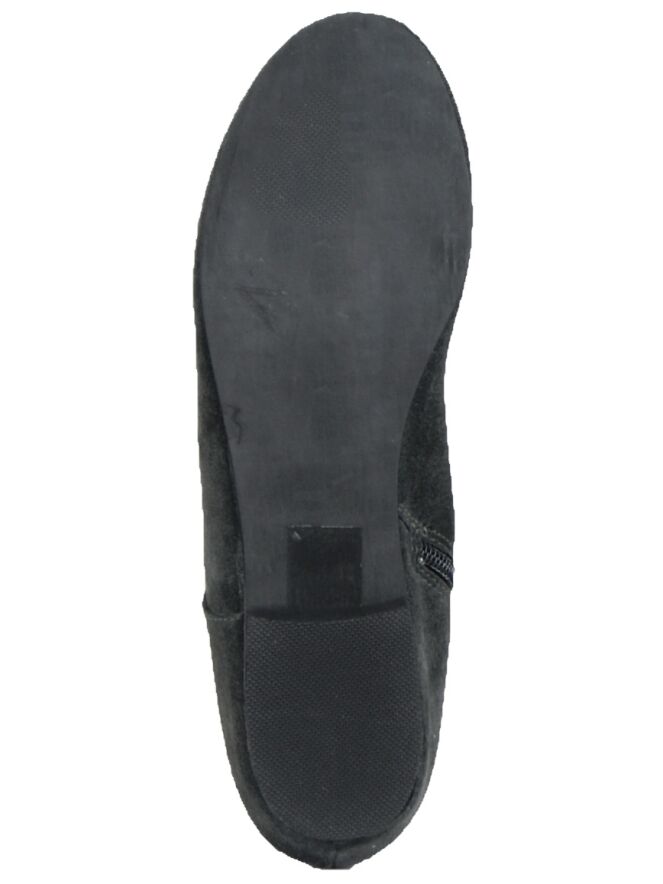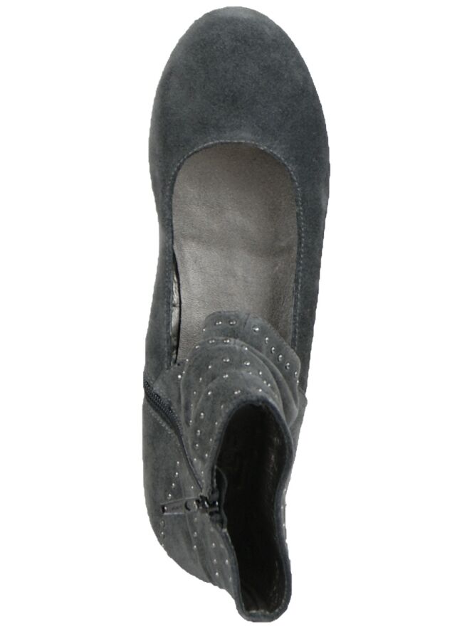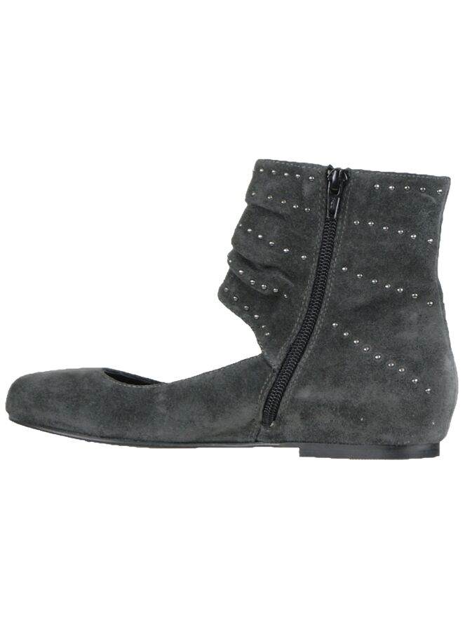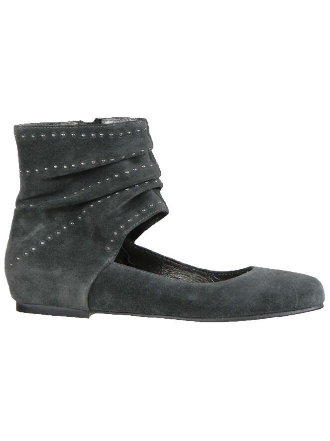 Een ballerina van het merk Bruno Premi in de kleur donker grijs. De ballerina heeft een korte schacht om de enkel welke geplooid is en met meerdere rijen kleine nikkel kleurige studs. De binnenkant van de ballerina is met leder gevoerd.