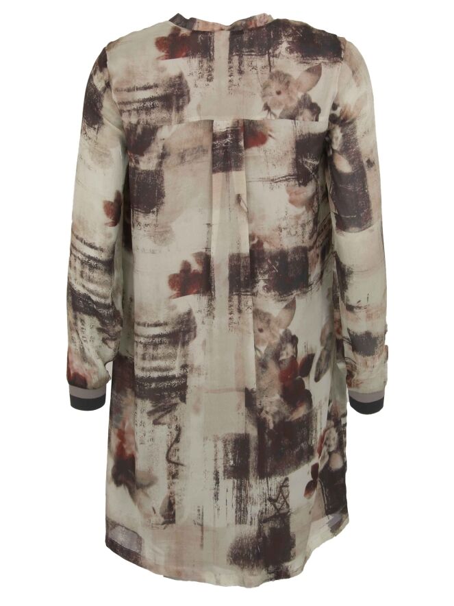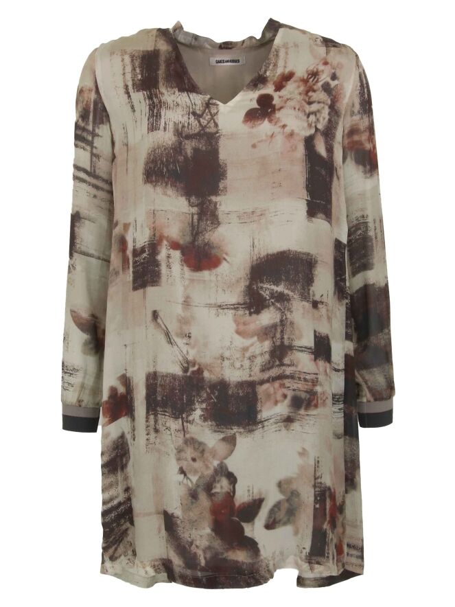 Een lange blouse van het merk Cakes and Kisses in een print met als hoofdkleuren aubergine en taupe. De blouse heeft een V - hals belijning met een smal boordje vanaf de schouder. De blouse is voile en wordt geleverd met een lange top in de kleur uni taupe. De mouwen hebben een tricot boord van 4 cm breed in 2 kleuren taupe. deze blouse mag op de hand worden gewassen.