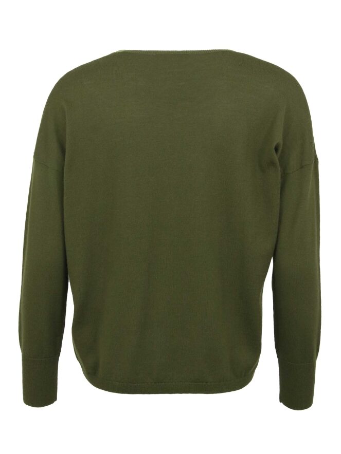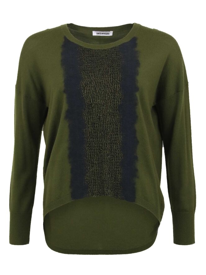 Een pullover van het merk Cakes and Kisses in de kleur groen. Over het midden van de pullover loopt een brede verticale band in het zwart met een metallic groene draad er door geweven. De voorzijde is 10 cm langer als de achterzijde van de pullover. Deze pullover mag op de hand worden gewassen.