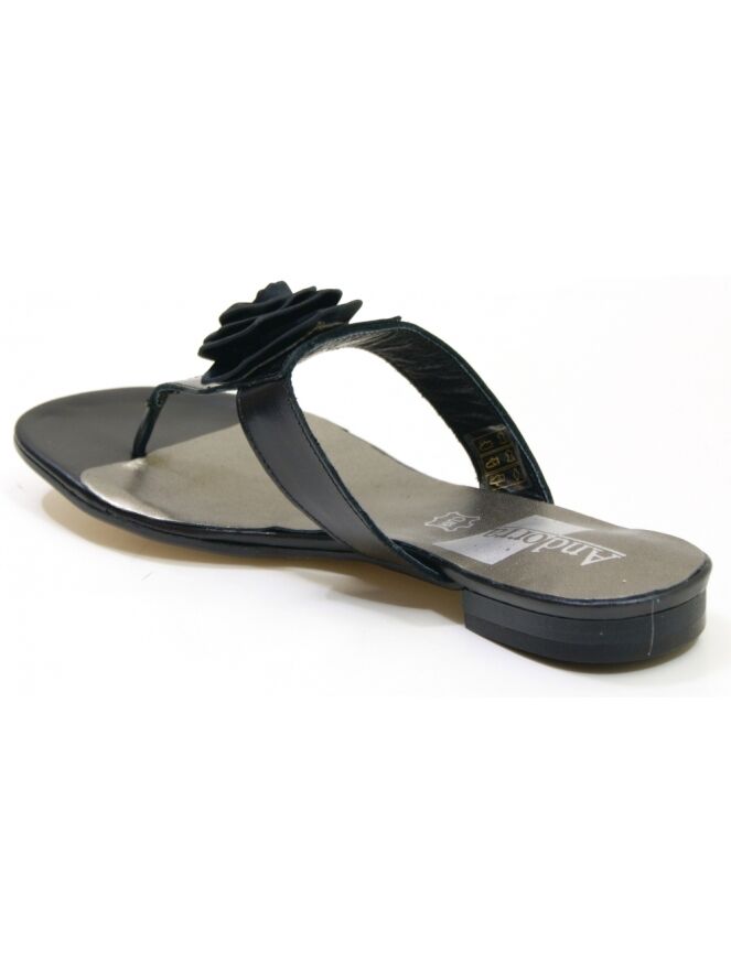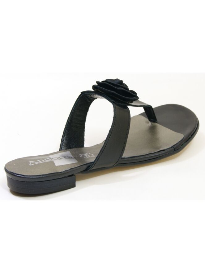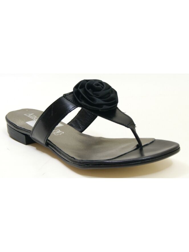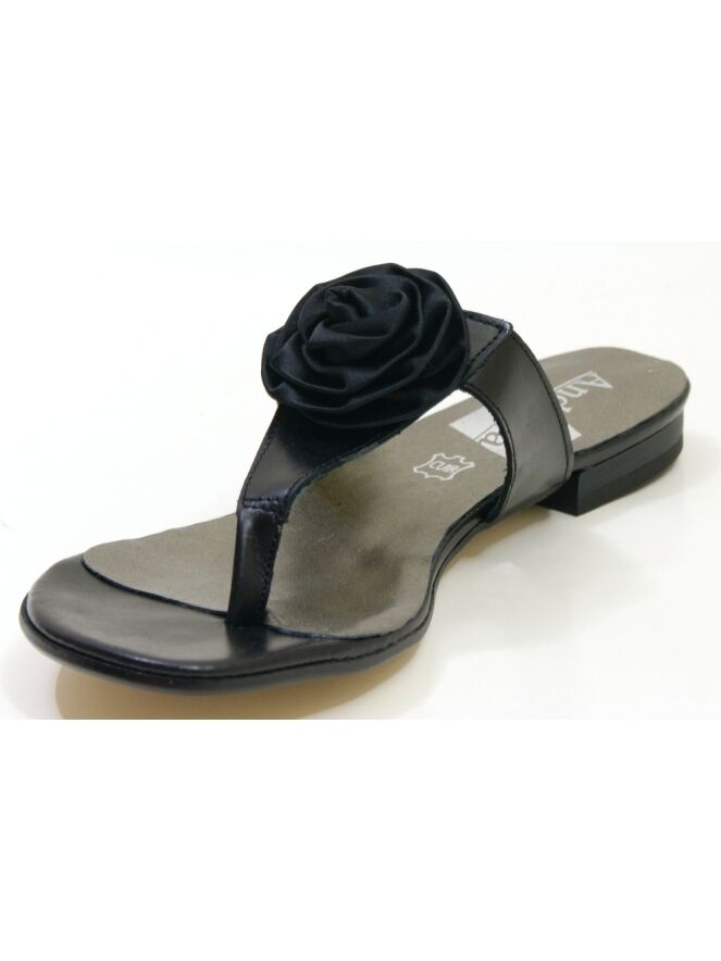 Een sandaal van Calmode in de kleur zwart. Op de voorvoet is een decoratieve roos.