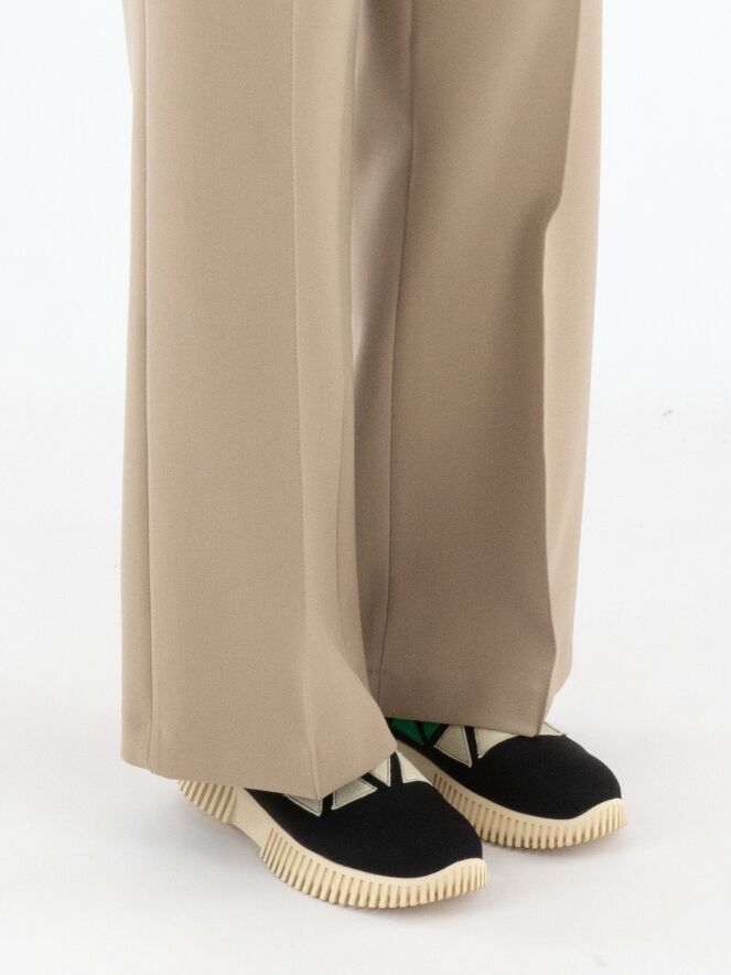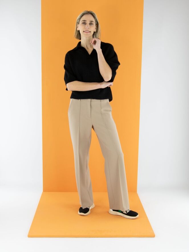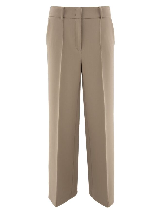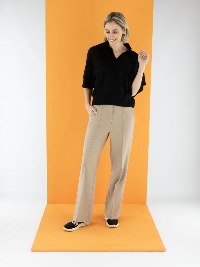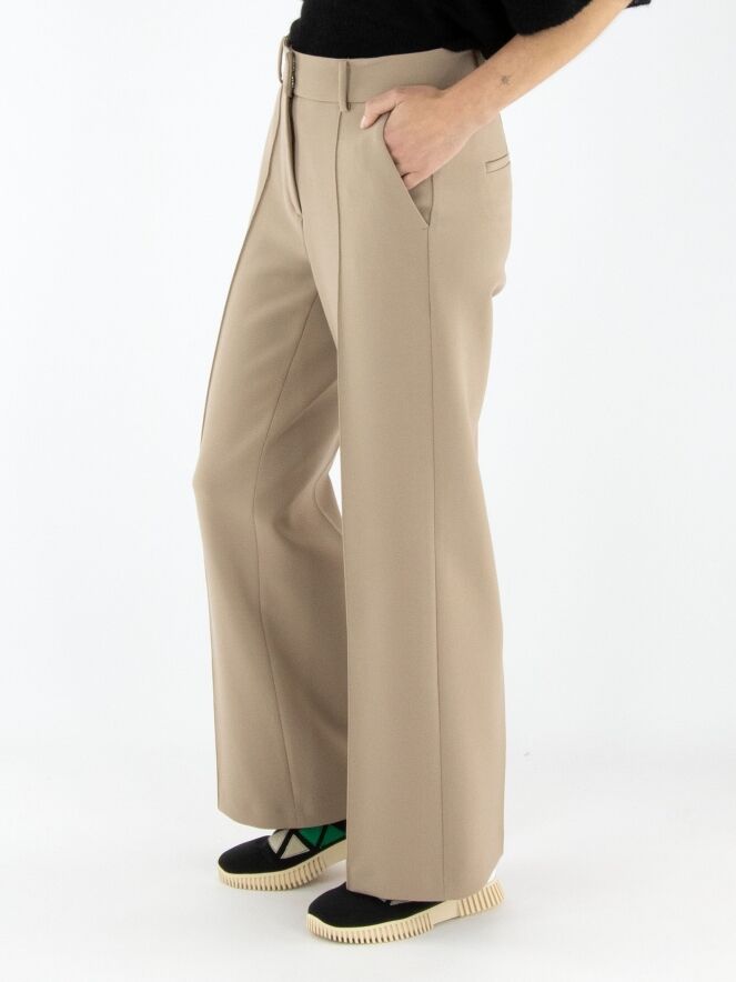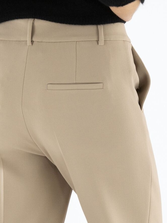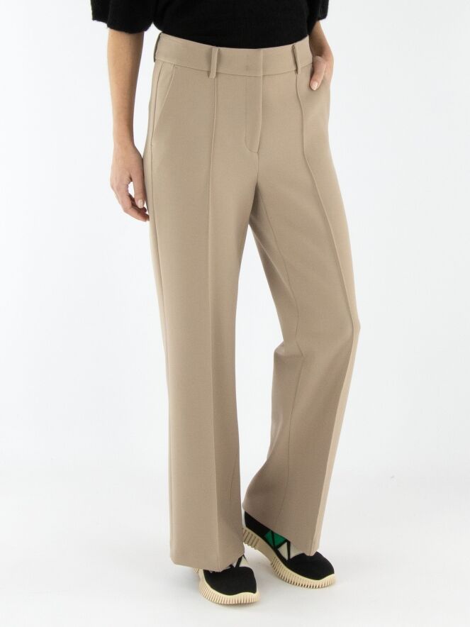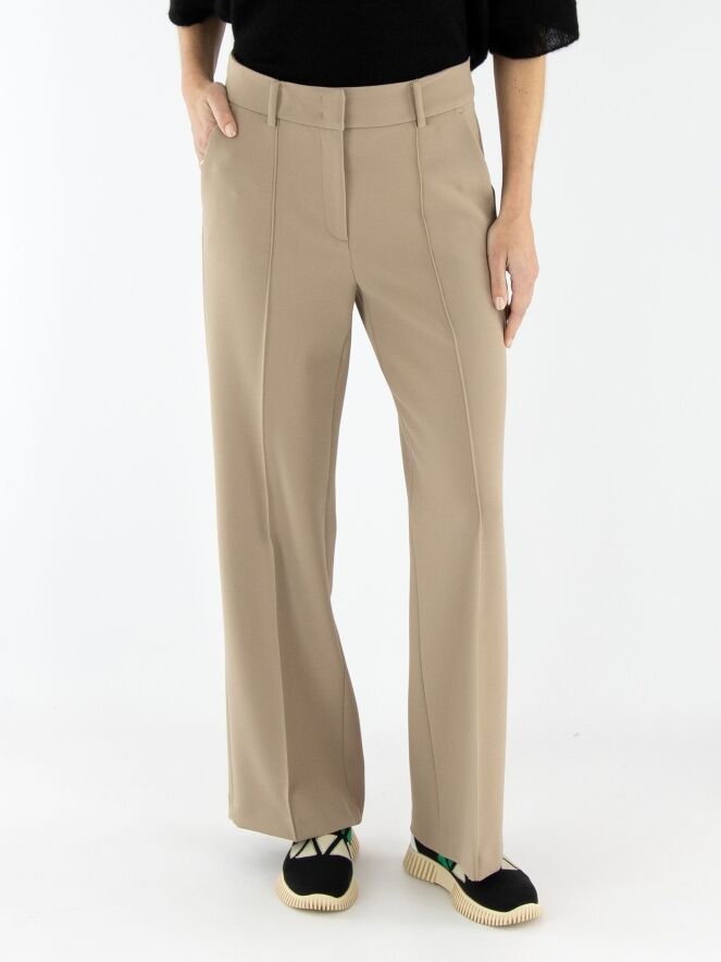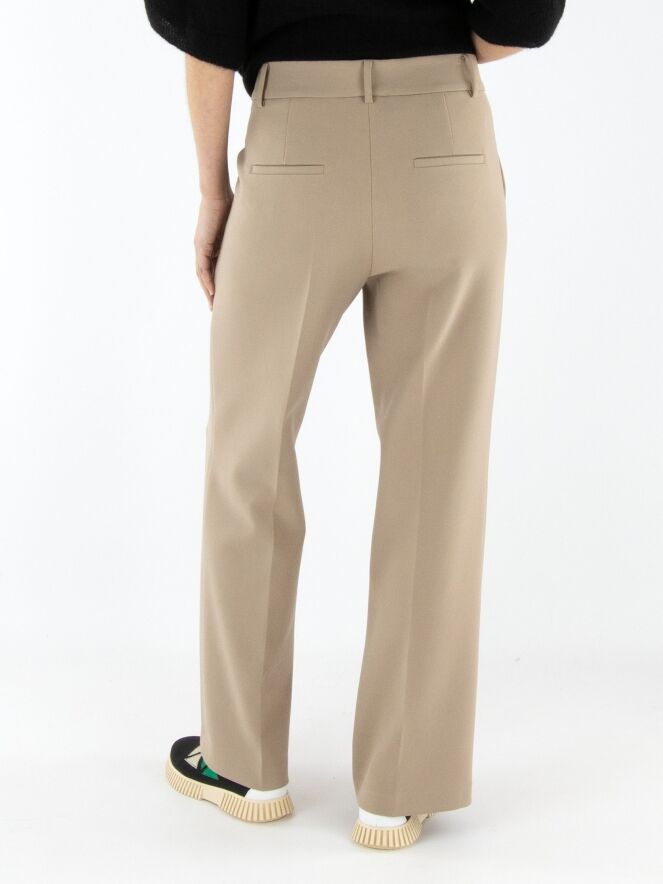 Een broek van Cambio in een volle taupe kleur. In het midden van de recht gesneden pijpen loopt een stiknaad. De broek heeft steekzakken en kan op 30 graden worden gewassen.