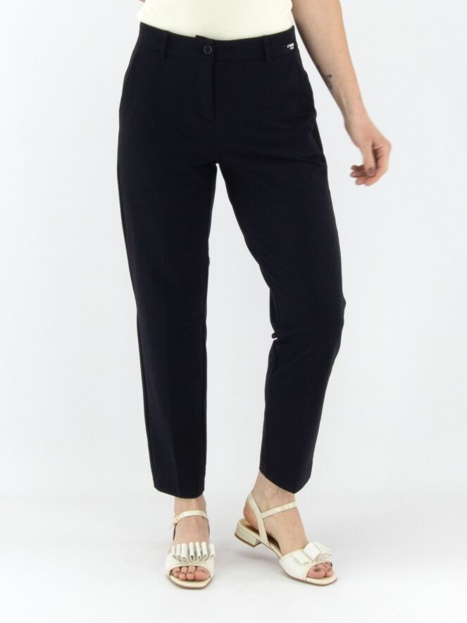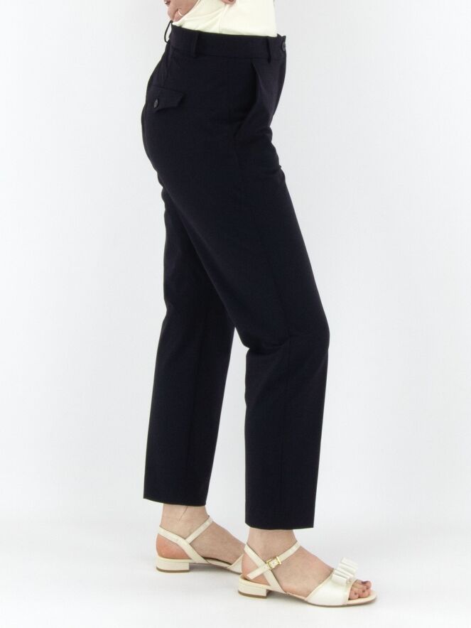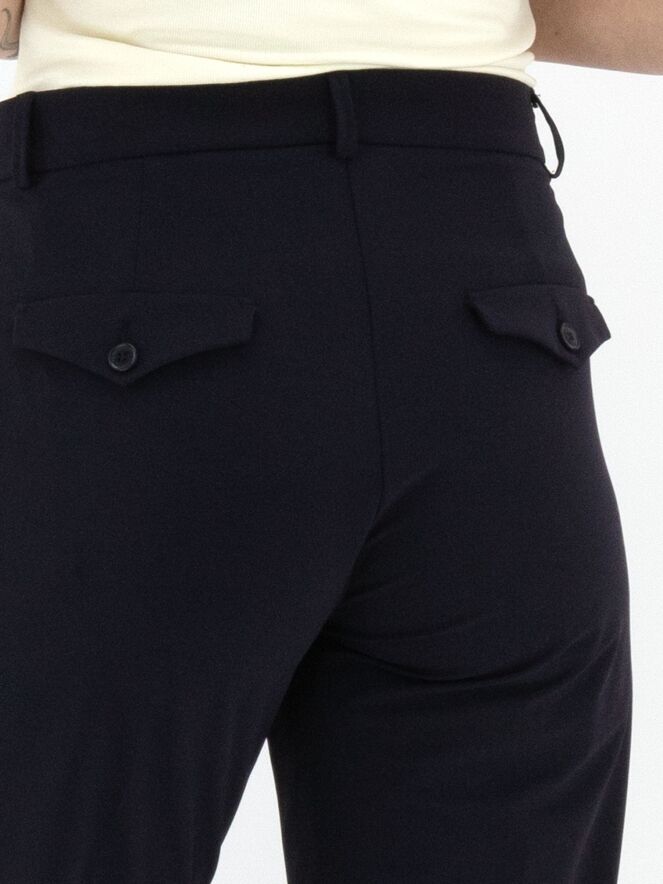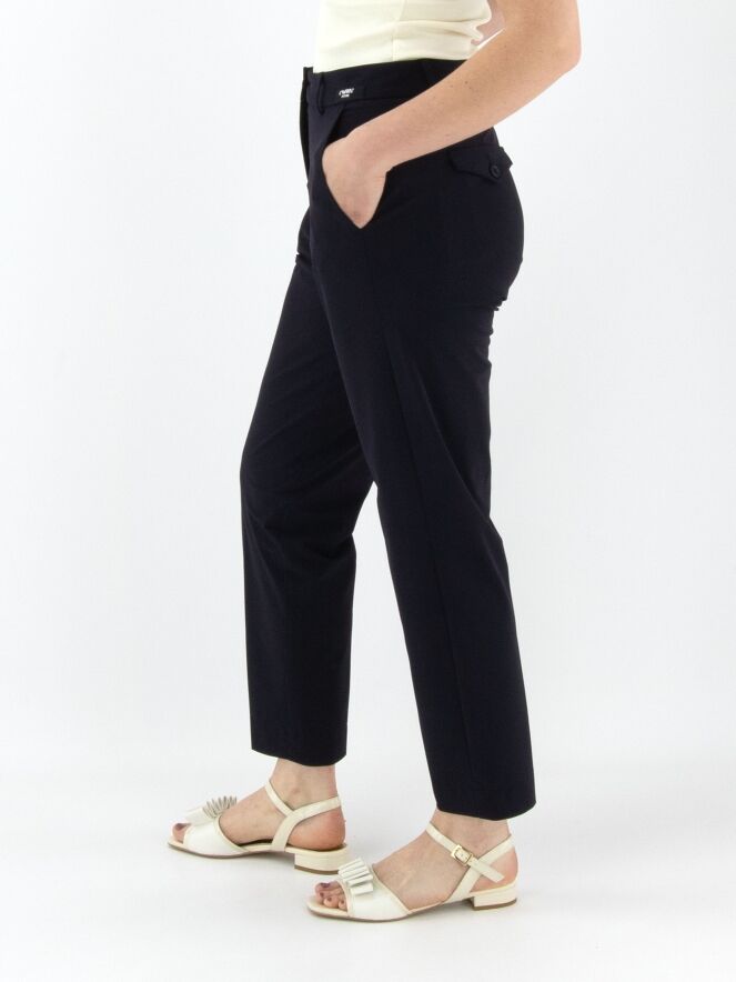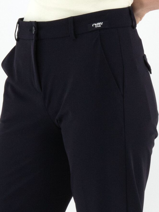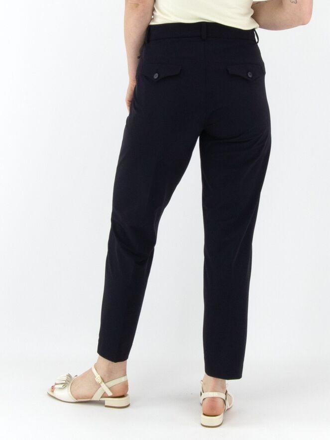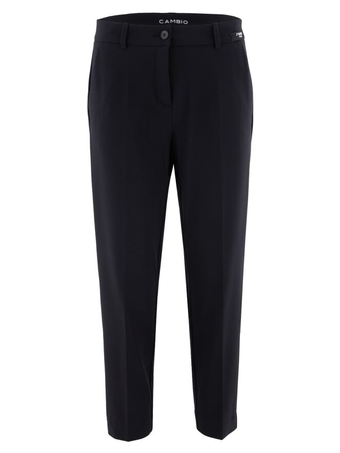 Een broek van Cambio in de kleur marineblauw. De broek heeft steekzakken en in het midden van de pijpen is zowel aan de voor- als achterkant een ingestreken plooi verwerkt. Deze broek mag op 30 graden worden gewassen.