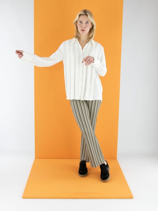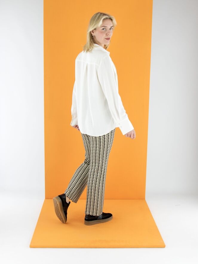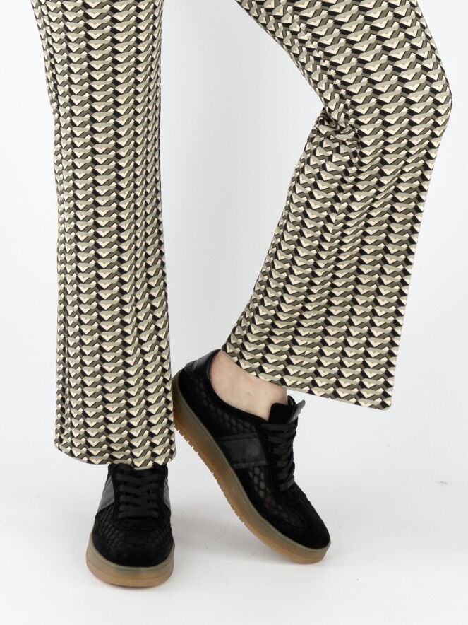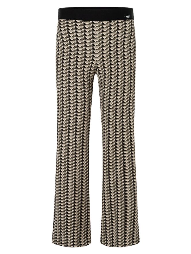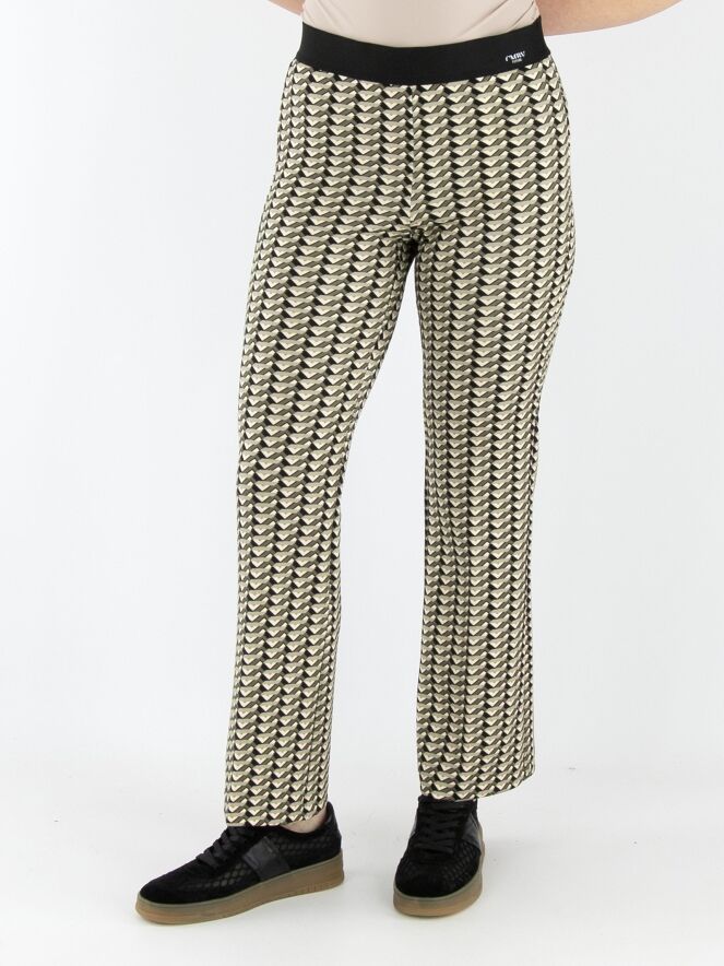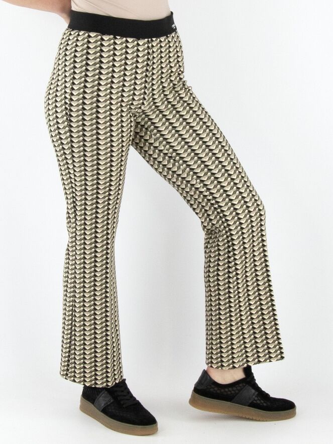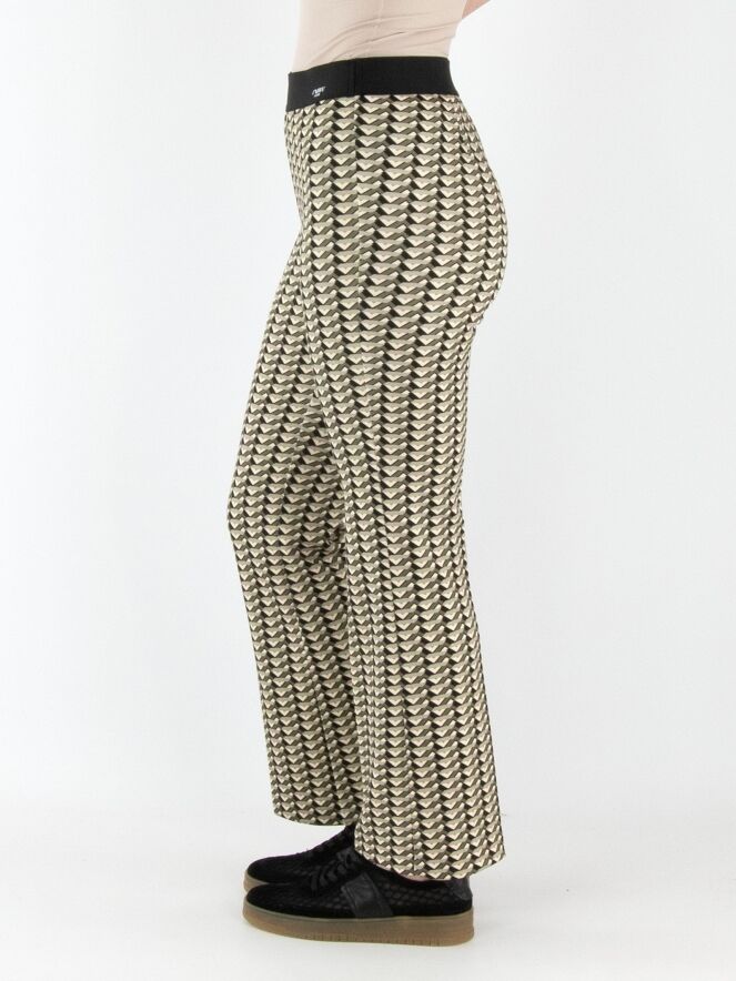 Een broek van Cambio met een grafische print in meerdere tinten olijfgroen. In de taille zit een zwarte elastische band. Deze broek kan op 30 graden worden gewassen.