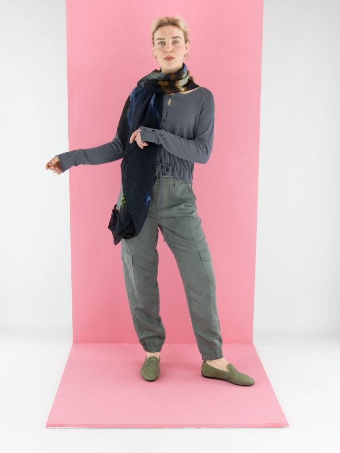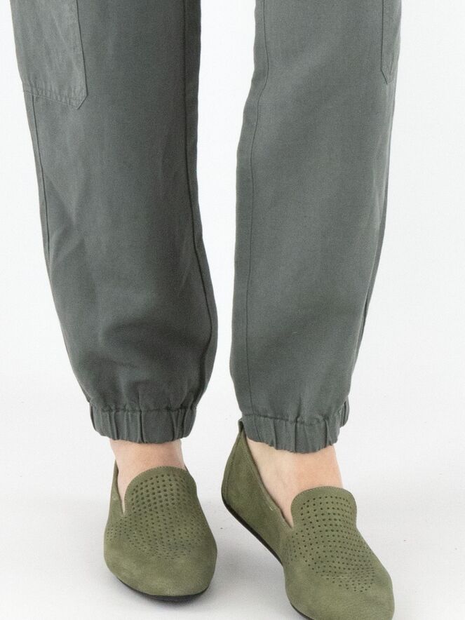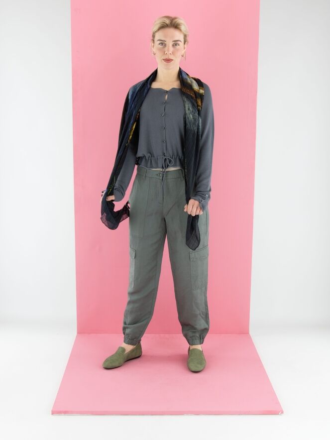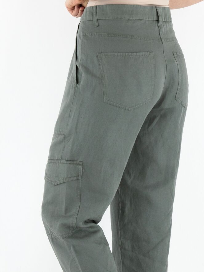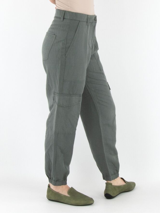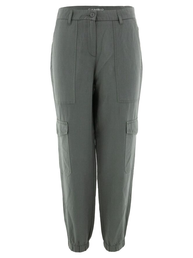 Een cargobroek van Cambio in een olijfgroene kleur. Aan de onderkant zit een fijn geplooide elastische boord. De broek heeft steekzakken en mag met de hand worden gewassen.
