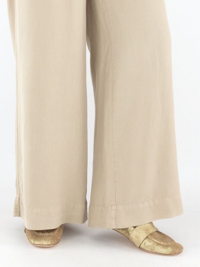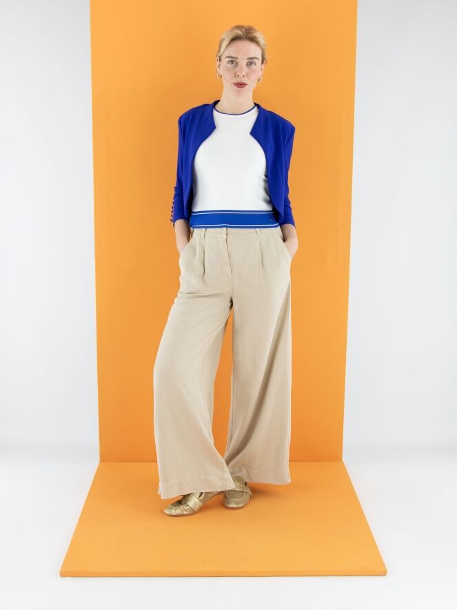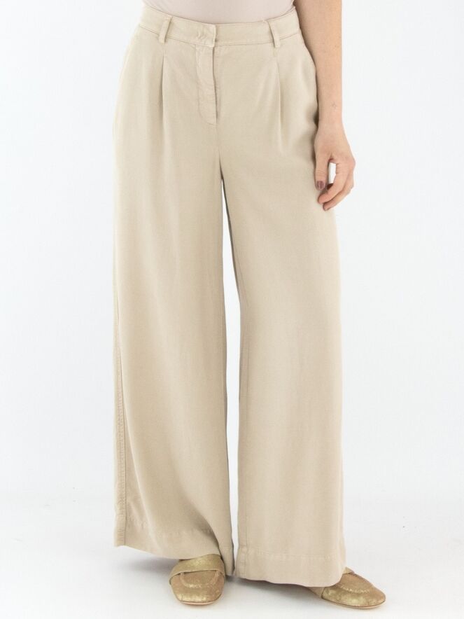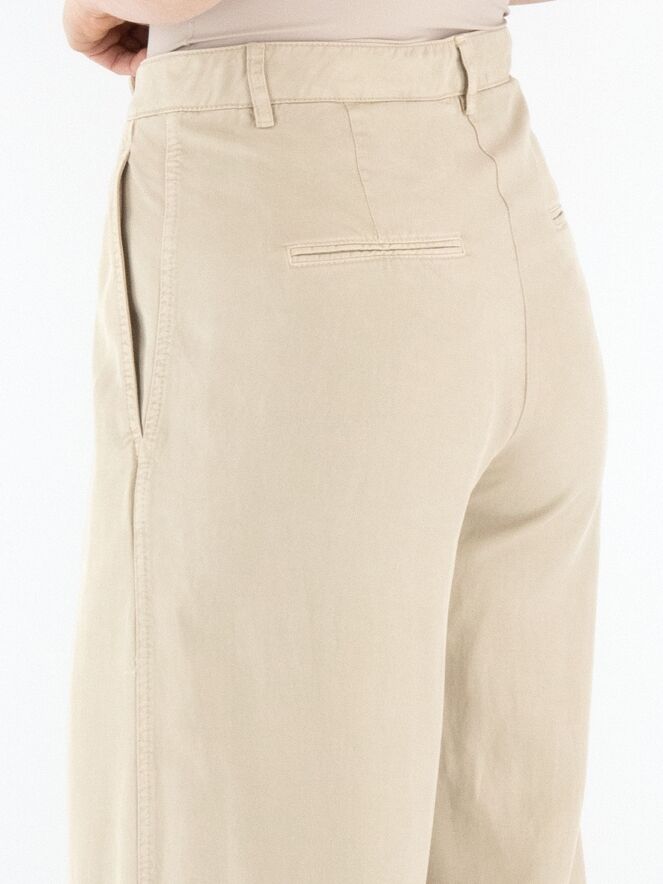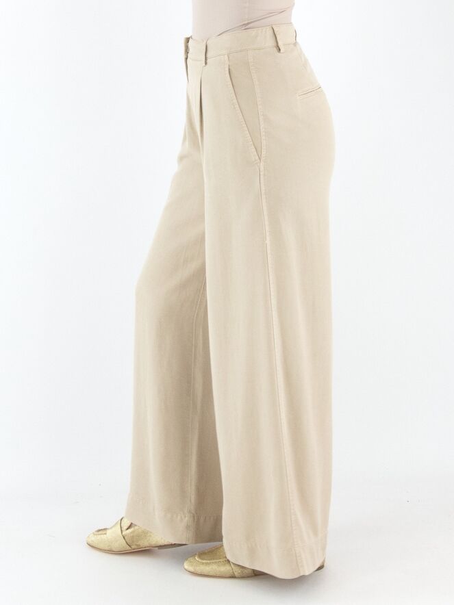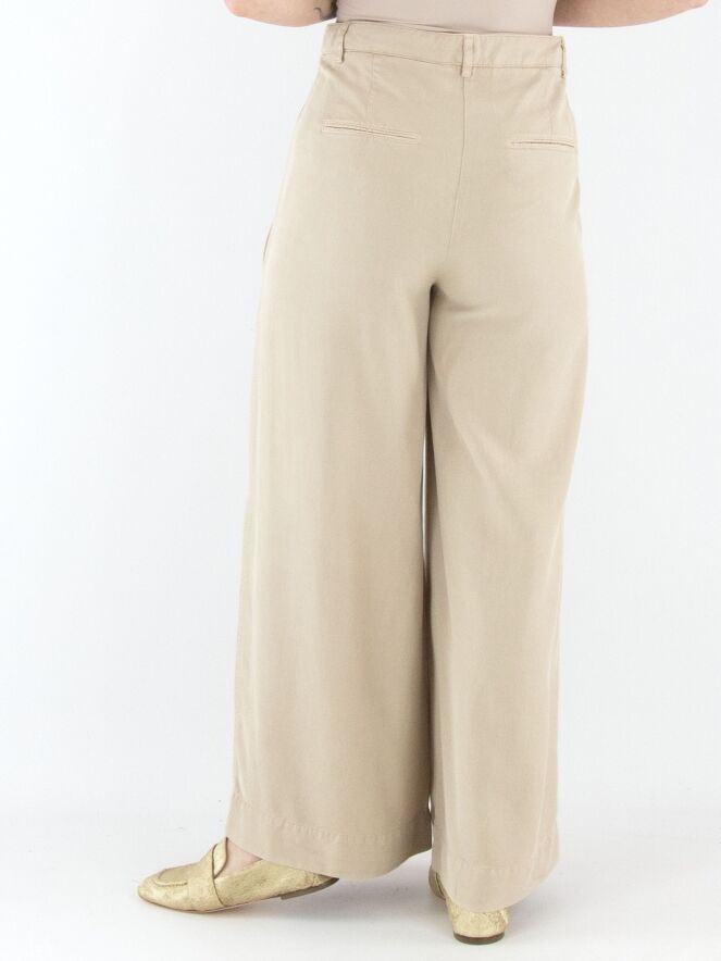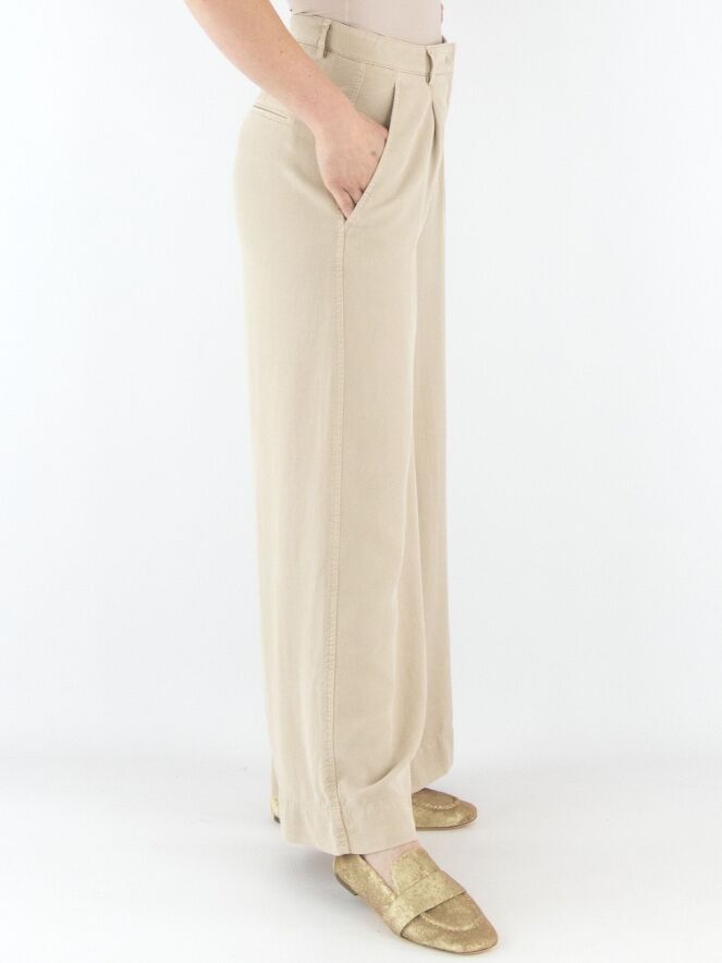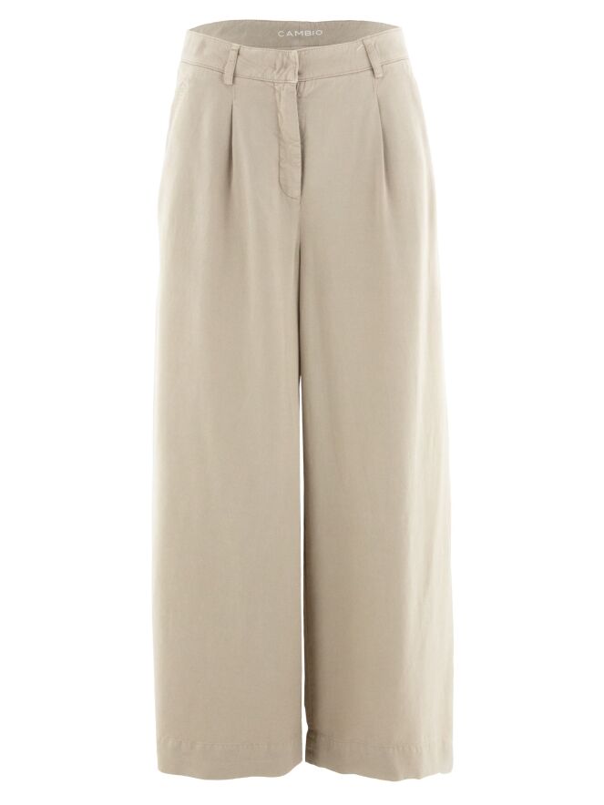 Een broek van Cambio in de kleur zand. De broek heeft wijde pijpen en steekzakken. Vanuit de taille zijn enkele bandplooien verwerkt. Deze broek mag op 30 graden worden gewassen.