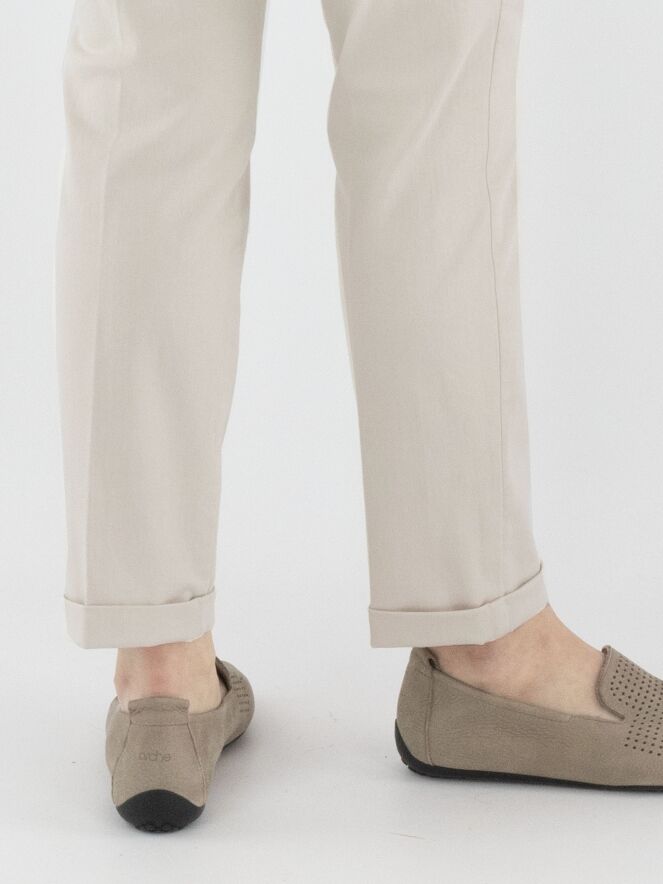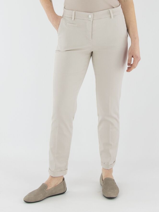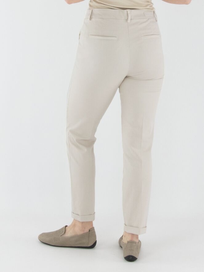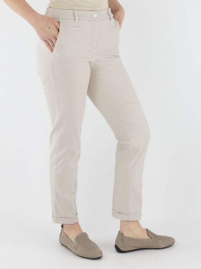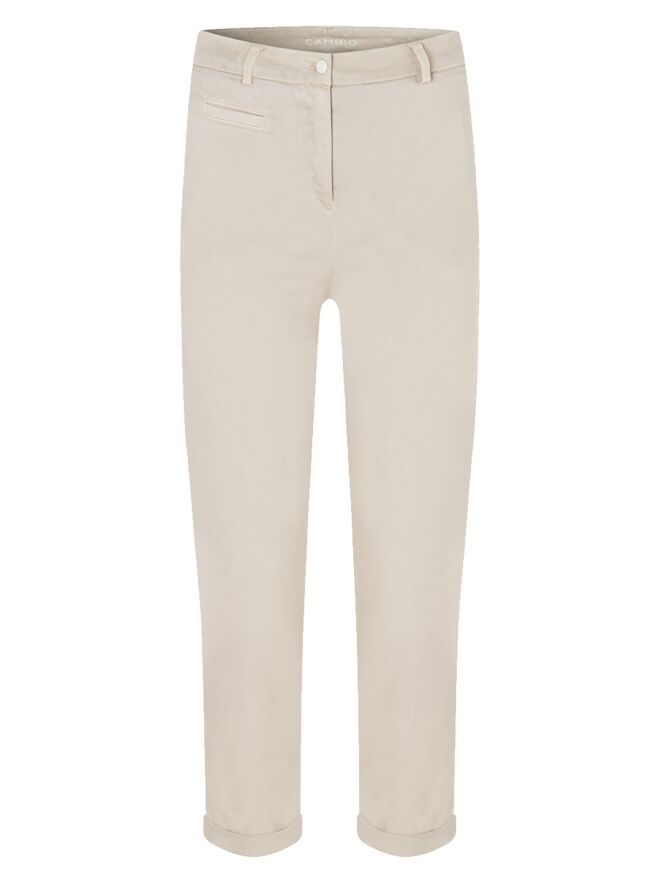 Een broek van Cambio in een licht zandkleur. De broek heeft steekzakken en aan de onderkant van de pijpen bevindt zich een korte omslag. Deze broek kan op 30 graden worden gewassen.