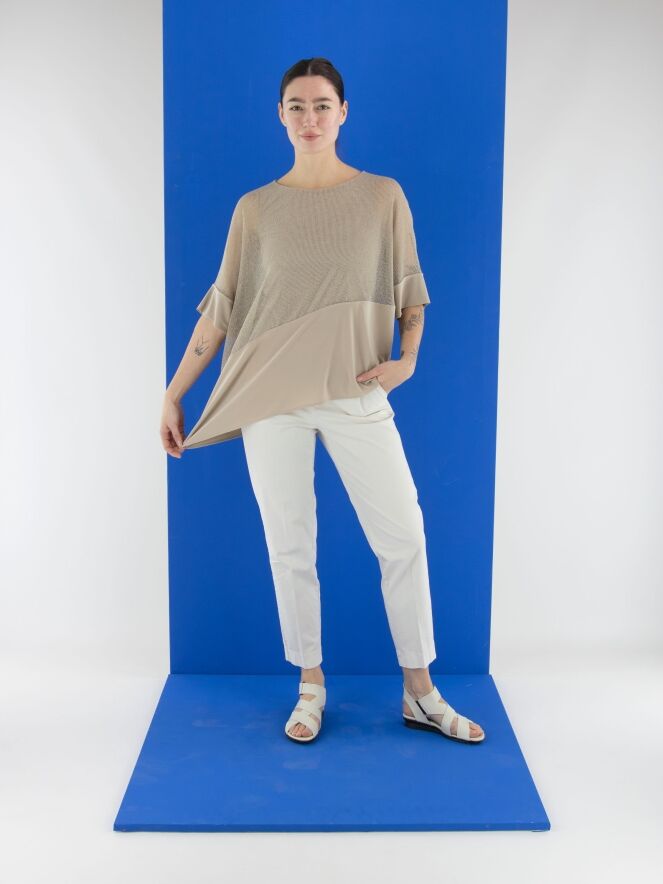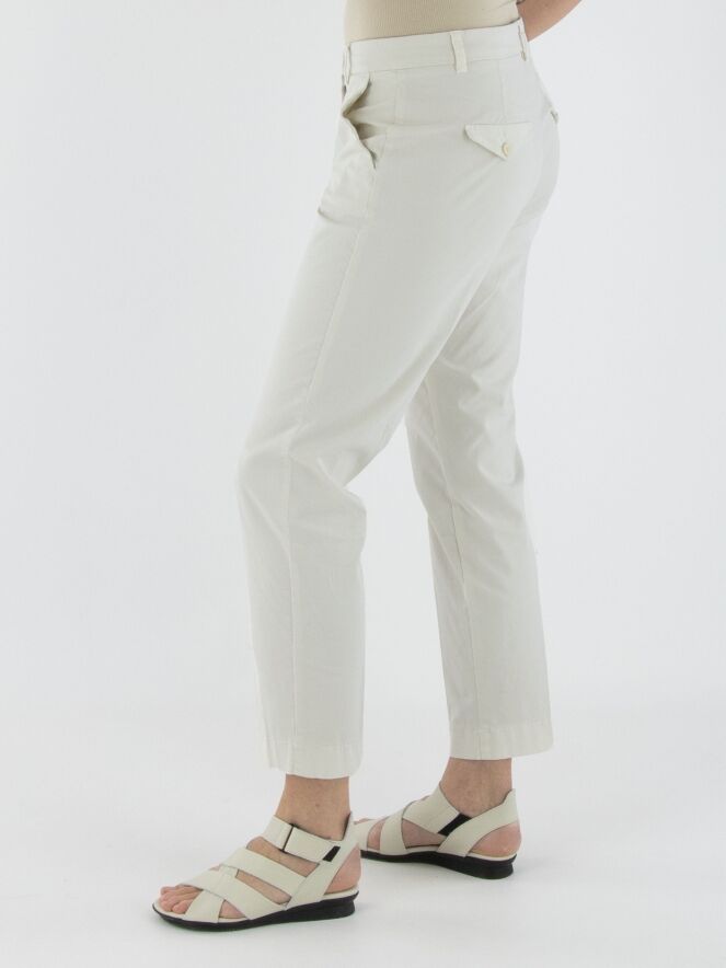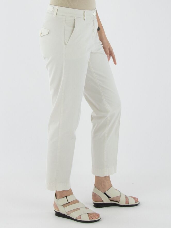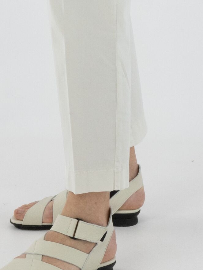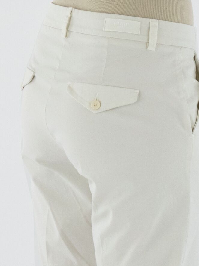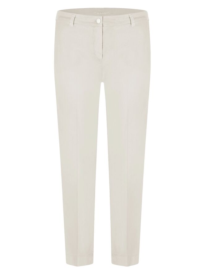 Een broek van Cambio in een roomwitte kleur. De broek heeft steekzakken en in het midden van de pijpen is zowel aan de voor- als achterkant een ingestreken plooi verwerkt. Deze broek kan op 30 graden worden gewassen.